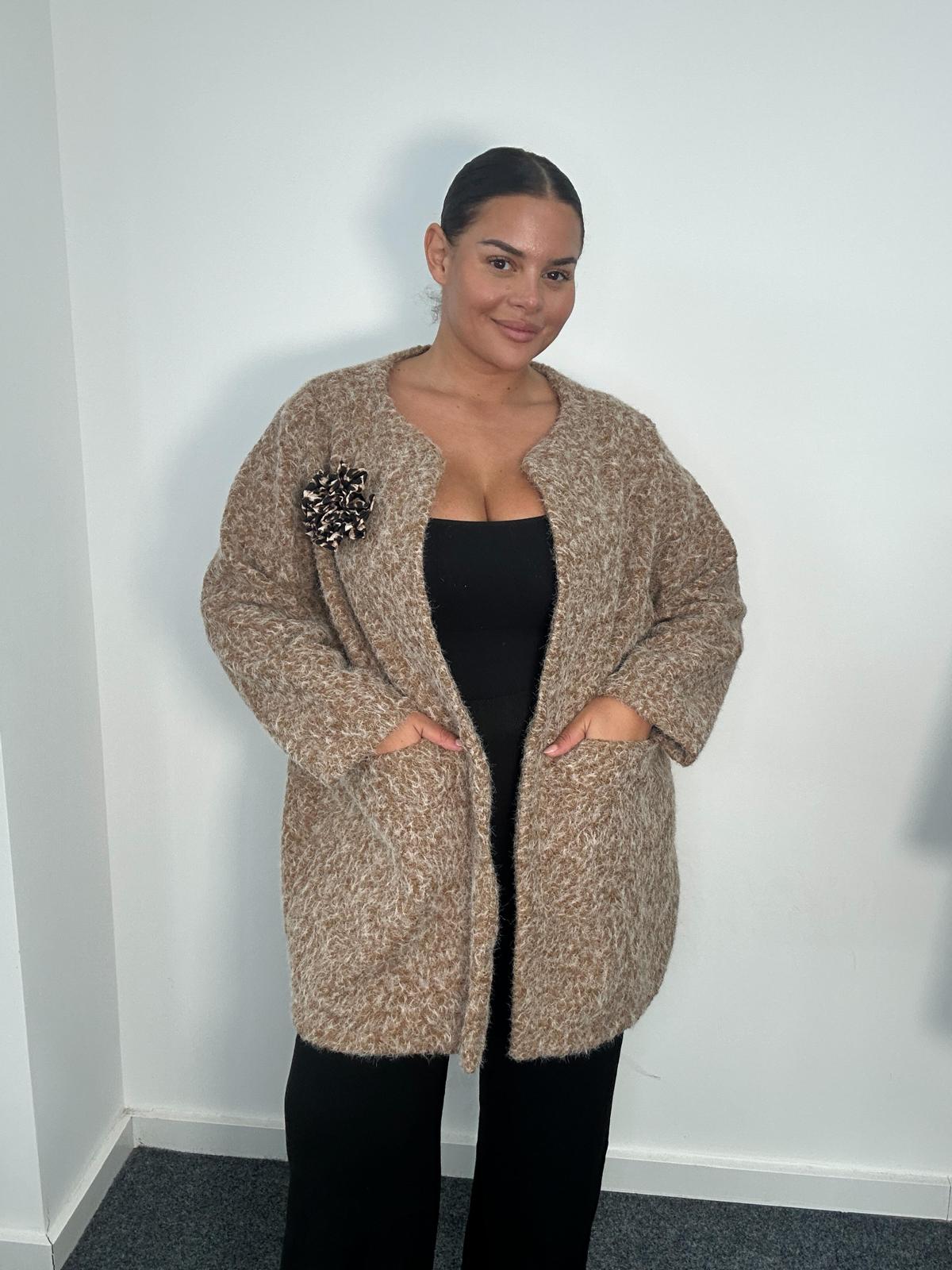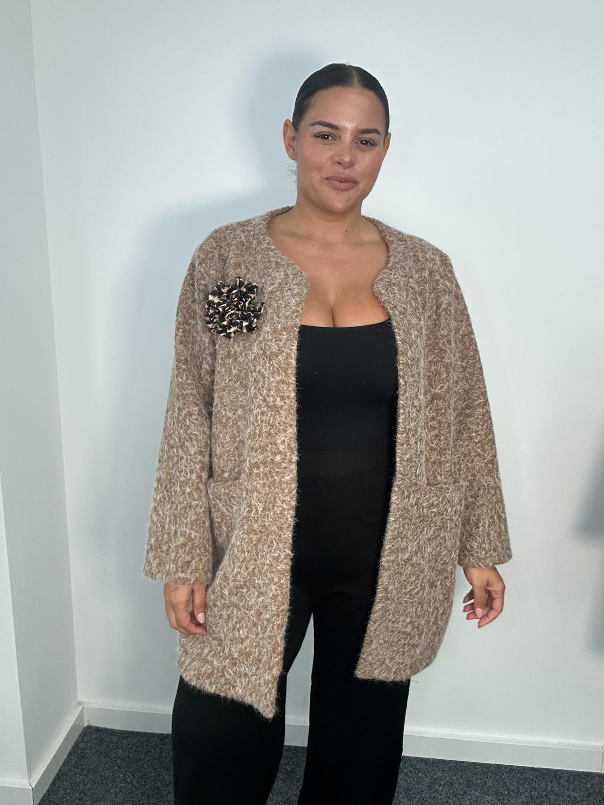 Plus Size Curve Camel Melange Textured Open Front Coat with Statement Brooch x 2, 3 & 5 Pack Options
