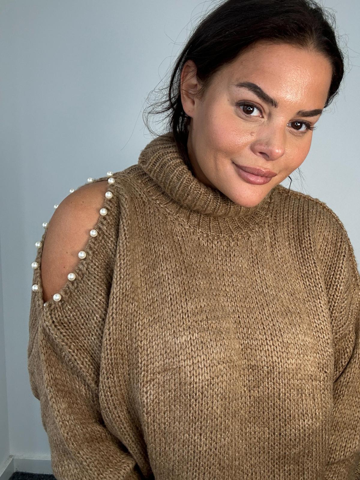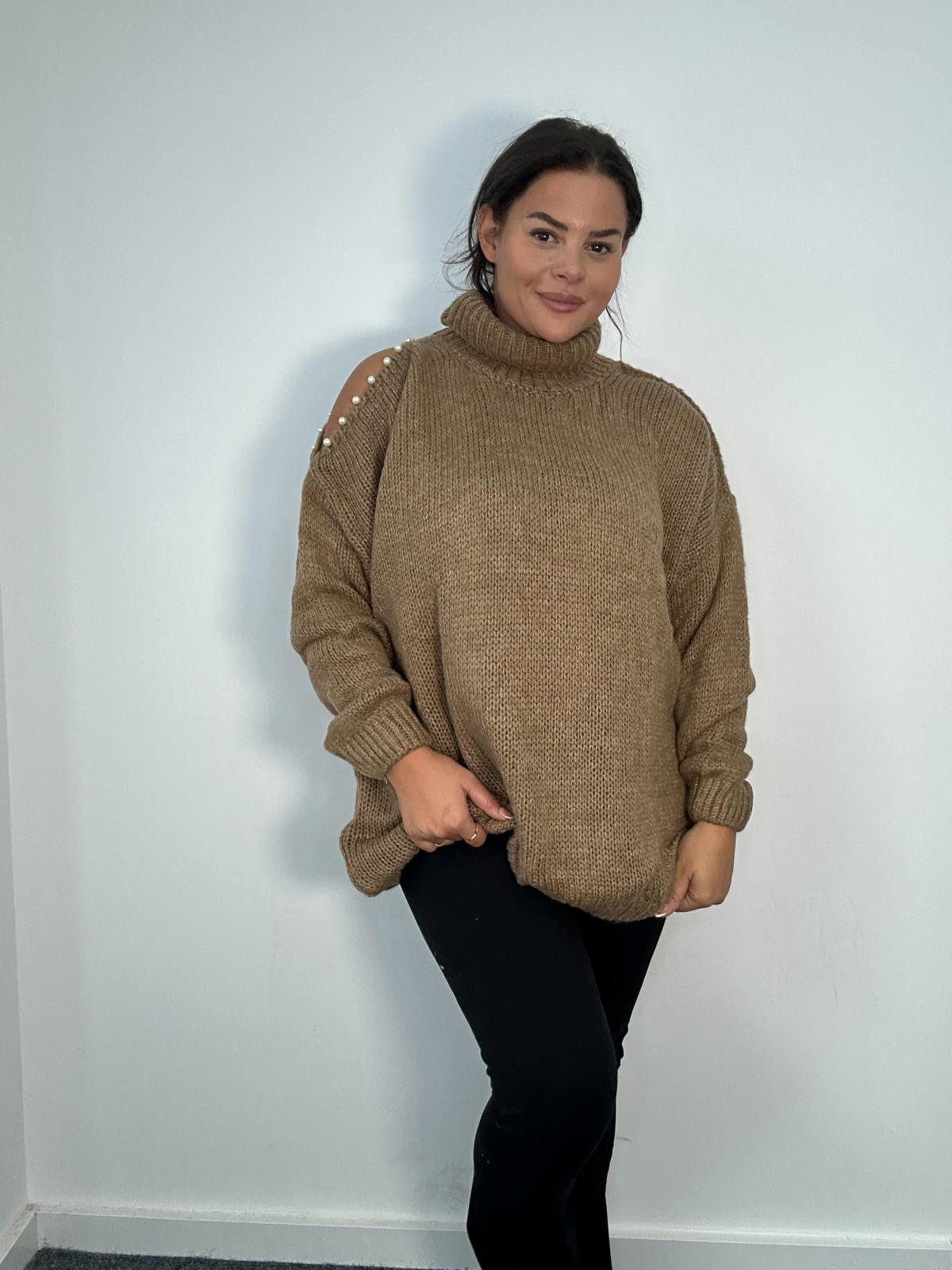 Add a touch of glamour to your wholesale knitwear collection with this plus size pearl embellished cold shoulder sweater. Featuring a cosy roll neck, relaxed oversized fit, and statement pearl detailing along cut-out shoulders, this jumper is the perfect balance of casual comfort and elevated style. Designed with curves in mind, it’s ideal for day-to-night looks during cooler seasons.