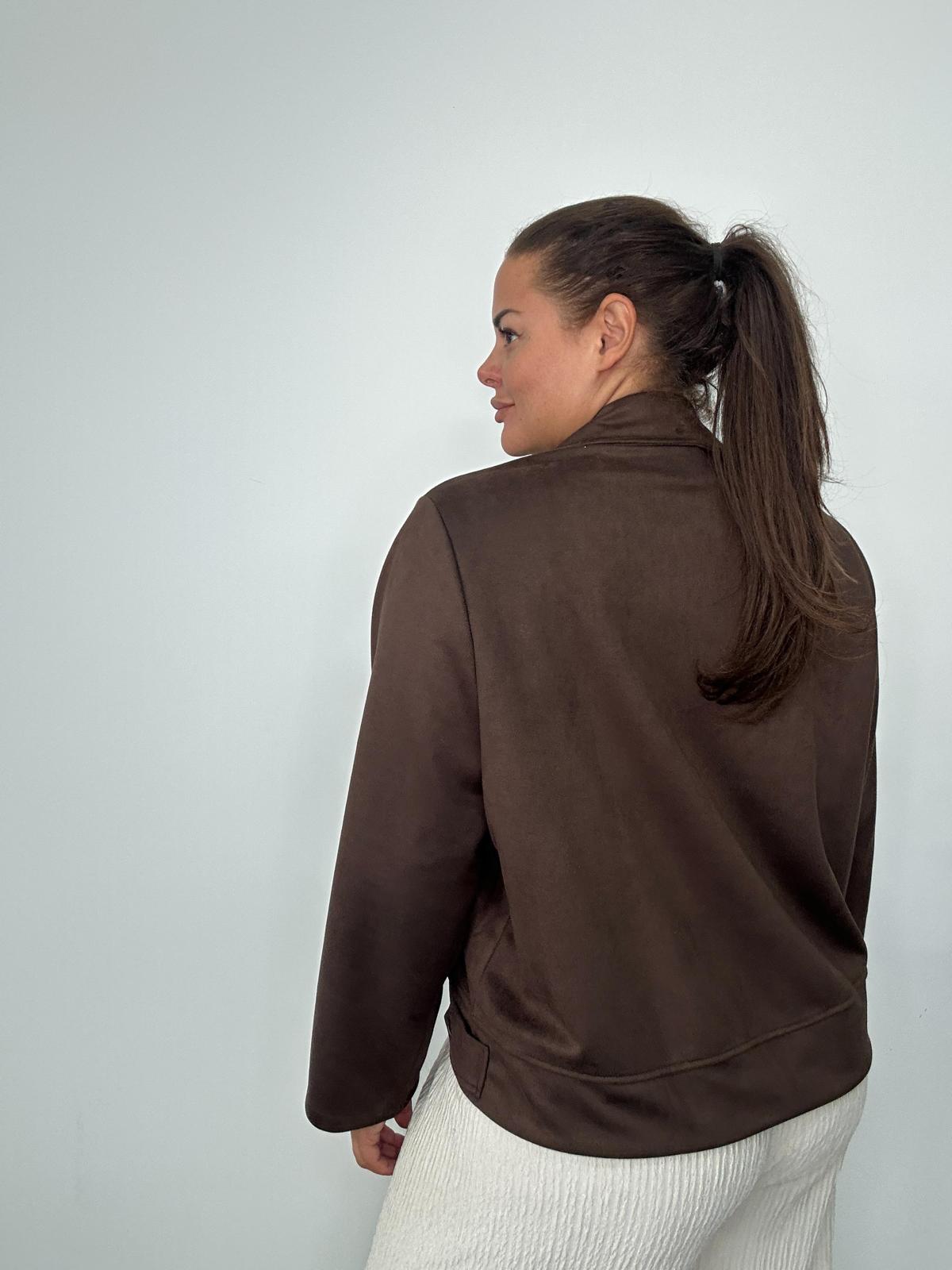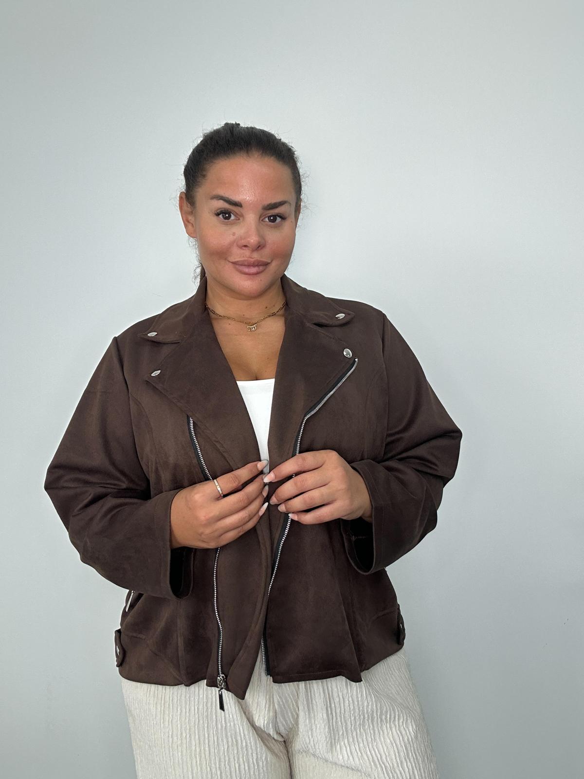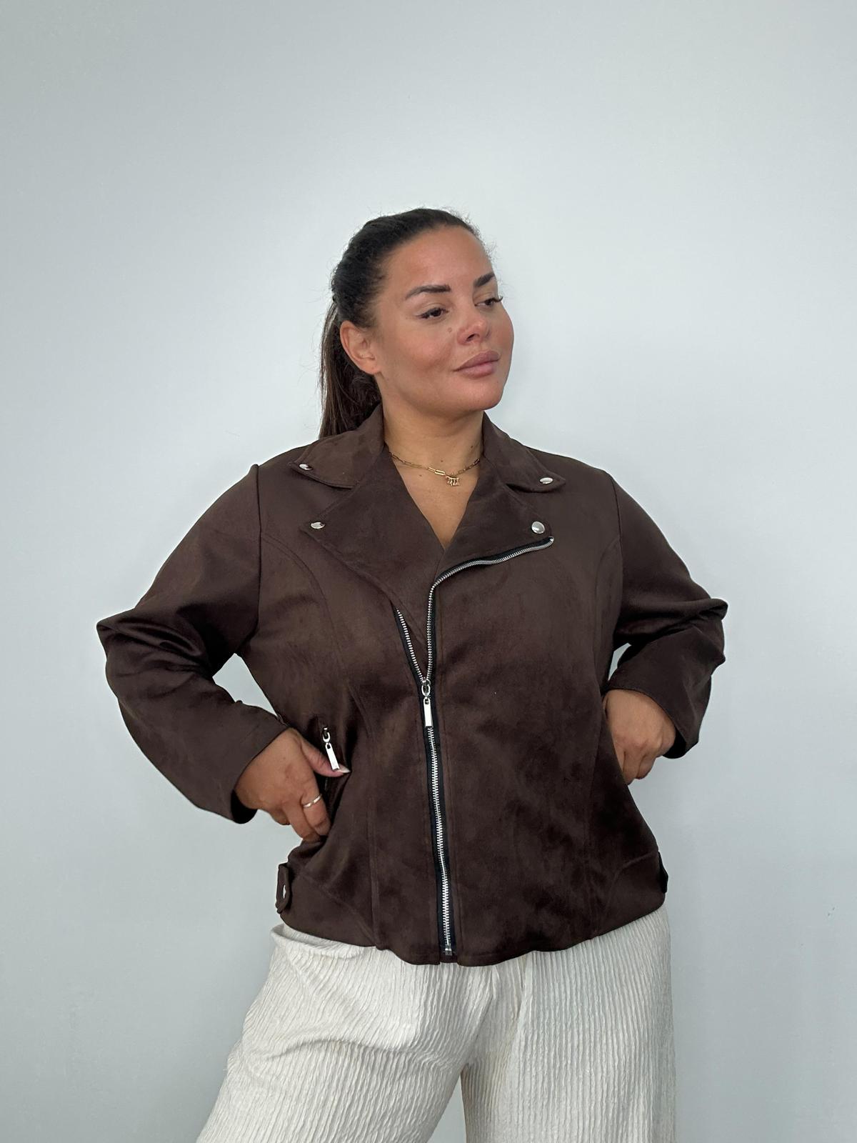 This Plus Size Chocolate Brown Faux Suede Biker Jacket is a timeless staple with a modern edge. Designed with an asymmetric zip fastening, silver tone hardware, and a sleek biker silhouette, it brings instant style to any outfit. Crafted in soft faux suede fabric, it offers both comfort and a luxe finish. A versatile outerwear option, this jacket is a must have wholesale choice for retailers catering to the plus-size market.
