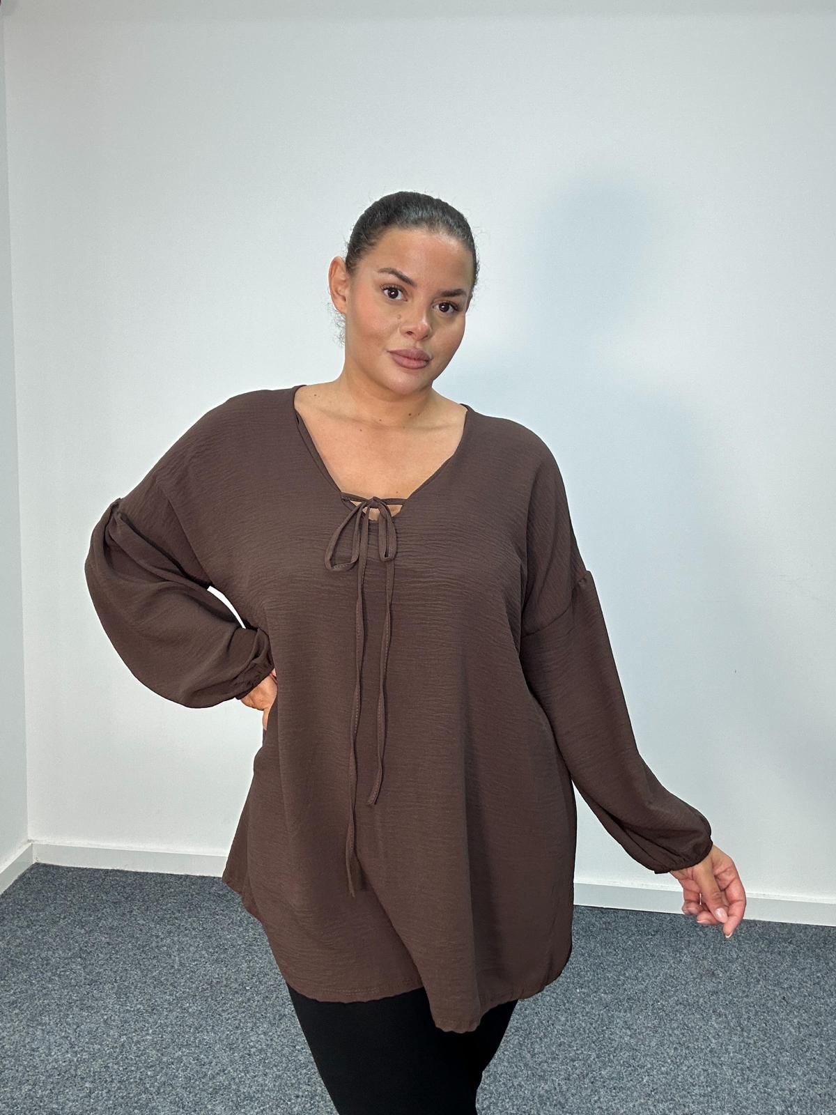 Elevate your everyday plus-size collection with this effortlessly chic tie-neck blouse. Crafted from a soft, lightweight fabric with a subtle texture, it drapes beautifully over curves for a flattering, comfortable fit. The v-neck with tie detail adds a feminine touch, while the balloon sleeves bring a relaxed yet polished silhouette. Perfect for transitioning from day to evening, this blouse pairs seamlessly with trousers, jeans, or skirts. A versatile staple for your curve-loving customers.