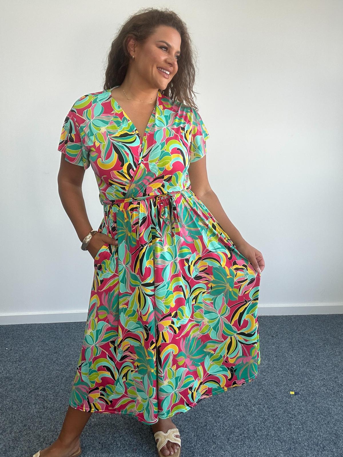 Brighten up your boutique’s plus size offering with this charming Tropical Swirl Print Midi Dress, designed for a flattering and flowy silhouette. Crafted in a breathable, lightweight fabric, this dress features a soft wrap-style front, flutter sleeves, and a gathered waist with a matching self-tie belt. The all-over floral print makes it a fresh pick for spring/summer collections, garden events, and everyday elegance.This curve-friendly dress is designed for both comfort and confidence, with functional side pockets for added practicality.