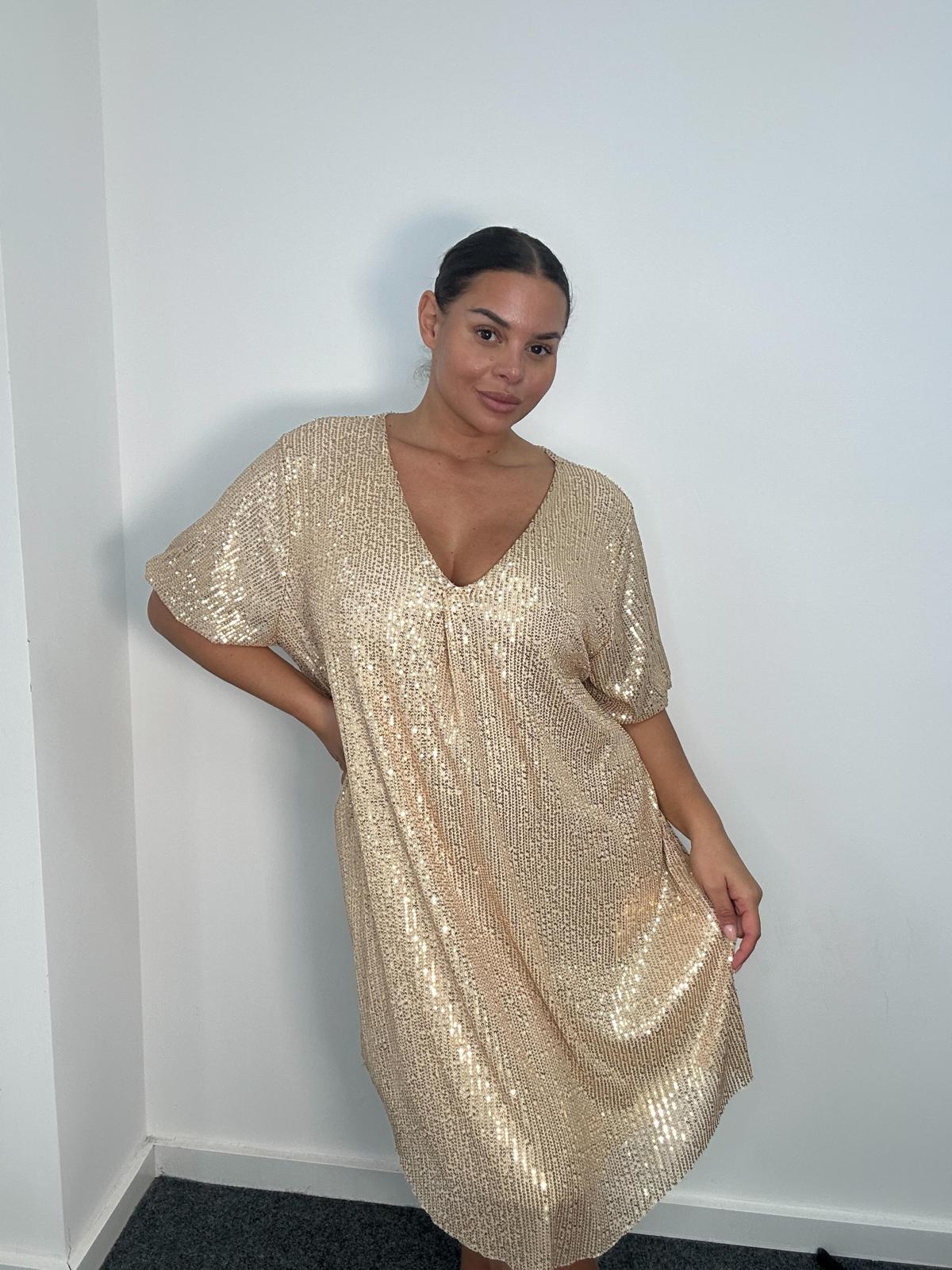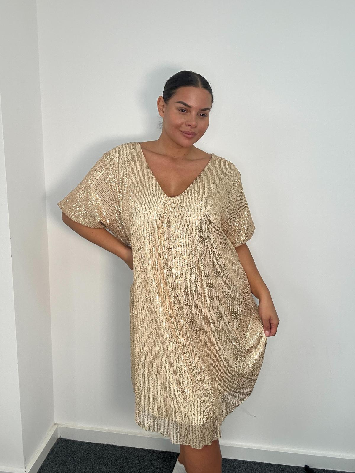 Make every occasion shine with our Plus Size Sequin Shift Dress, the perfect blend of glamour and comfort for curvy women. This dazzling dress features all-over gold sequins, a flattering v-neck, and short sleeves for a chic yet relaxed fit. The loose shift silhouette ensures effortless movement and confidence, ideal for festive parties, evening events, or New Year celebrations. Designed with boutiques and curve-focused retailers in mind, this piece is a must-have addition to any wholesale partywear or occasionwear collection.