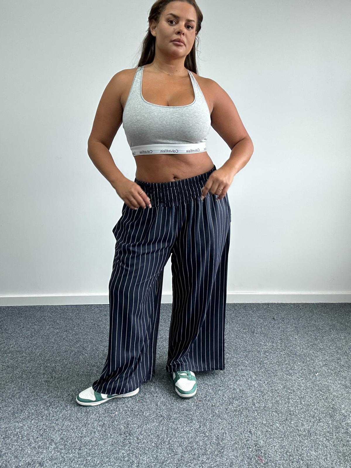 Make a statement in these effortlessly stylish wide-leg trousers designed for curves. Featuring a fine vertical pinstripes, these trousers are made from a soft, flowy fabric with an elasticated high-rise waistband for maximum comfort. The wide-leg silhouette offers ease of movement and a flattering drape, perfect for casual looks, lounge edits, or sporty streetwear when styled with trainers or crop tops.