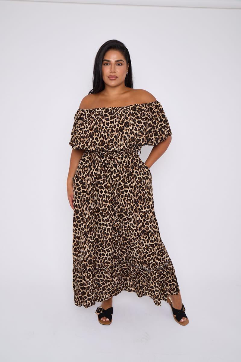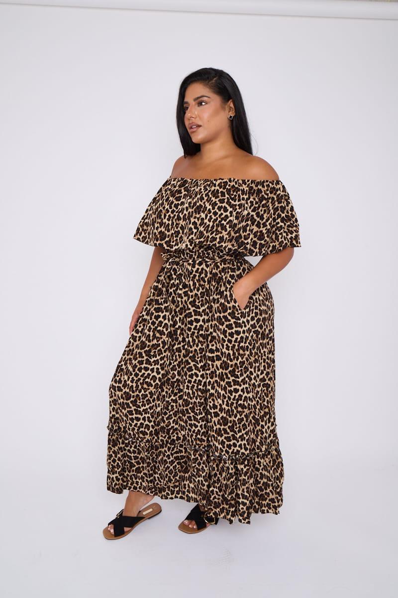Turn heads and embrace your curves in this stunning Curve Plus Size off shoulder Leopard Print Maxi Dress. Featuring a bold and trendy leopard print, this dress is designed to flatter your figure with its off-shoulder neckline and cinched waist with a tie belt. The flowing maxi length adds effortless elegance, making it perfect for casual outings, brunch dates, or evening events. Pair it with your favorite sandals or heels for a chic and confident look.
