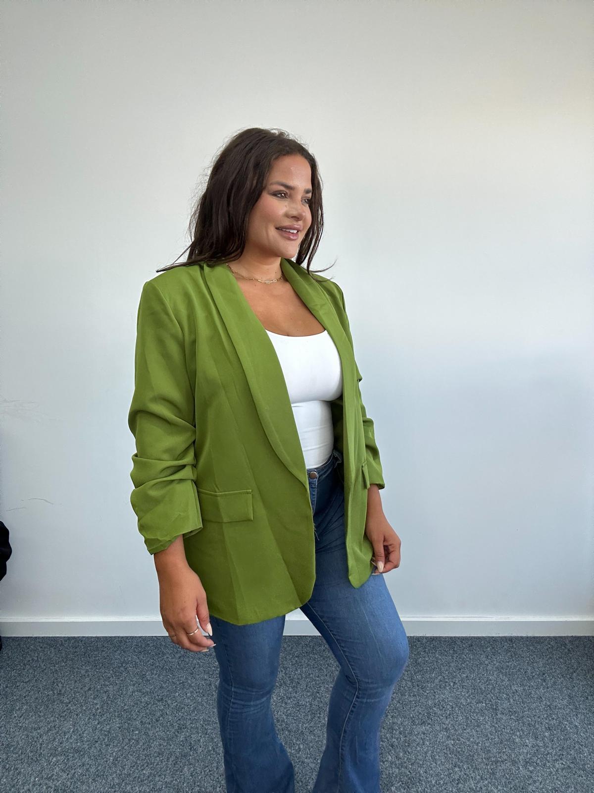 Elevate your wholesale fashion collection with this chic plus size olive blazer. Designed with a flattering open front, ruched sleeves, and a relaxed tailored fit, this versatile piece transitions seamlessly from office wear to smart-casual styling. A must-have for curve fashion retailers.