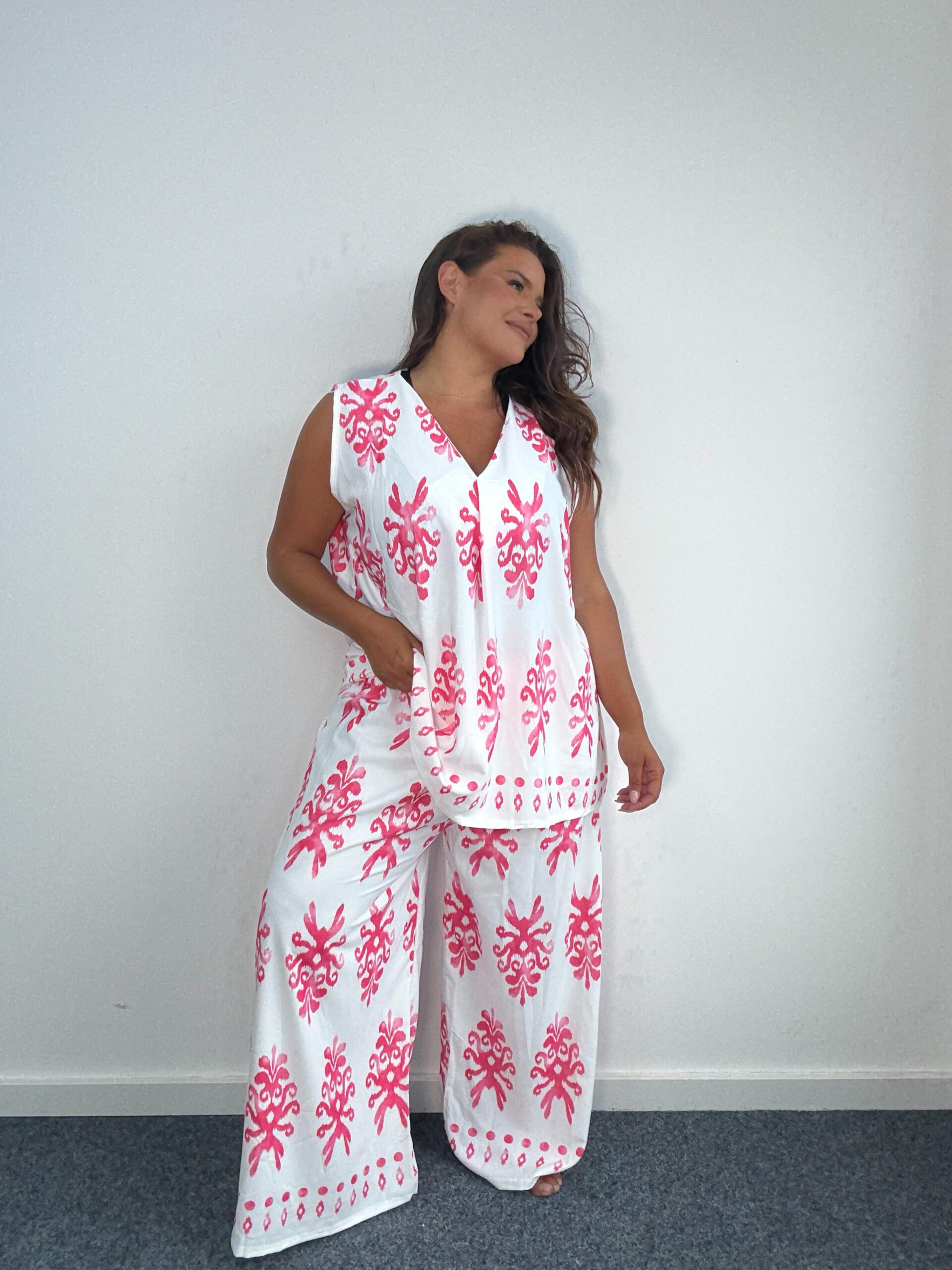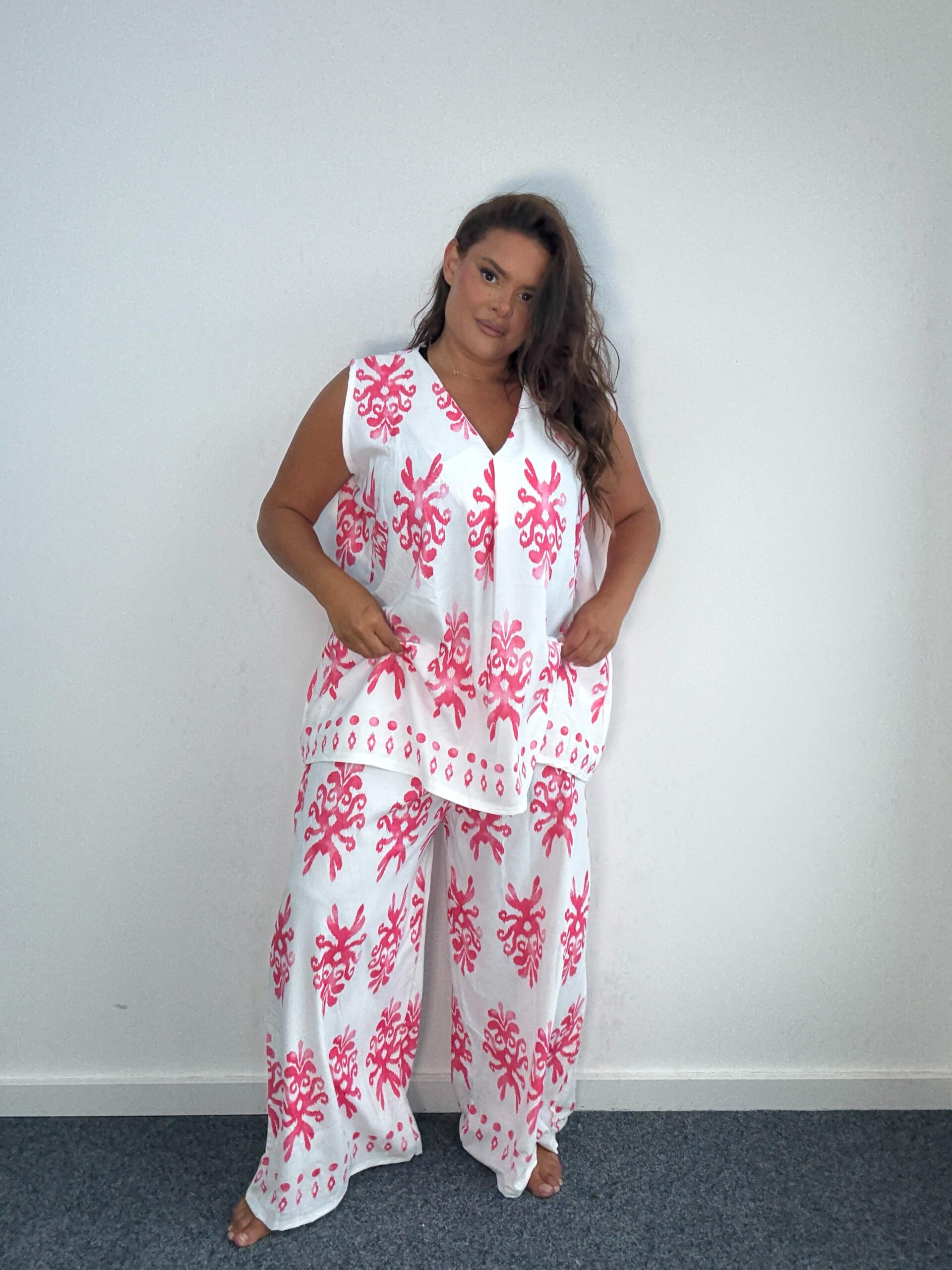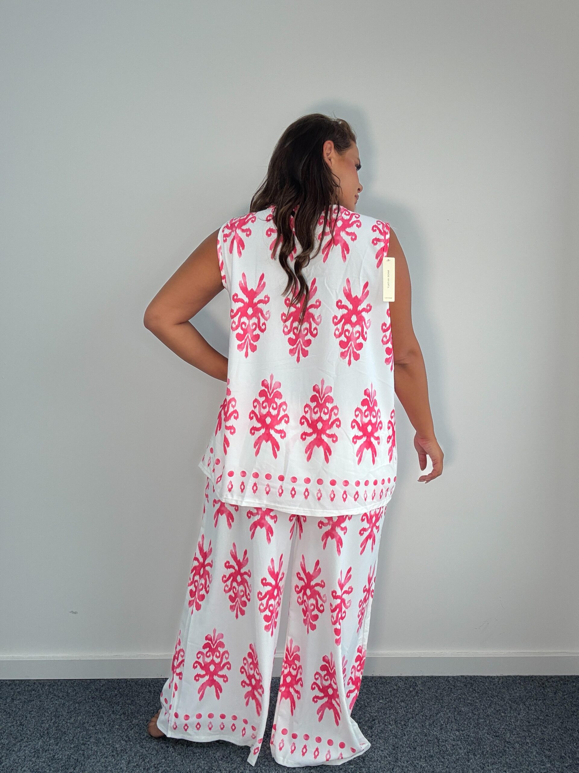 Step into effortless summer style with this bold and breezy Curve Tribal Print Co-Ord Set. Featuring a relaxed-fit sleeveless top and wide-leg trousers, both in a striking tribal-inspired print, this set offers maximum comfort with maximum impact. Perfect for day-to-night styling, just add sandals and statement accessories.