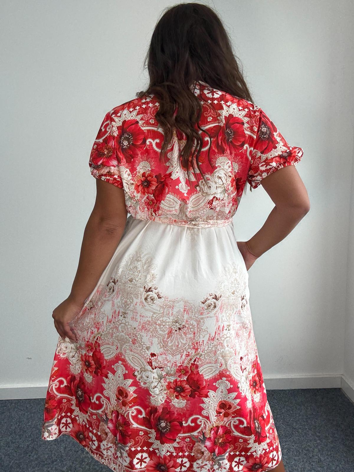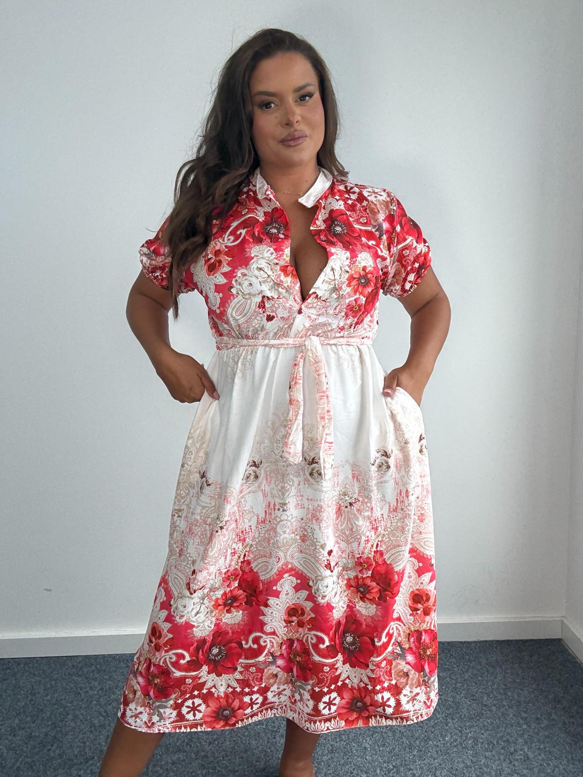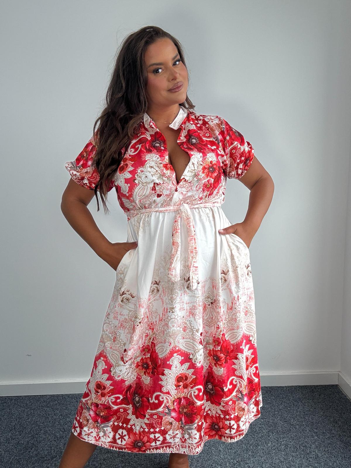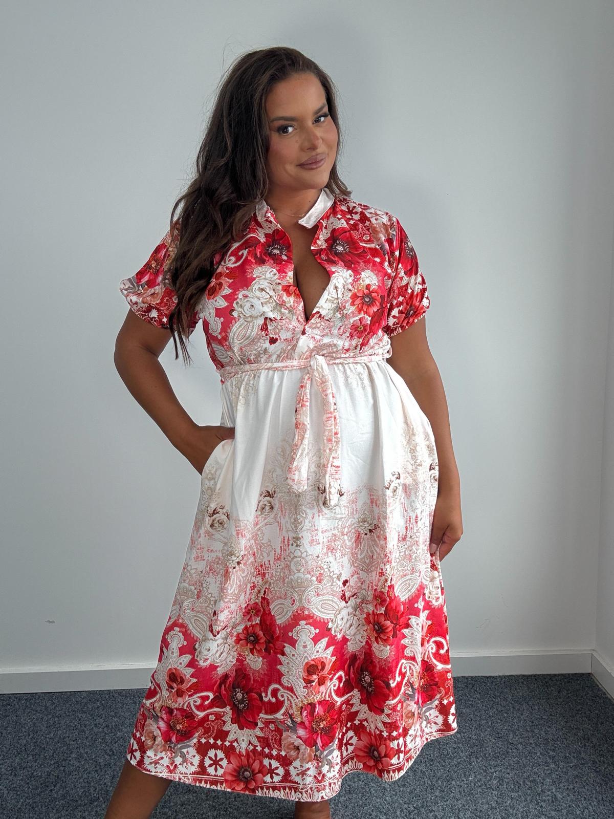 Plus Size Curve Red Floral Border Print Belted Shirt Midi Dress x 5