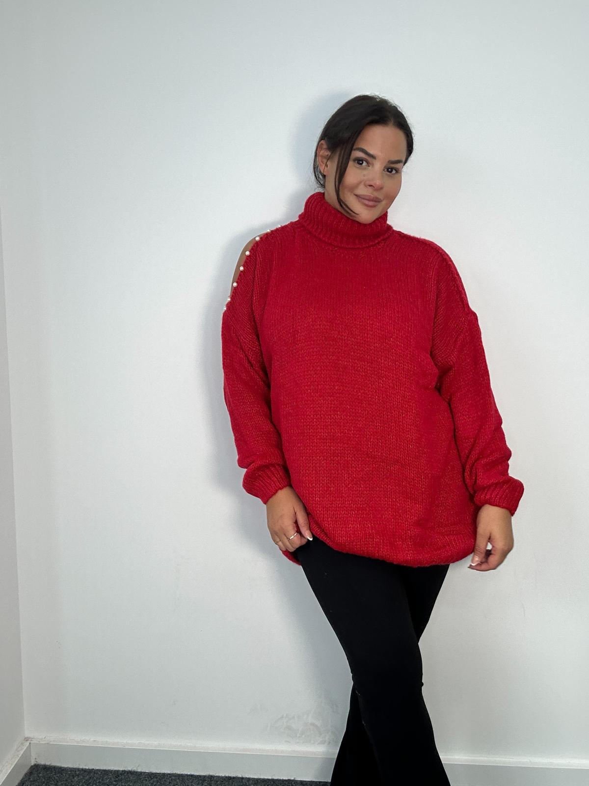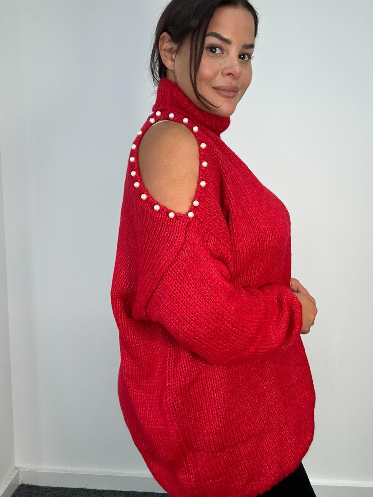 Plus Size Curve Red Pearl Embellished Cold Shoulder Knit Sweater x 2, 3 & 5 Pack Options