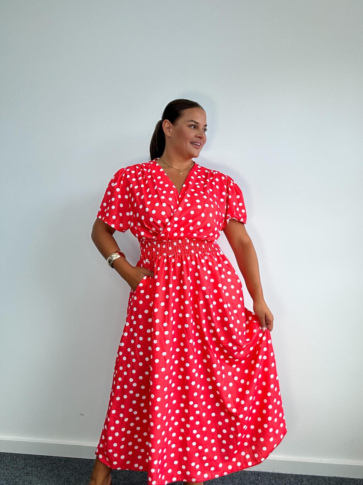 Plus Size Curve Red Polka Dot Shirred Waist Midi Dress with Pockets x 5