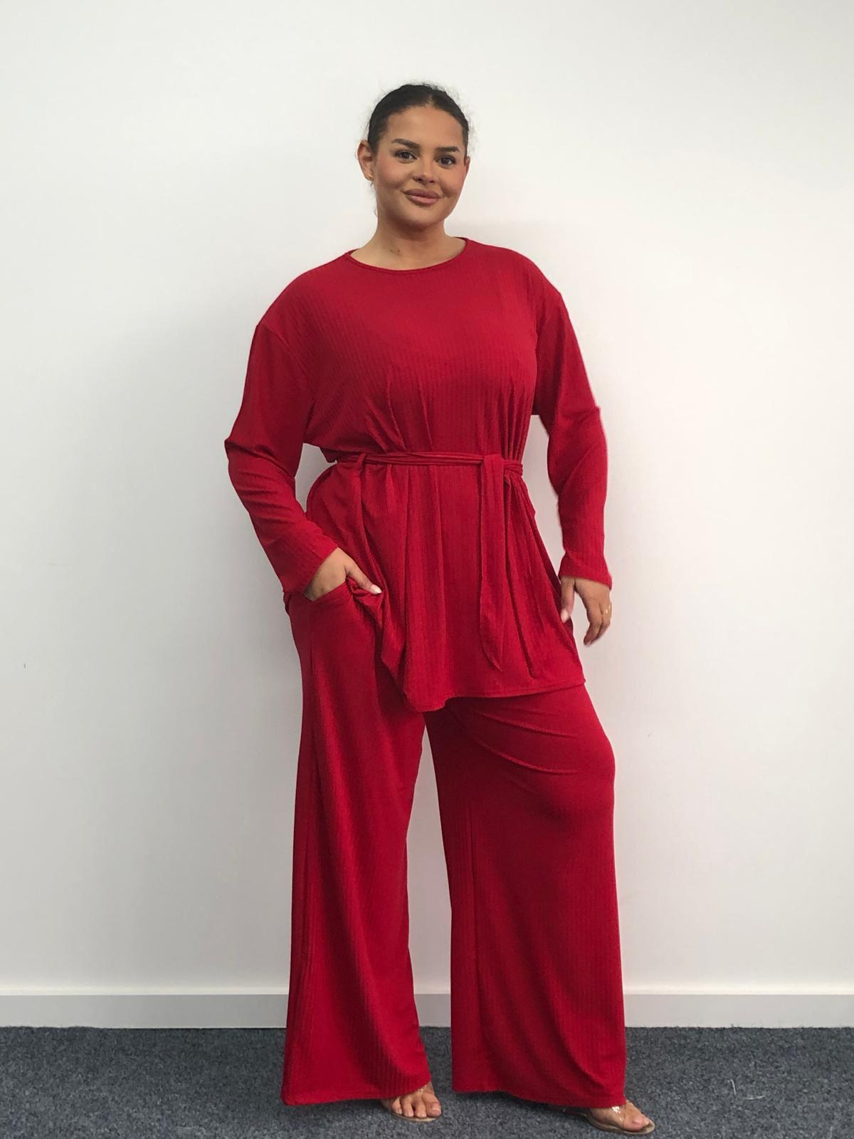 This Plus Size Curve Red Ribbed Lounge Set combines comfort and confidence in one striking look. Designed with soft ribbed fabric, this relaxed-fit co-ord set includes a long-sleeve top with a matching belt for a flattering waistline and wide-leg trousers for effortless movement. Perfect for casual days, travel wear, or chic loungewear collections.
