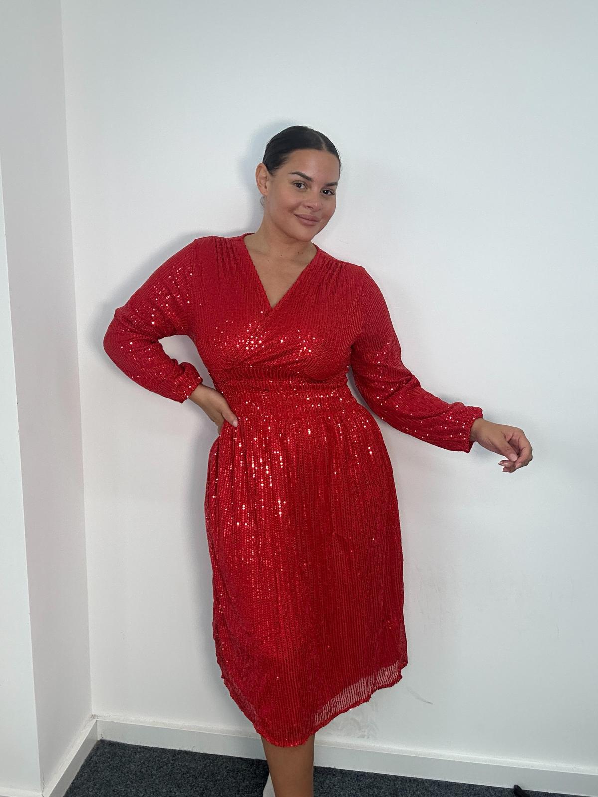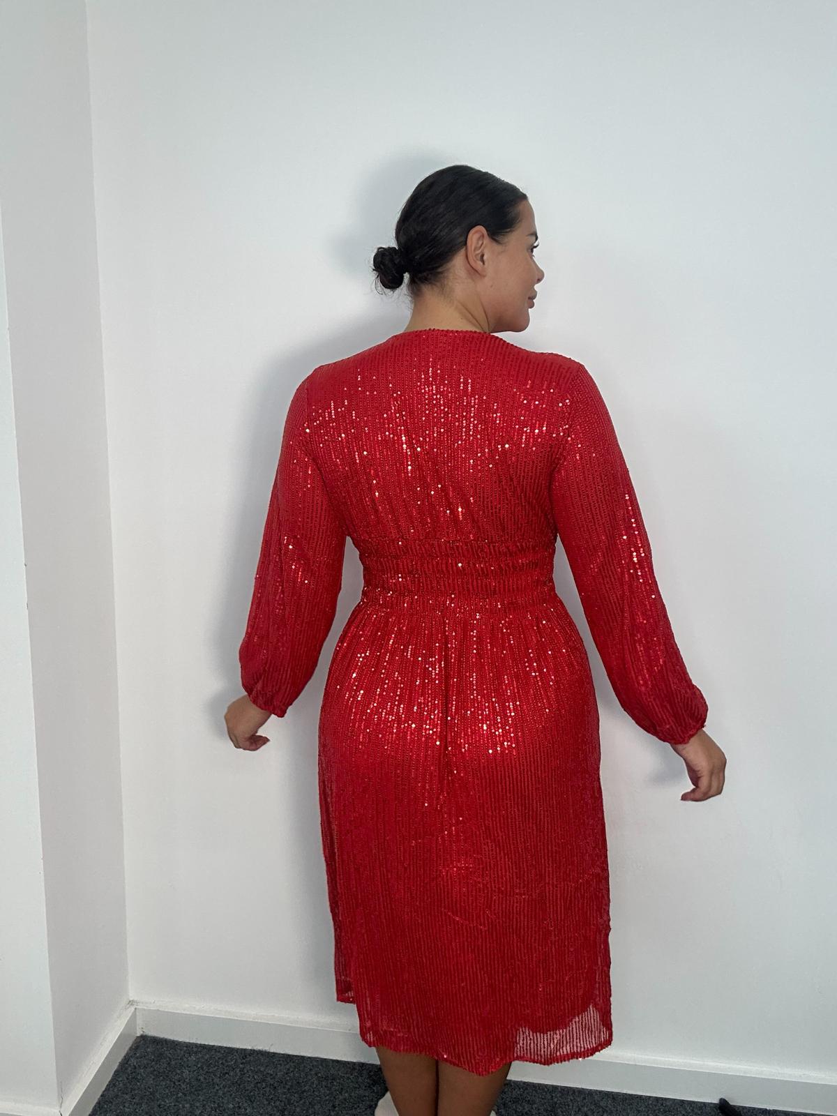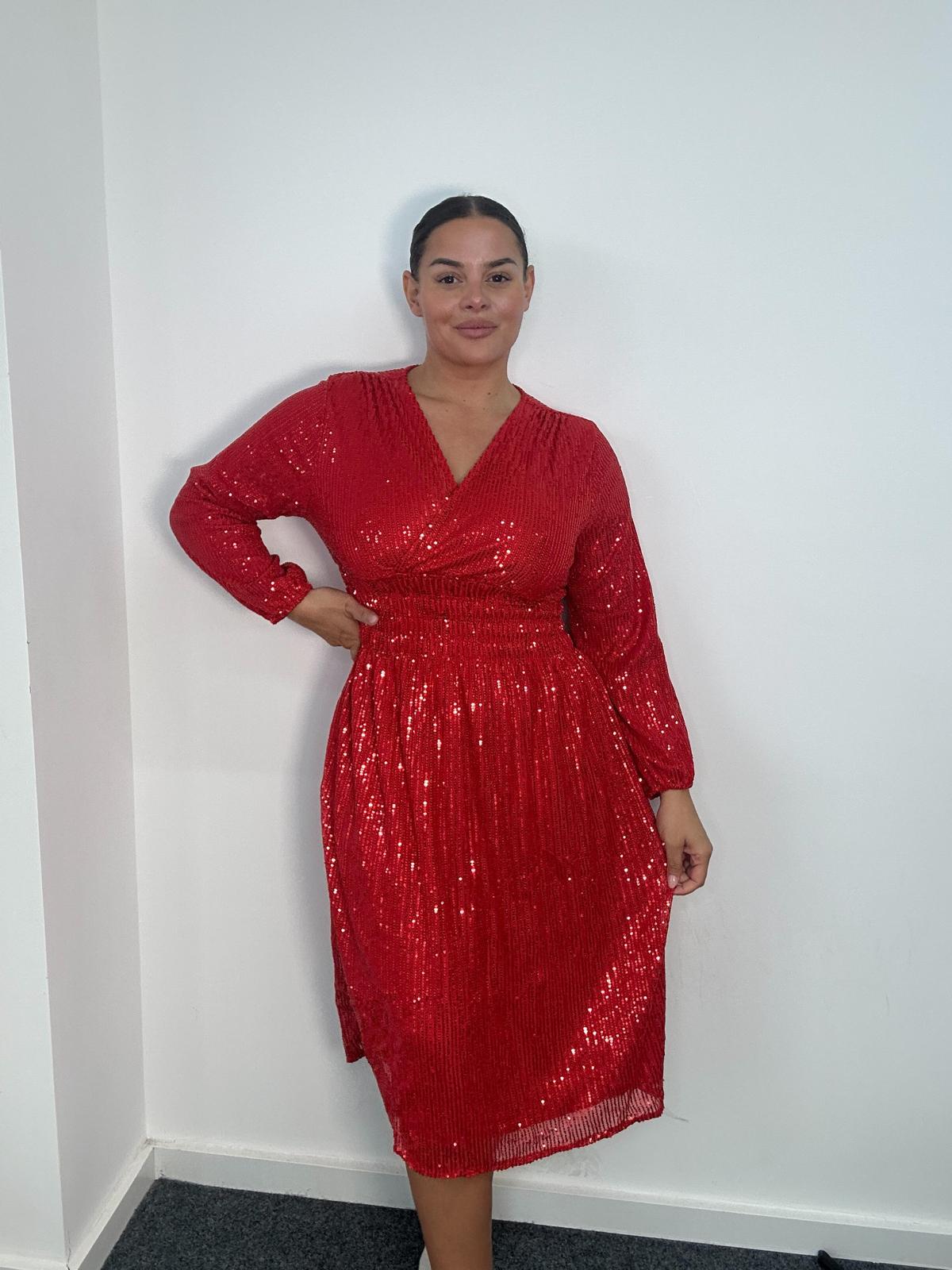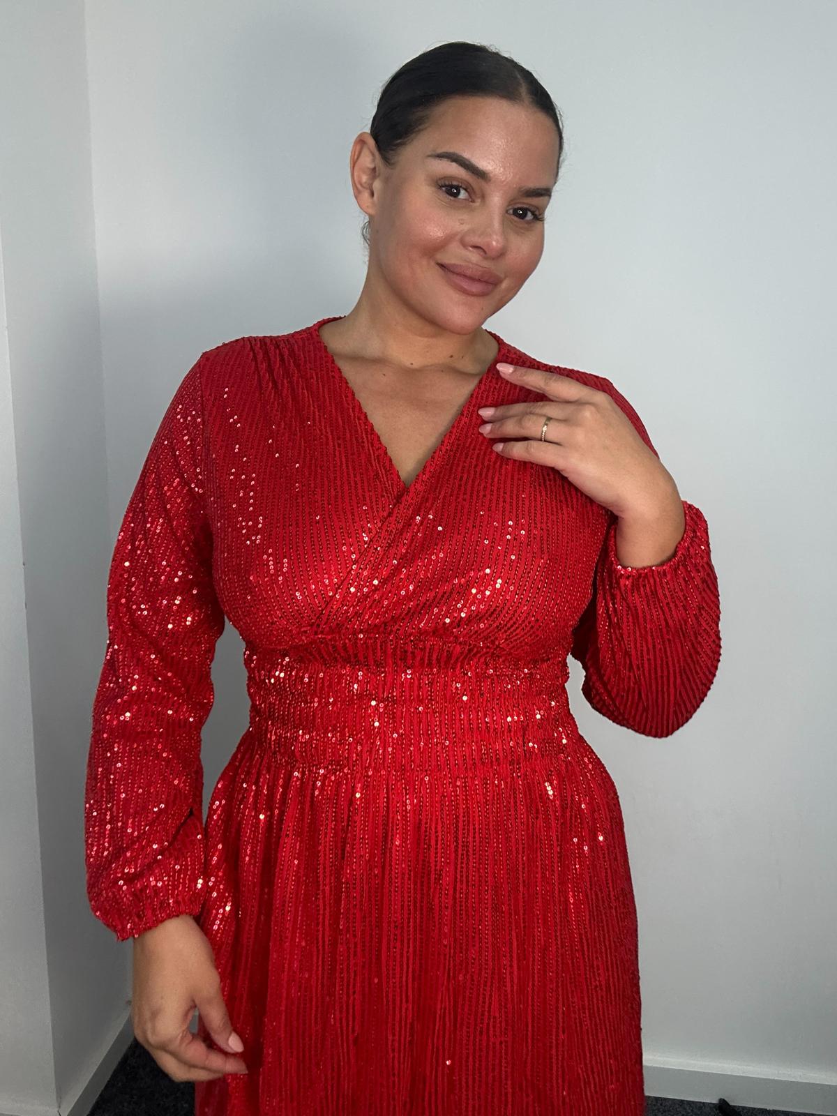 Turn up the glamour in your boutique’s partywear range with our Plus Size Sequin Wrap Midi Dress. This show-stopping style features all-over shimmering sequins, designed to flatter curves with its wrap-style v-neck and elasticated waist that cinches perfectly for shape and comfort. The long sleeves add an elegant touch, making it ideal for festive occasions, evening events, and special celebrations.