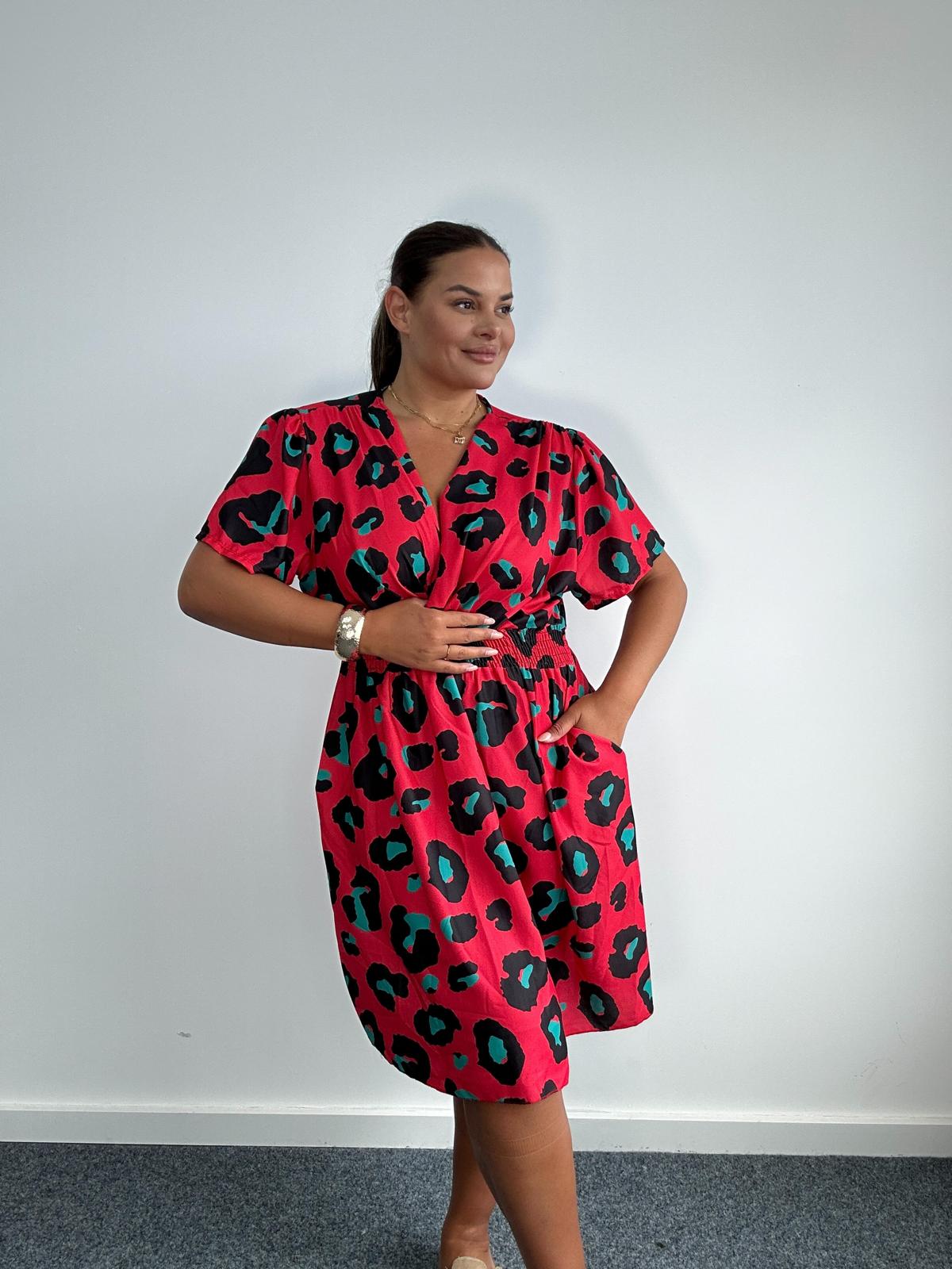 Plus Size Curve Red Wrap Front Short Puff Sleeves Leopard Print Dress with Pockets x 5
