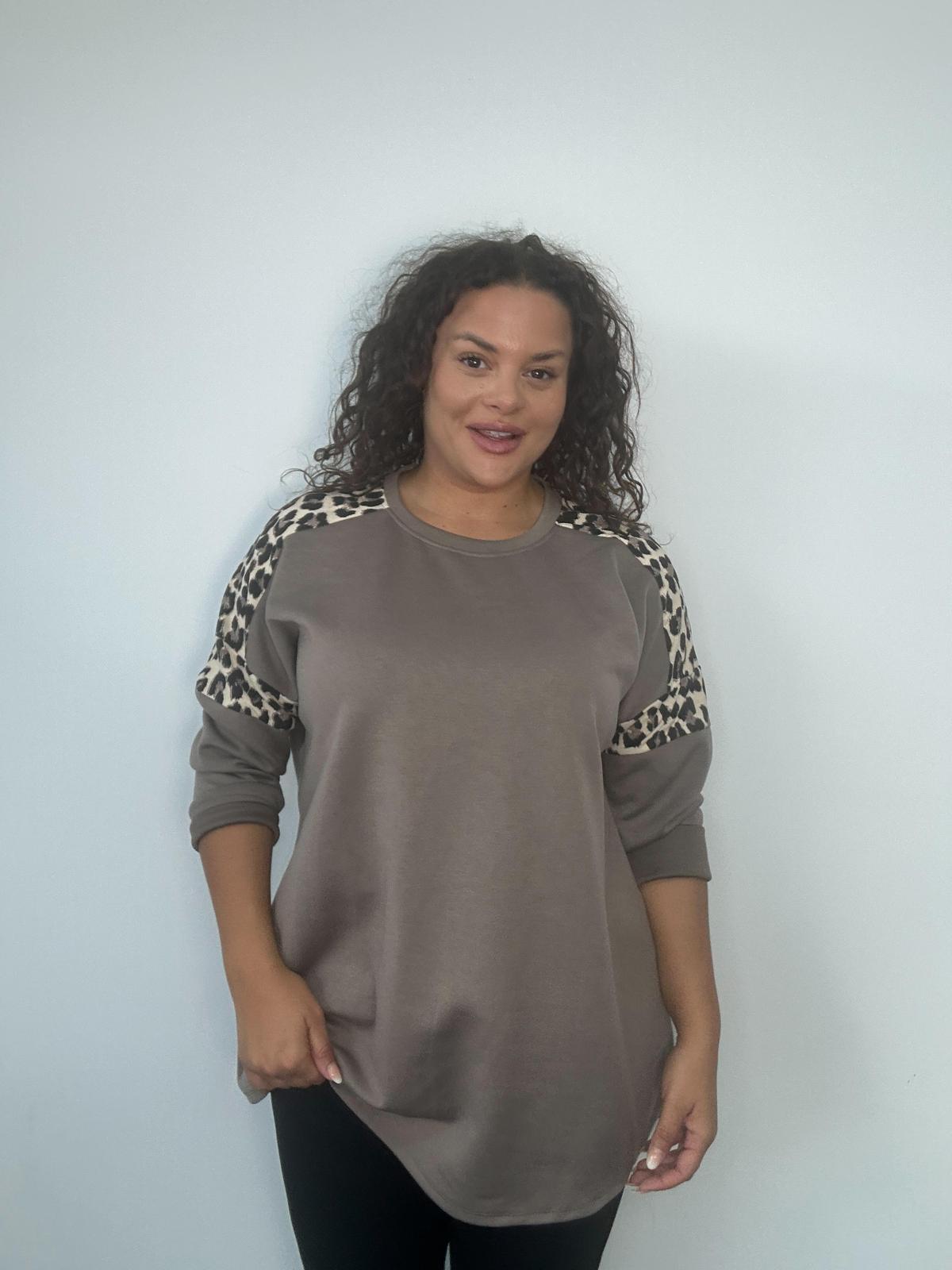 Plus Size Curve Taupe Longline Top with Leopard Print Sleeve Detail x 2, 3 & 5 Pack Options