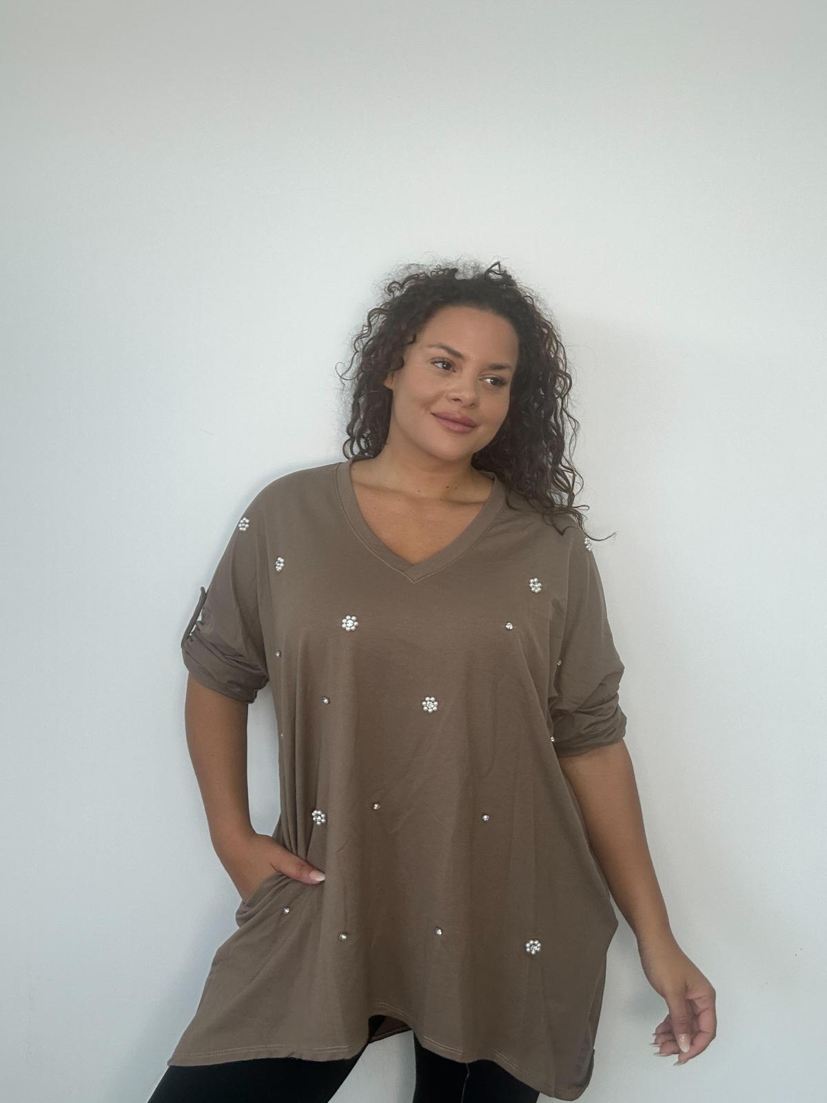 Add a touch of elegance to casualwear with our Plus Size Curve V Neck Top, featuring delicate pearl and floral embellishments throughout. Designed with a relaxed longline fit and roll-up sleeves, this top combines comfort with a chic, feminine finish. A versatile wholesale style that pairs effortlessly with jeans, leggings, or tailored trousers for day-to-night wear.