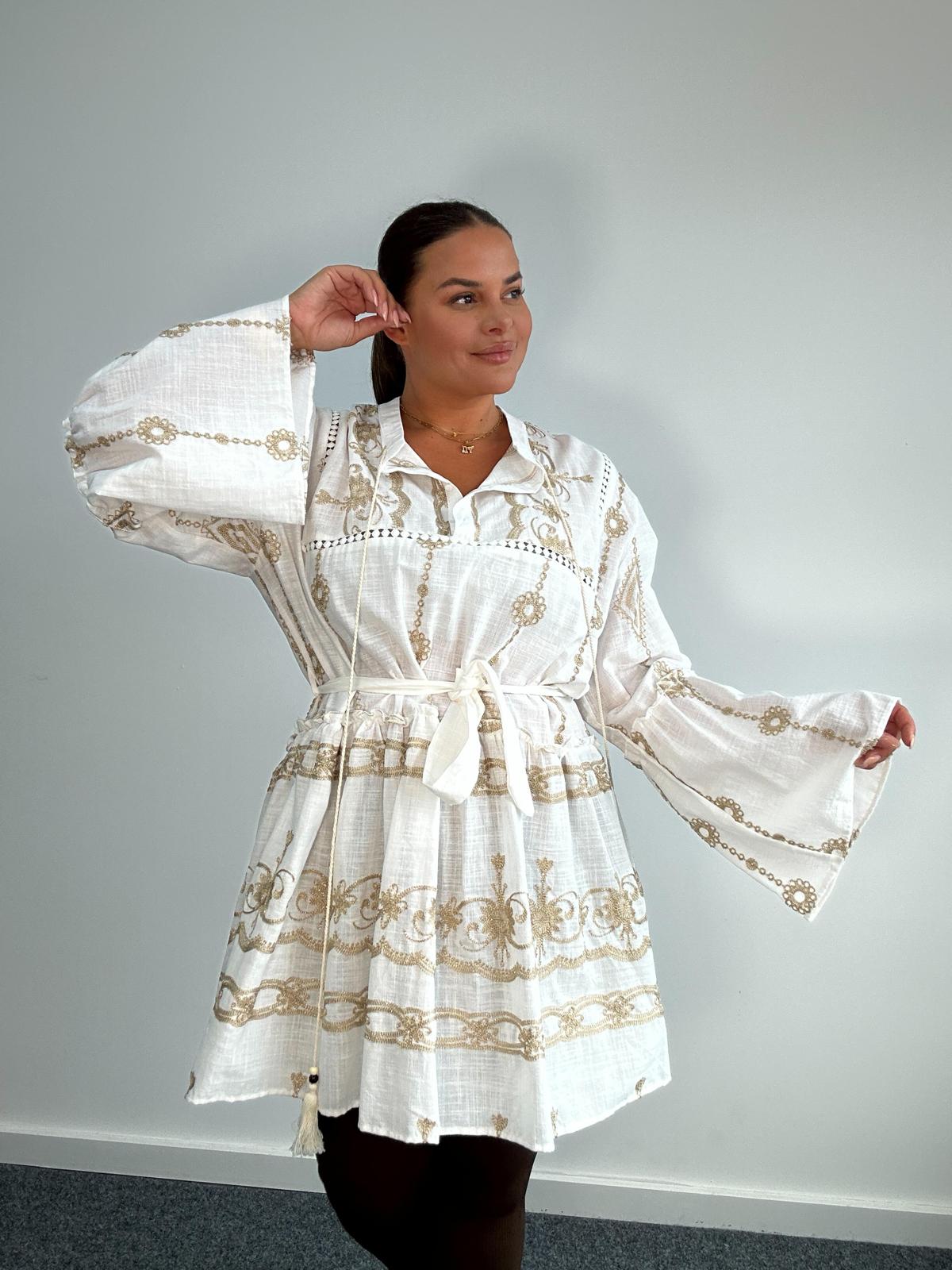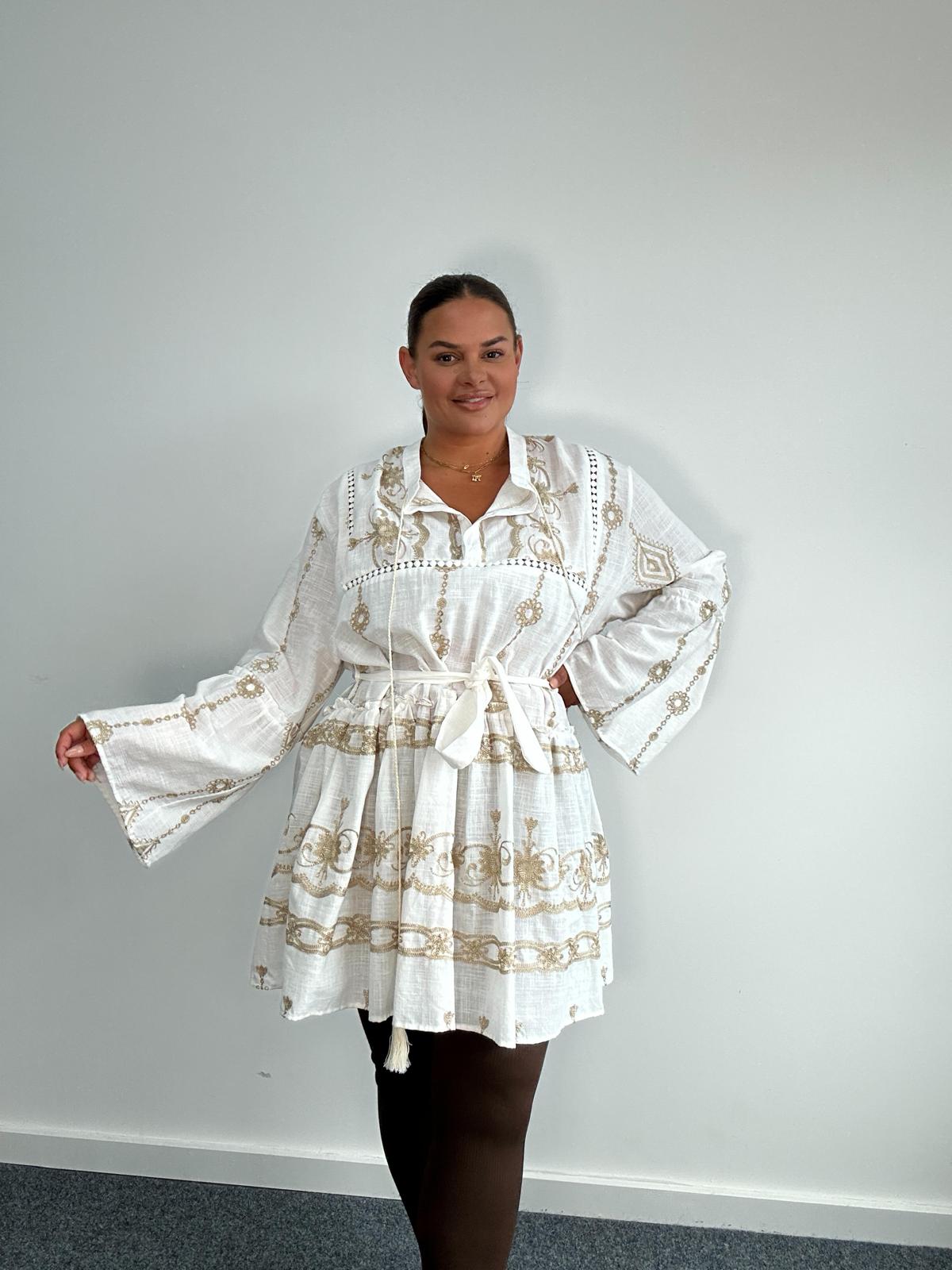 Romantic, refined, and ready to wear, this plus size mini dress features intricate gold embroidery and a flattering belted waist. Designed in airy, crinkle-textured cheesecloth fabric, it showcases wide fluted sleeves, a softly gathered skirt, and tassel details that add a luxe boho finish. Perfect for holidays, garden parties, or effortlessly chic daywear.