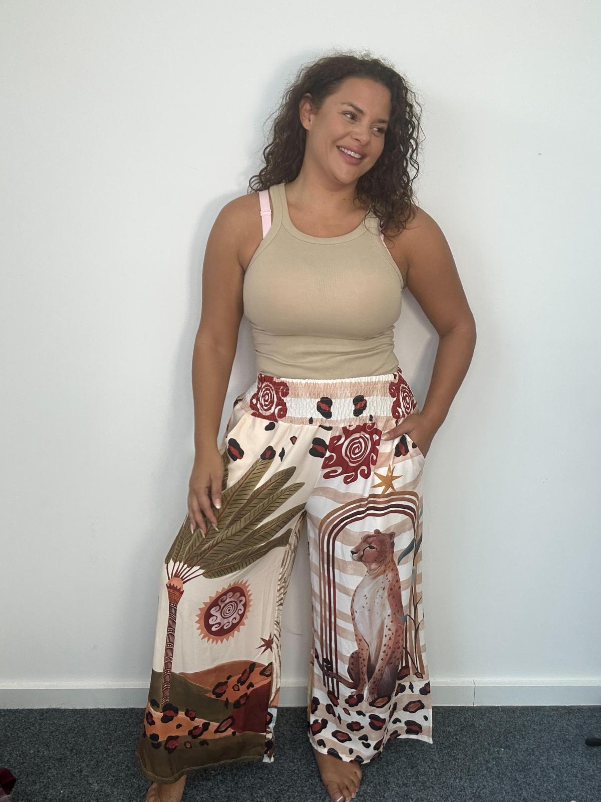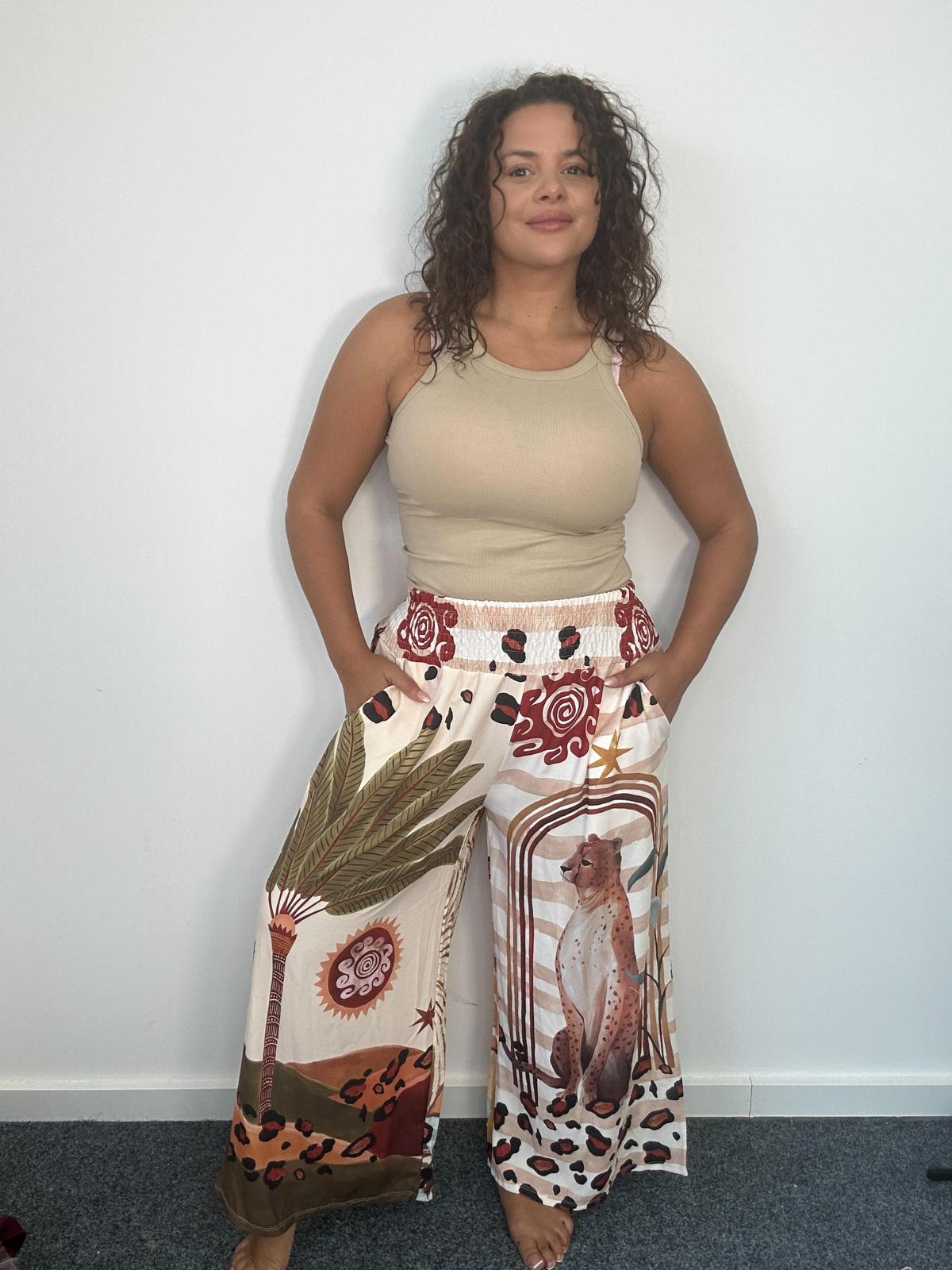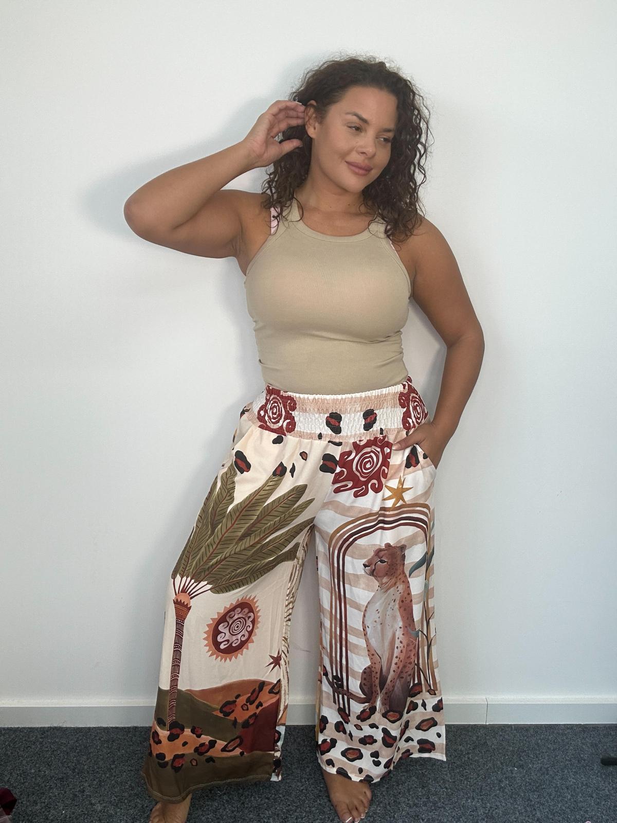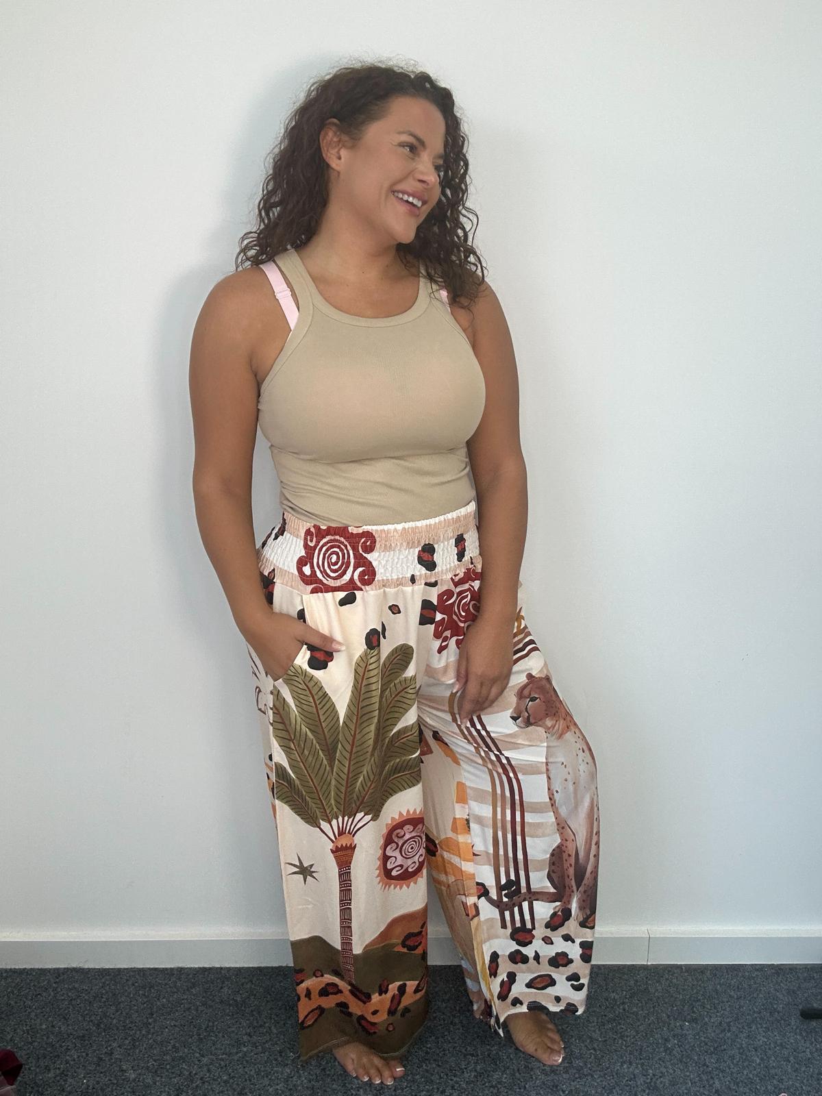 Add a bold statement to your wholesale collection with our Plus Size Curve Wide Leg Safari Print Trousers. Featuring an all-over artistic safari-inspired design with palm trees, animal motifs, and abstract details, these trousers are both stylish and comfortable. The elasticated waistband ensures a flexible fit, while the wide-leg silhouette gives a breezy and relaxed look. Perfect for casual days, holidays, or standout everyday wear.