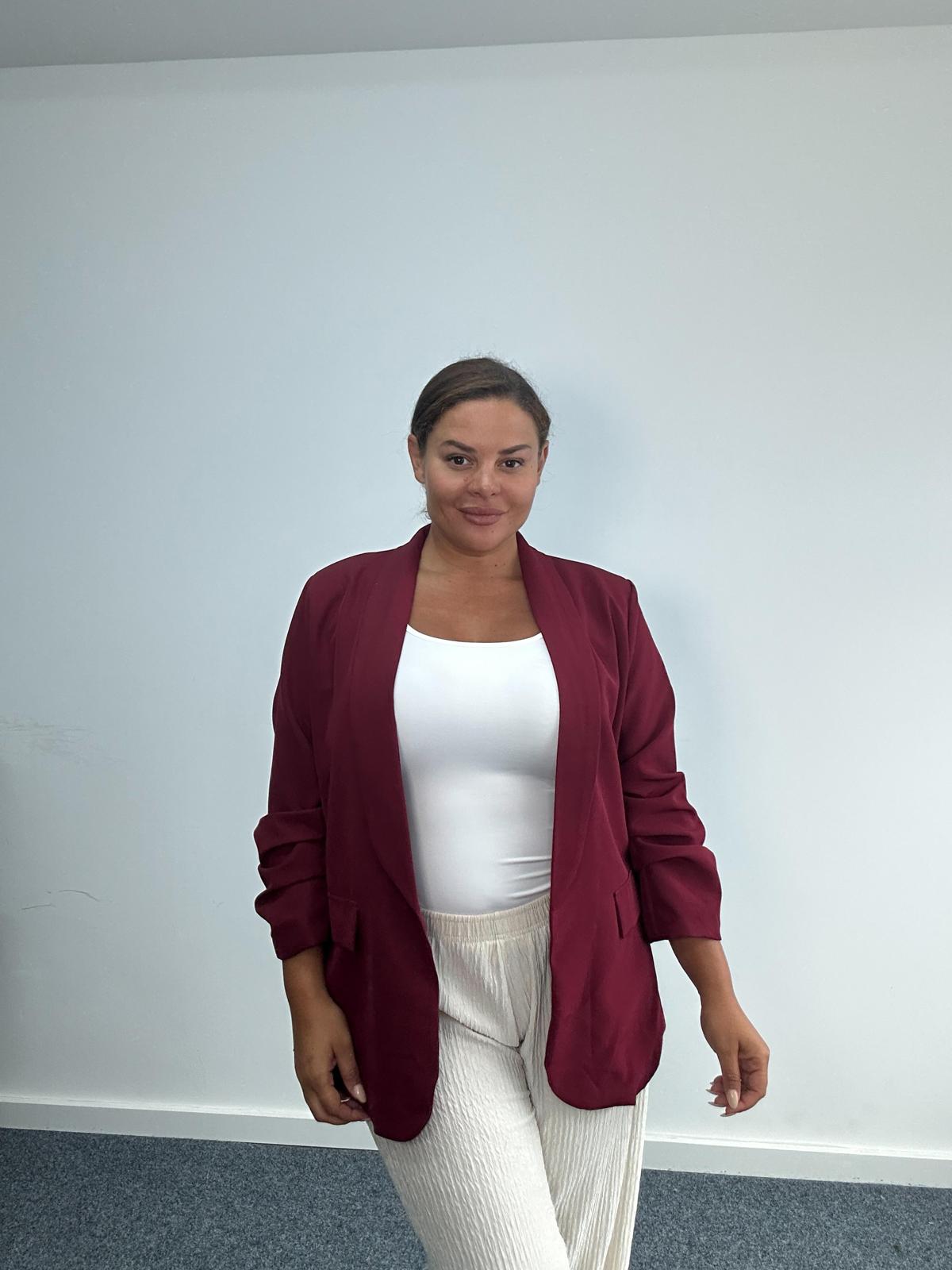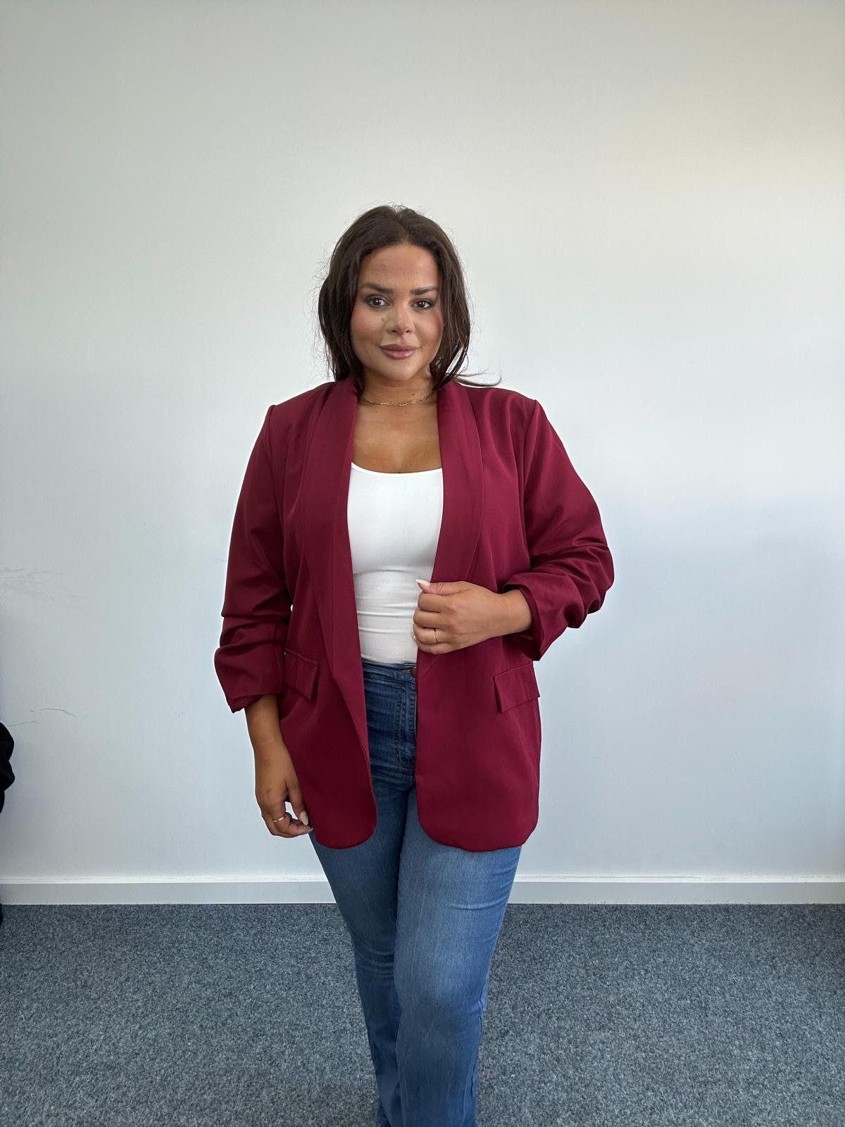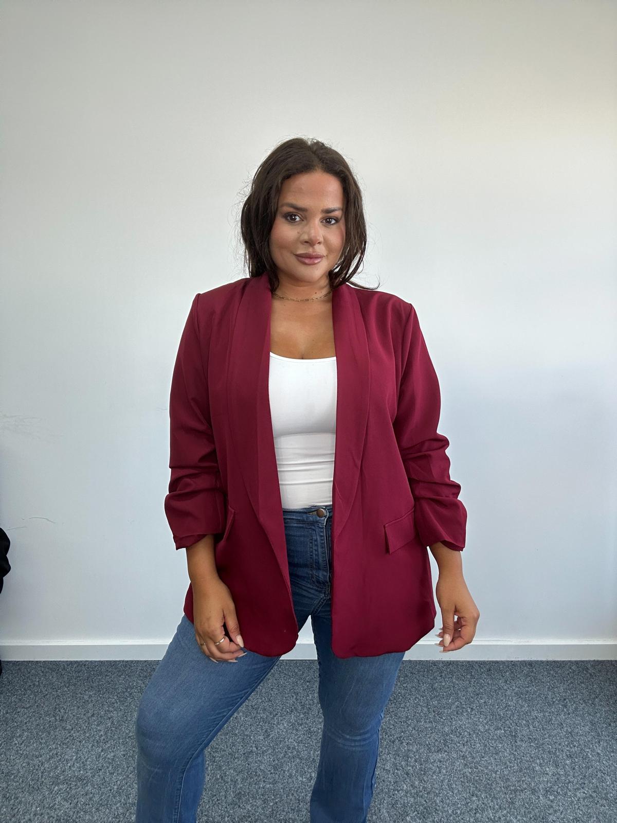 Elevate your wholesale fashion collection with this chic plus size wine blazer. Designed with a flattering open front, ruched sleeves, and a relaxed tailored fit, this versatile piece transitions seamlessly from office wear to smart-casual styling. A must-have for curve fashion retailers.