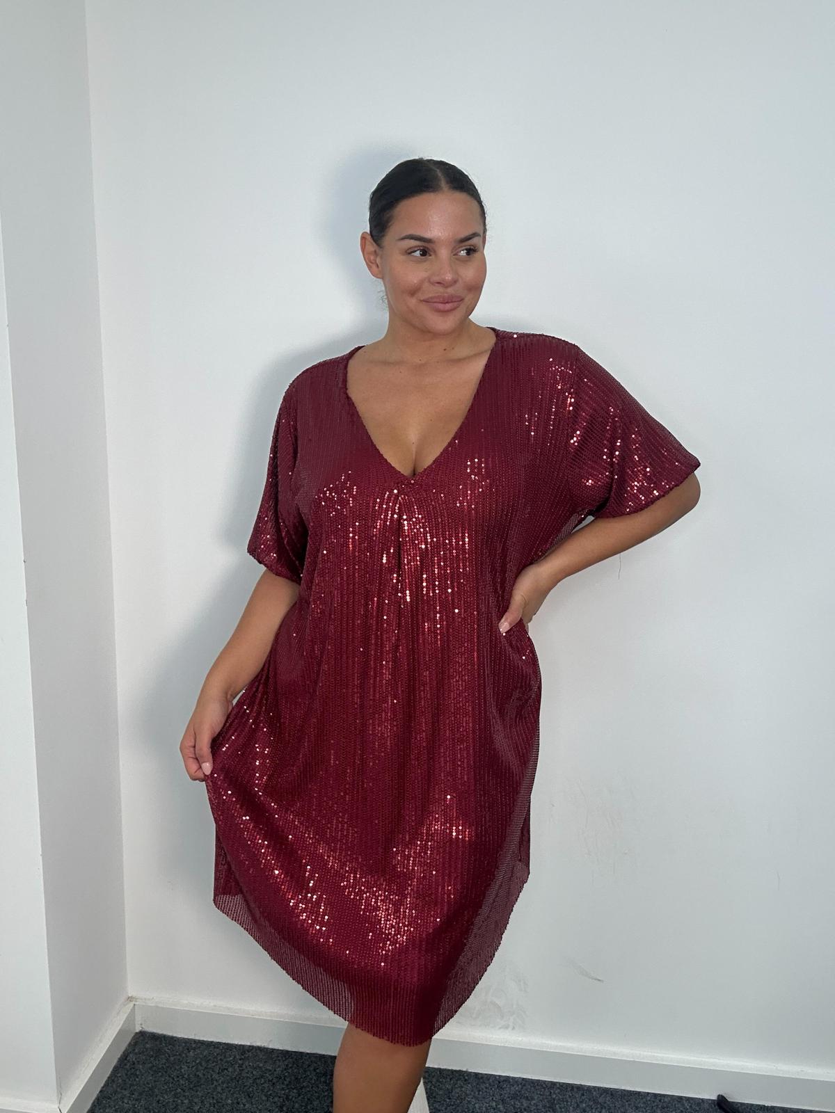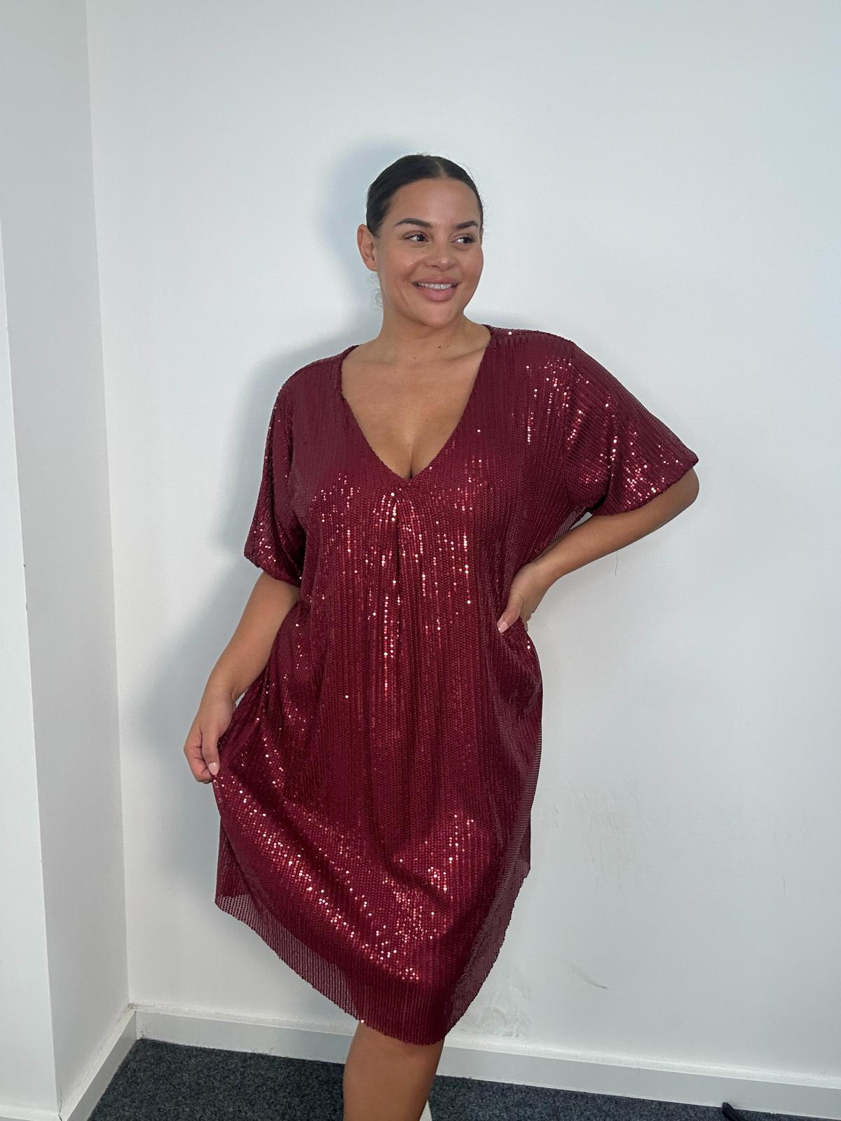 Plus Size Curve Wine Sequin V Neck Short Sleeve Shift Dress x 2, 3 & 5 Pack Options