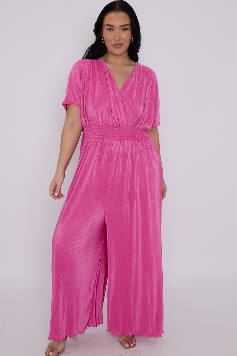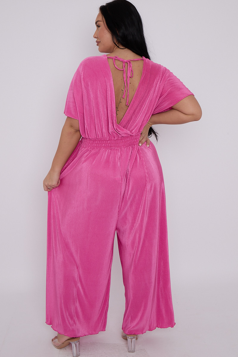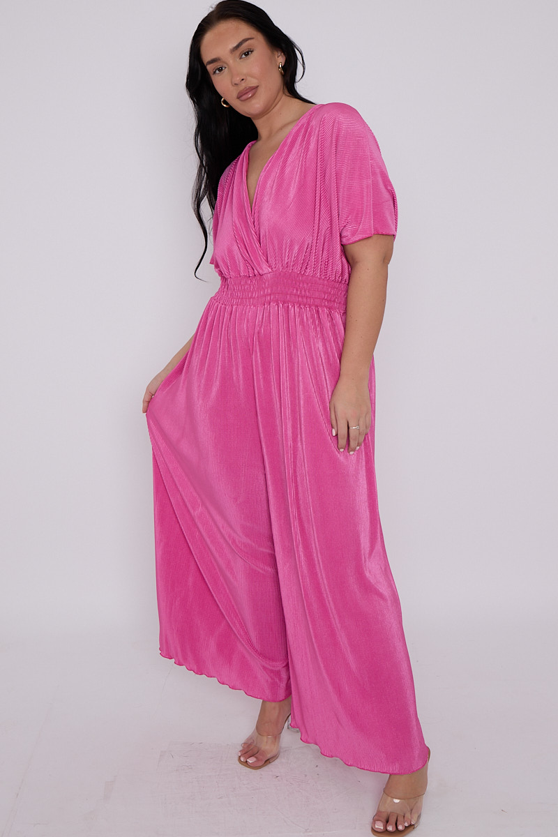 Plus Size Fuchsia Shimmer Wrap V Neck Wide Leg Jumpsuit With Shirred Waist x 5