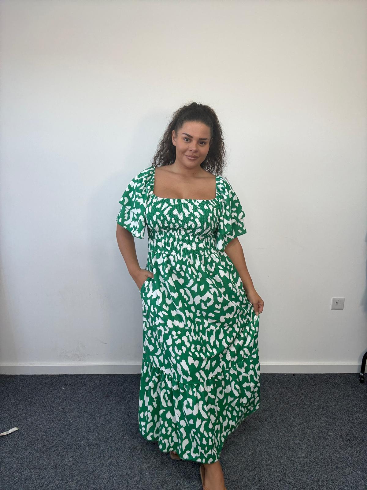 Plus Size Green Animal Print Shirred Frill Hem Midi Dress with Pockets x 2, 3 & 5 Pack Options
