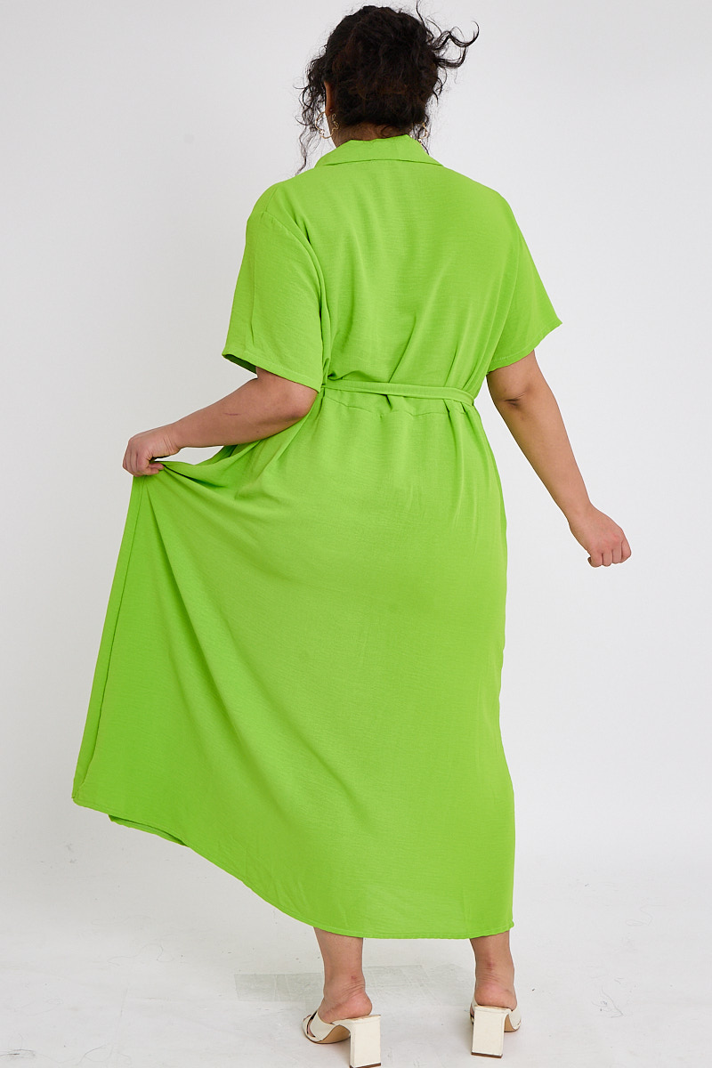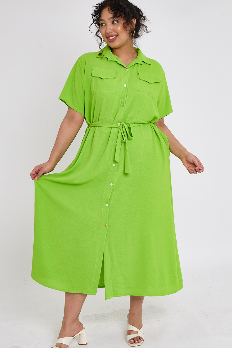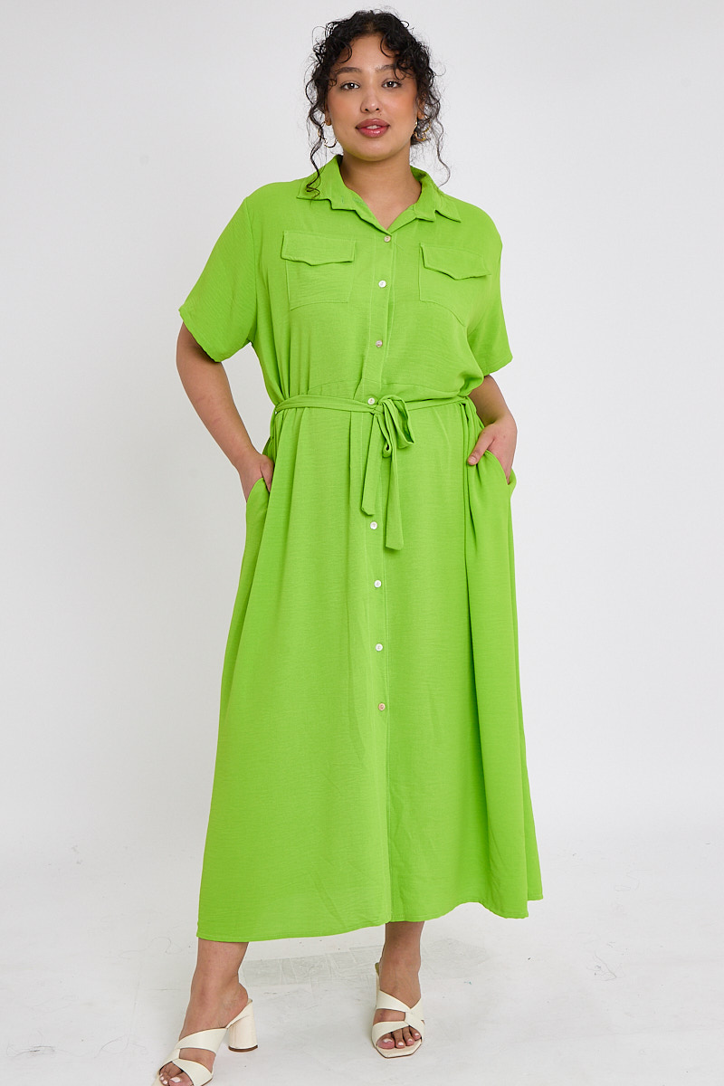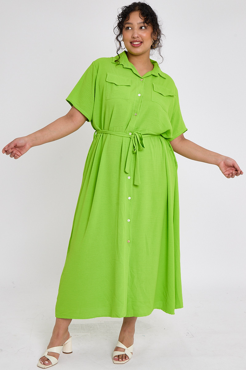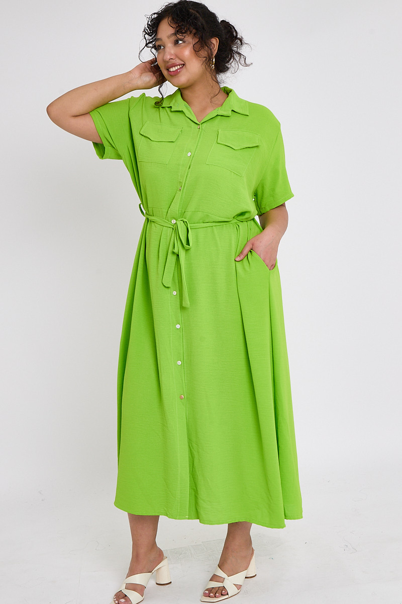 Plus Size Green Shirt Style Short Sleeve Tie Waist Dress With Pockets x 5