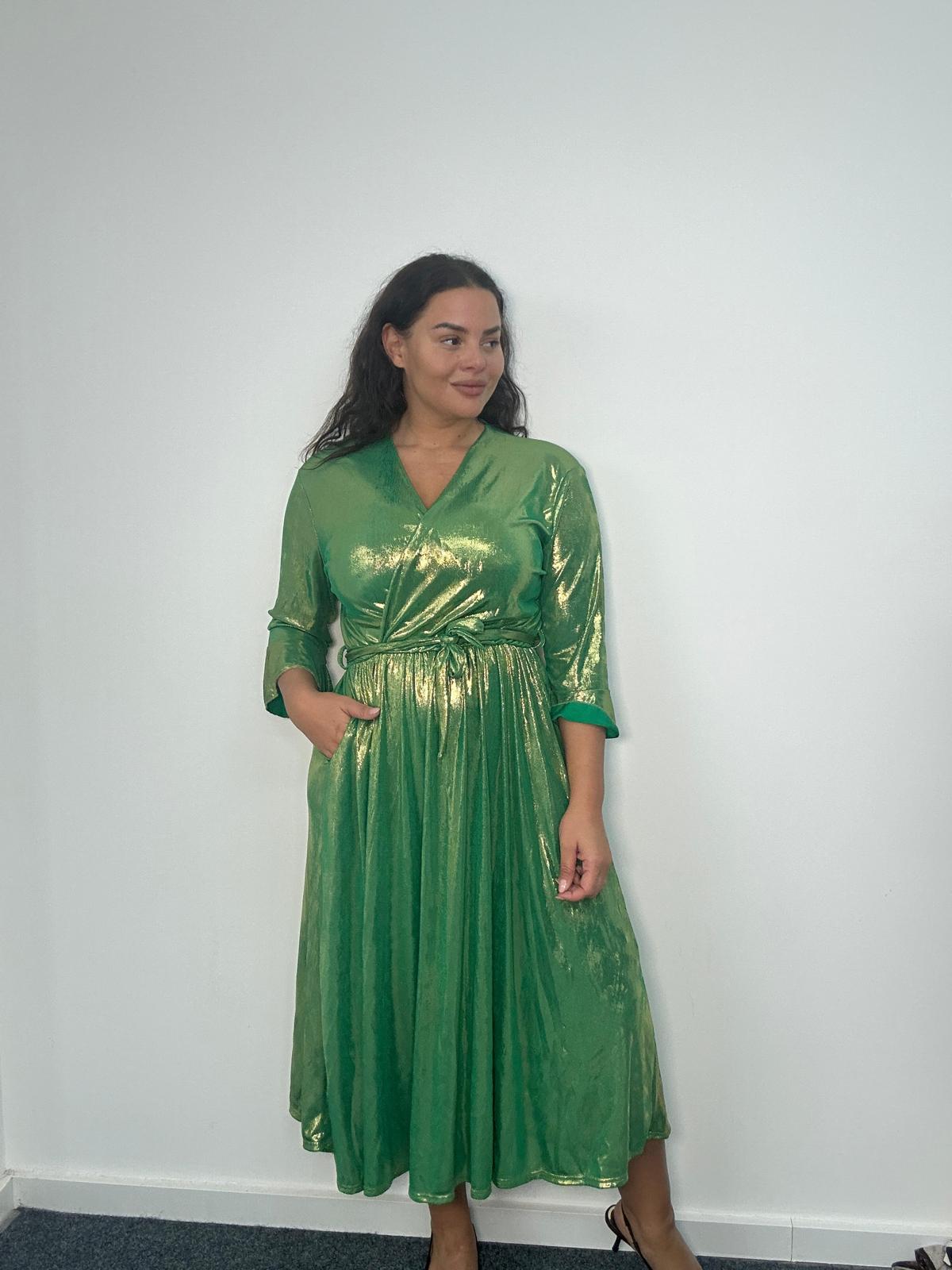 Bring sleek sophistication to your plus size collection with this stunning wrap midi dress. Designed with a flattering wrap front and tie waist, it enhances curves beautifully while offering a comfortable fit. The shimmering fabric adds a touch of luxury, making it perfect for evening occasions, parties, and special events. With 3/4 sleeves and side pockets, it combines style and practicality an easy sell for boutiques and online retailers looking to stock statement plus size occasionwear.