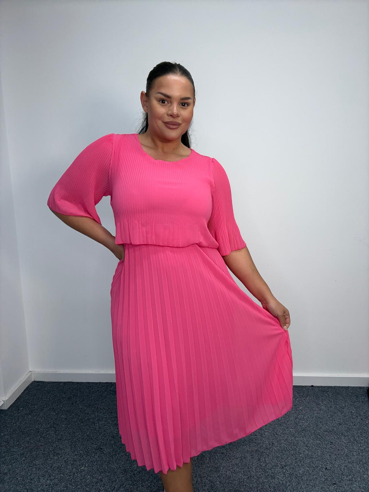 Add effortless elegance to your curve collection with this plus size pleated midi dress. Designed to flatter and flow, this feminine style features a soft pleated skirt and a gently shaped bodice for a comfortable yet refined silhouette.This dress is ideal for occasionwear, spring/summer edits, bridesmaid collections, or elevated daywear. The angel-style short sleeves provide light coverage while maintaining a soft, romantic feel. Cut in a relaxed, curve-friendly fit, the pleated midi skirt moves beautifully with the body, creating a graceful shape that boutique customers love. A versatile wholesale piece that transitions seamlessly from weddings and garden parties to smart-casual styling. An essential addition for UK plus size retailers seeking elegant, easy-to-sell occasion styles.