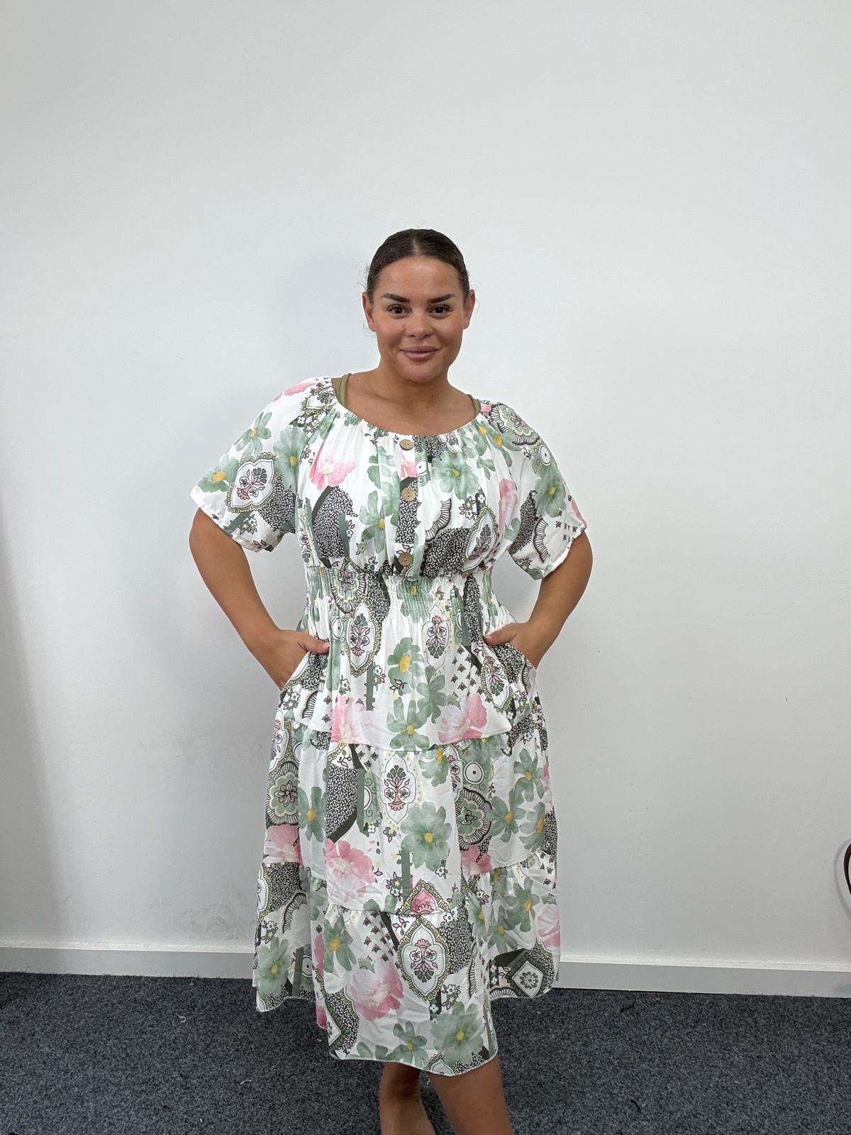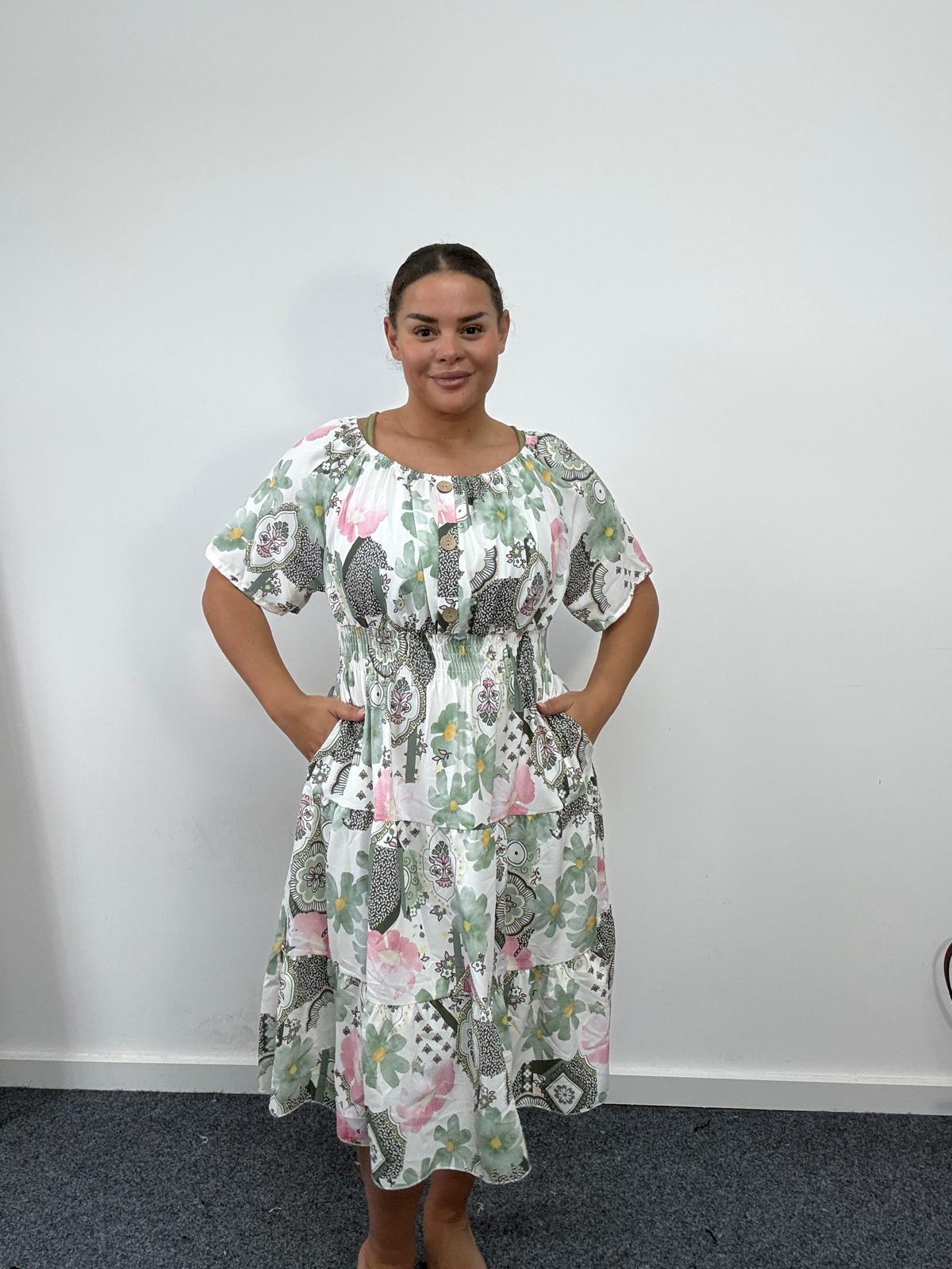 Add fresh seasonal styles to your curve collection with this plus size floral print tiered midi dress. Designed to flatter fuller figures, this dress features a comfortable shirred elasticated waist that creates shape while maintaining flexibility and ease of wear. The soft round neckline with decorative button detail adds a feminine touch, while the short relaxed sleeves provide breathable comfort for everyday styling. Finished with a flowing tiered skirt, this dress offers beautiful movement and a flattering silhouette. The floral print gives the dress a soft, elegant look, making it perfect for spring and summer collections. Ideal for boutiques and online retailers looking to stock easy-to-wear plus size dresses with broad customer appeal.