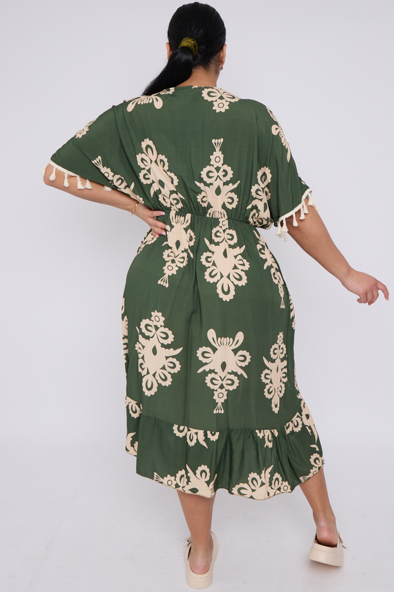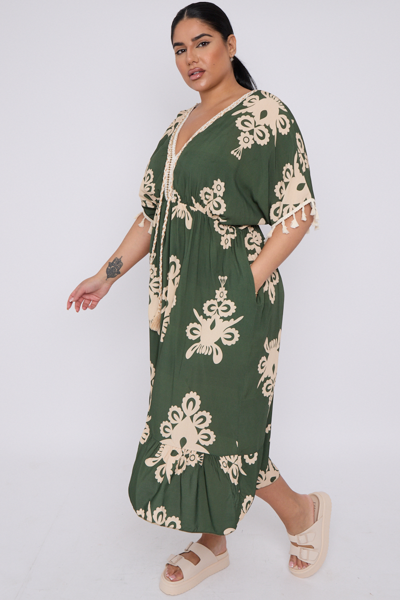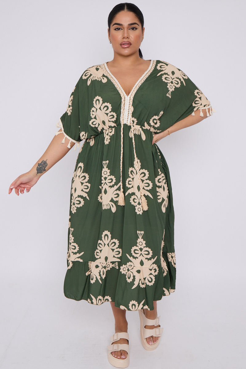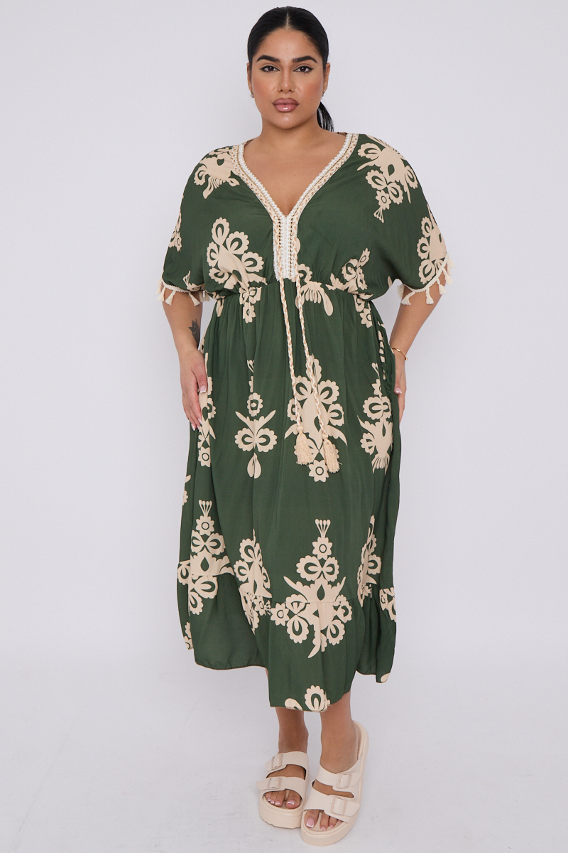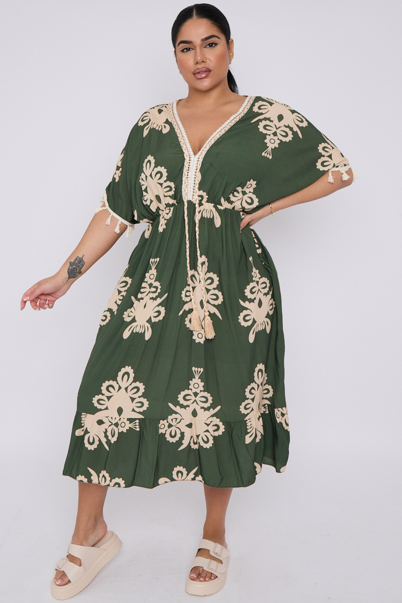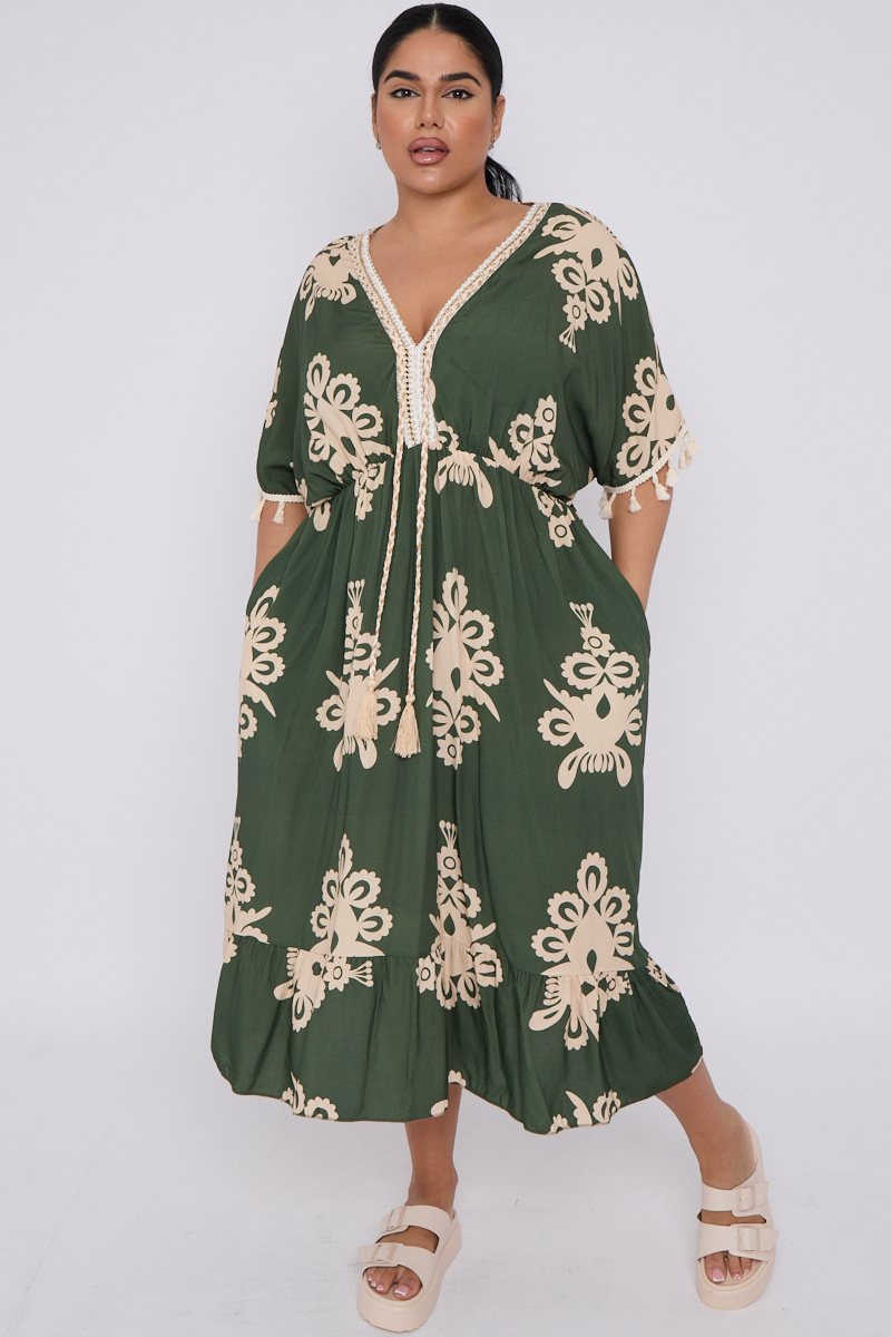 Plus Size Khaki Printed Crochet Detail Dress With Pockets x 5