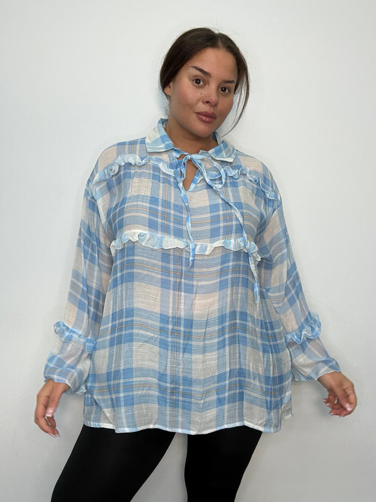 Plus Size Light Blue Frill Detail Check Blouse Top x 2, 3 & 5 Pack Options