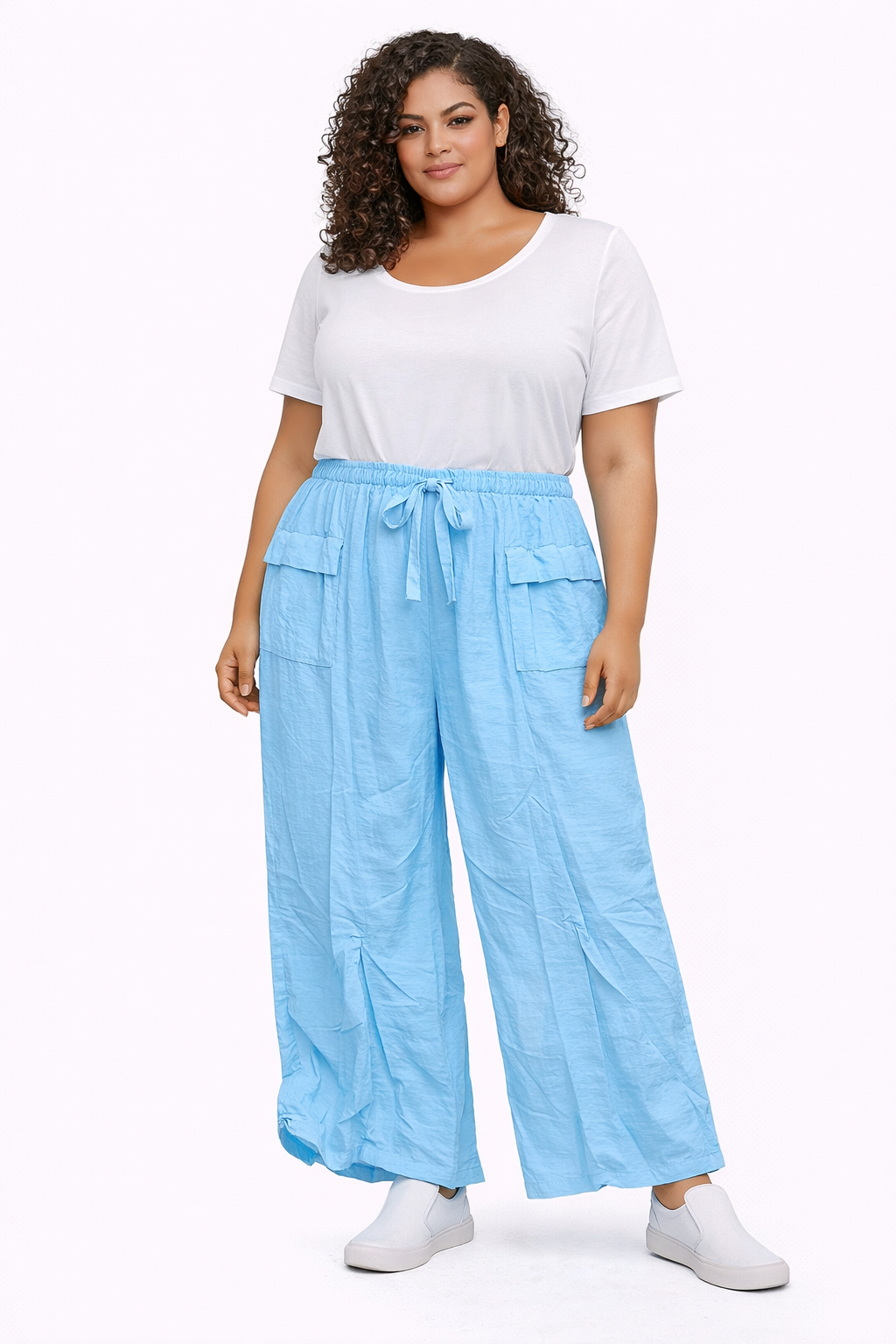 • Bring relaxed comfort to your curve collection with these plus size wide leg cargo trousers. Designed with a loose flowing silhouette, this lightweight style offers effortless wearability while delivering strong trend appeal for modern plus size customers. Featuring an elasticated drawstring waistband for an adjustable fit, these trousers combine practicality with fashion-forward styling. The oversized cargo-style patch pockets add a contemporary edge, while the airy fabric ensures comfort throughout the day, perfect for warmer seasons or casual layering. A standout piece for UK wholesale buyers, these curve trousers are ideal for boutiques and online retailers looking to introduce statement colour into their plus size casualwear ranges.