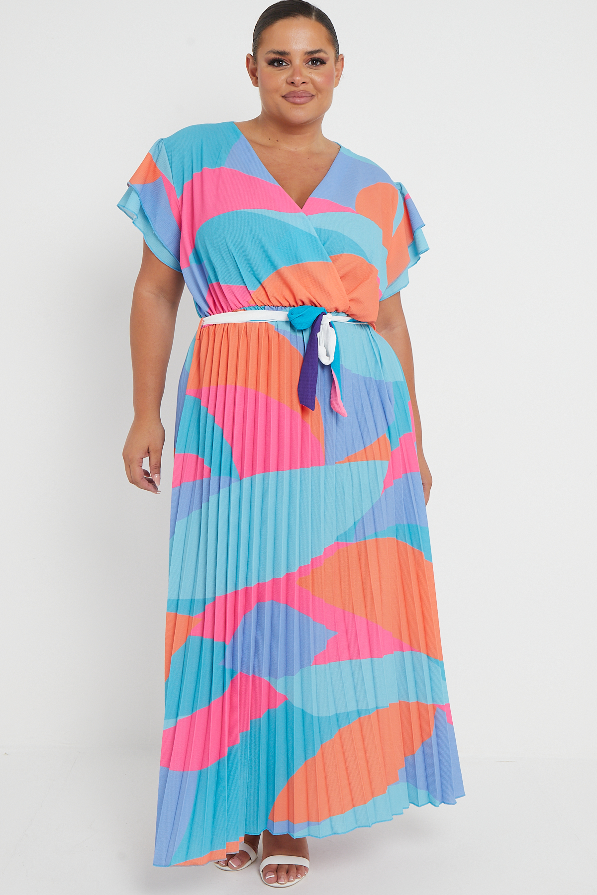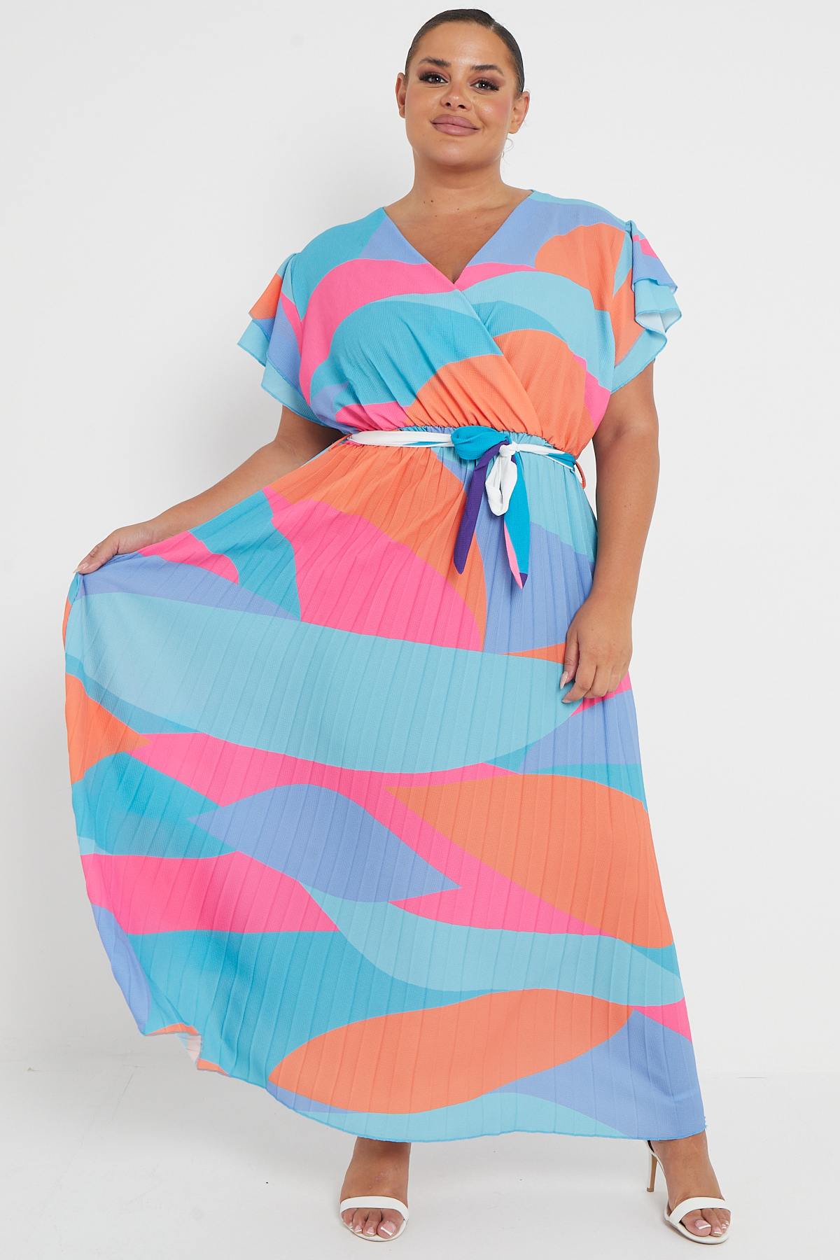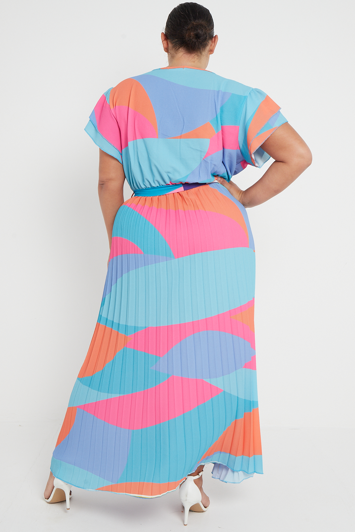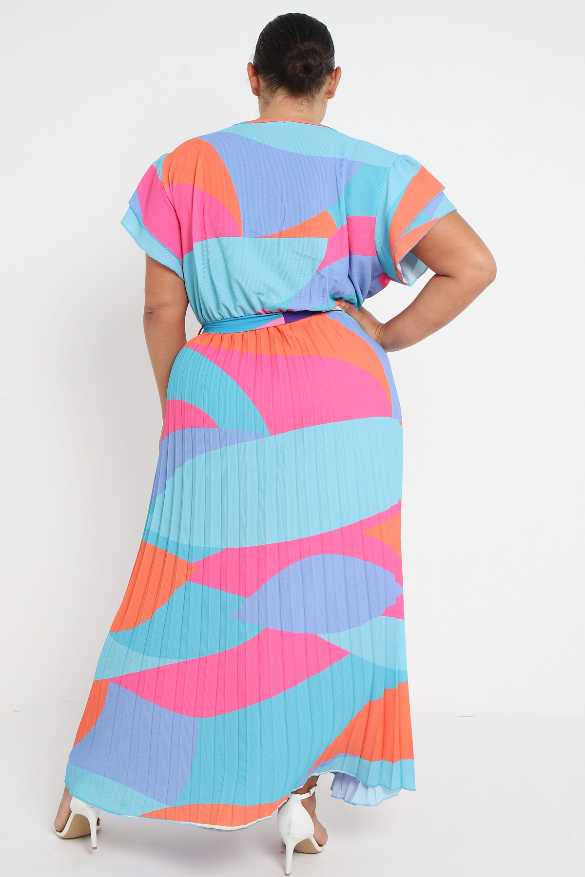 Plus Size Light Blue Printed Wrap Tie Waist Pleated Skirt Midi Dress With Frill Sleeves x 5
