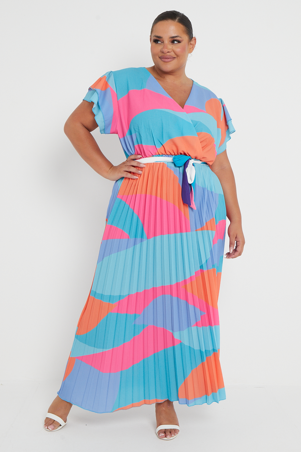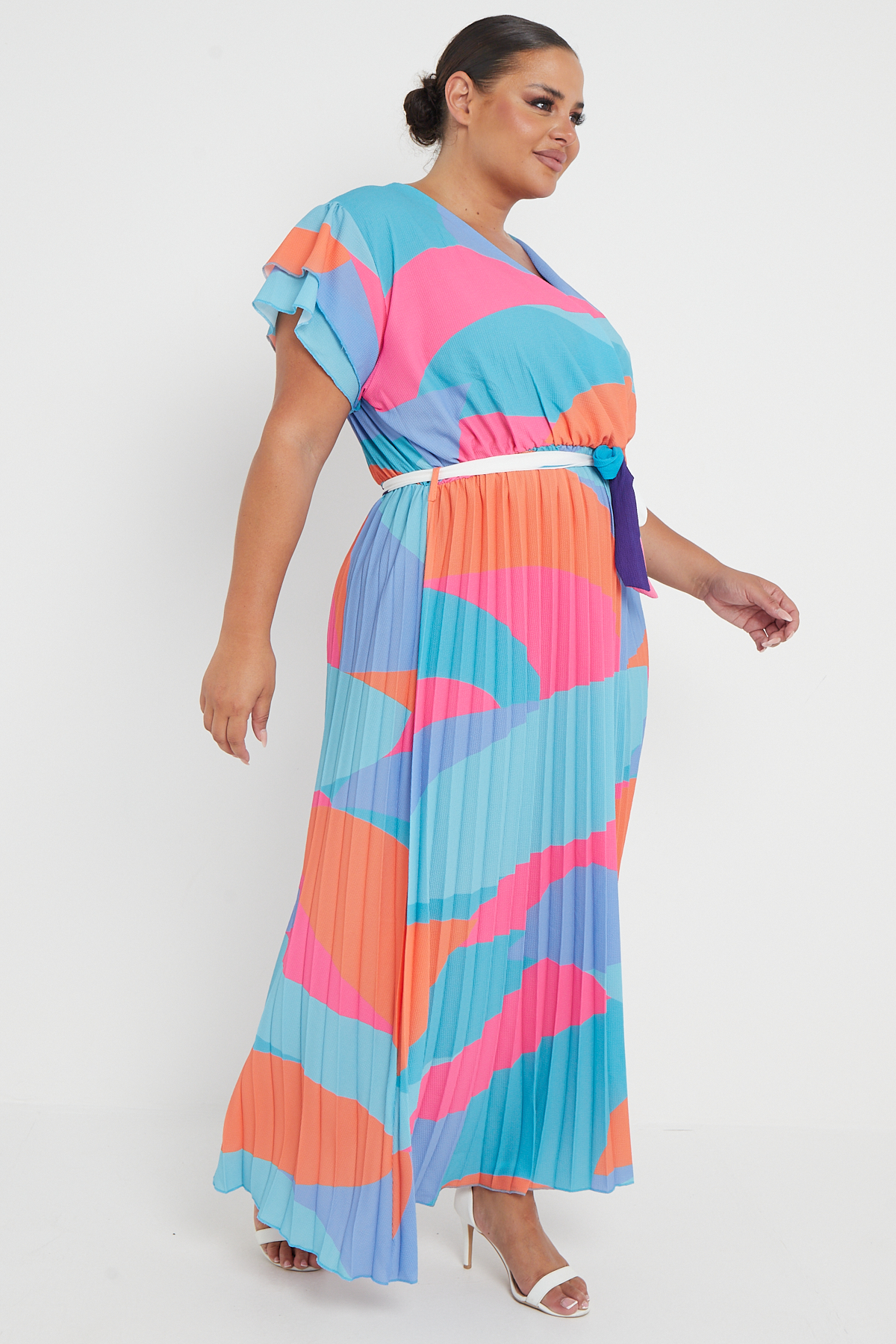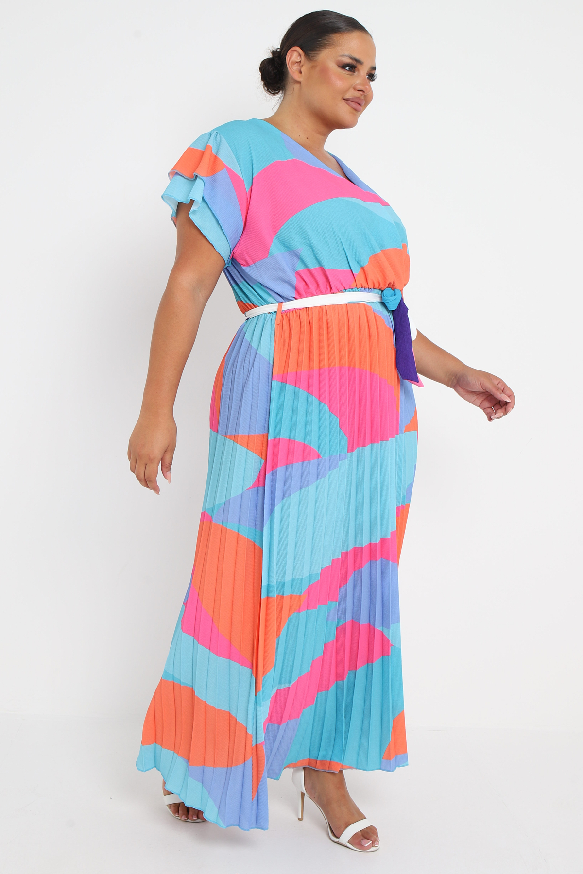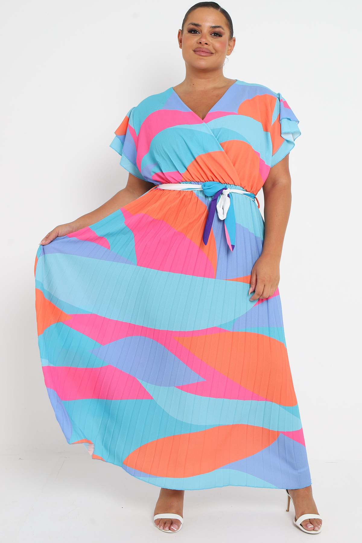 Plus Size Light Blue Printed Wrap Tie Waist Pleated Skirt Midi Dress With Frill Sleeves x 5