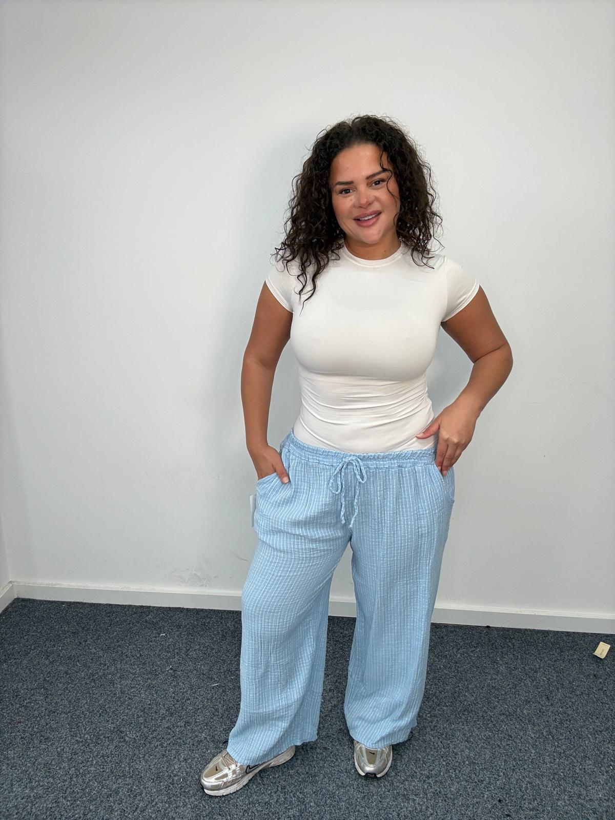 Refresh your plus size collection with these effortlessly stylish striped wide leg trousers. Designed with comfort and versatility in mind, this relaxed silhouette features a flattering elasticated waistband with adjustable drawstring tie for an easy, flexible fit. The lightweight fabric offers breathable all-day wear, while the stripe detail creates a lengthening effect that complements fuller figures. Complete with practical side pockets and a loose wide leg shape, these trousers are perfect for casual daywear, holiday edits or relaxed summer styling. A strong wholesale essential for UK plus size retailers seeking comfortable, trend-led curve separates with broad commercial appeal.