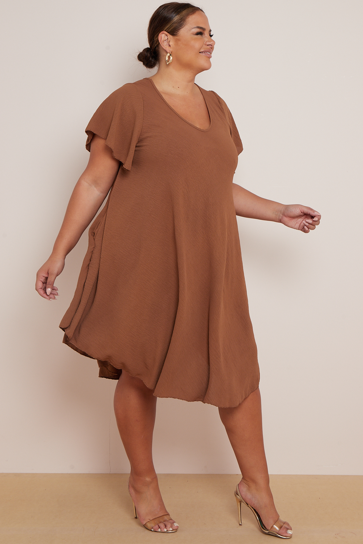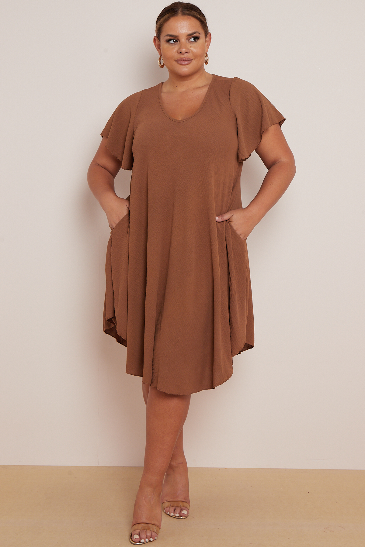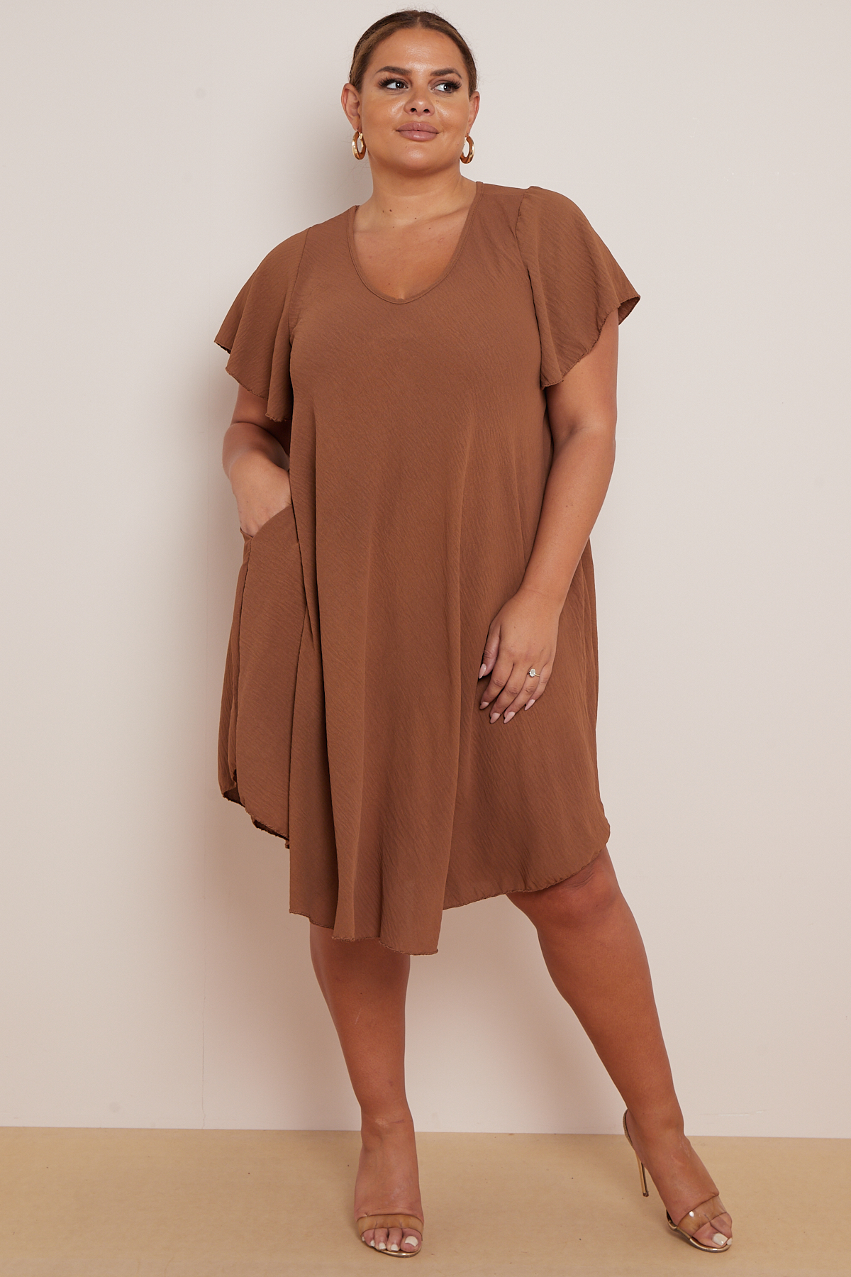 Plus Size Light Brown V Neck Short Flare Sleeves Asymmetric Hem Dress With Pockets x 5