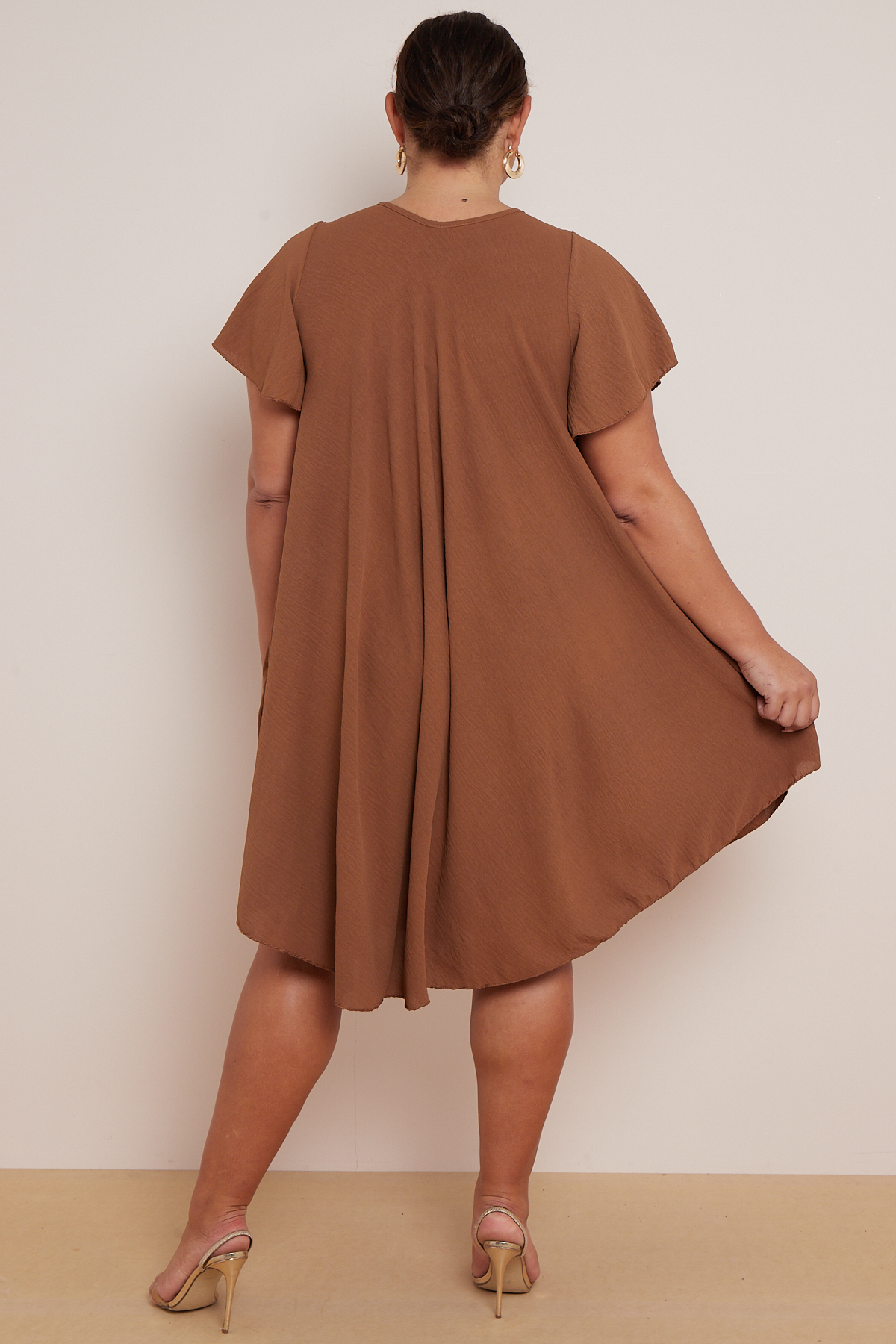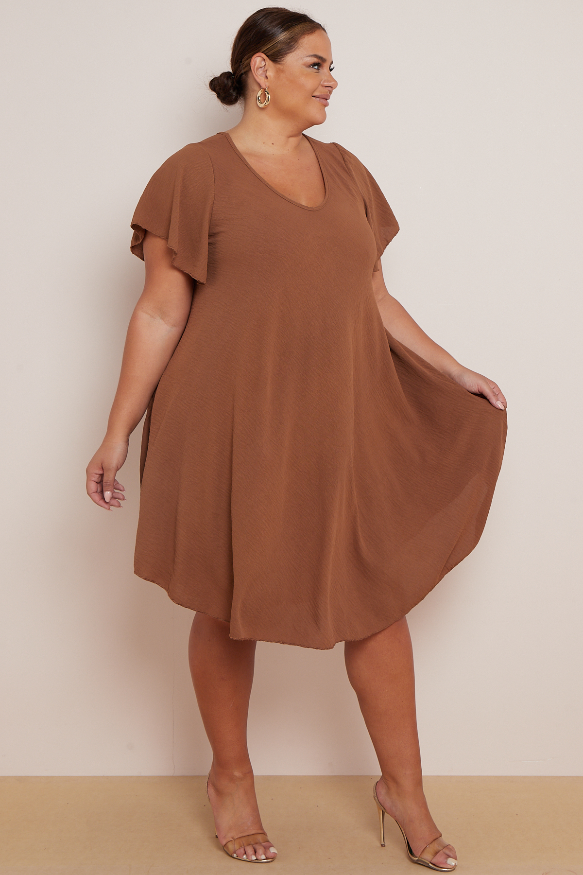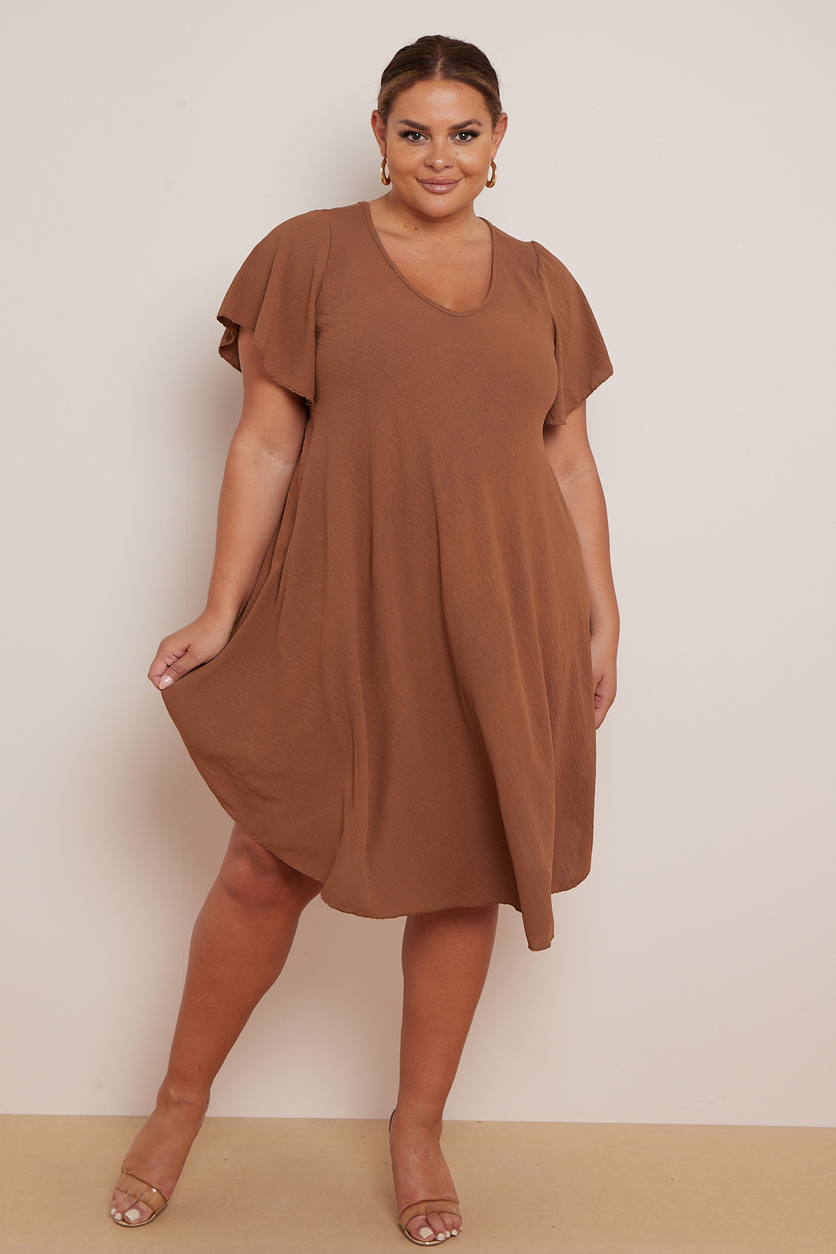 Plus Size Light Brown V Neck Short Flare Sleeves Asymmetric Hem Dress With Pockets x 5