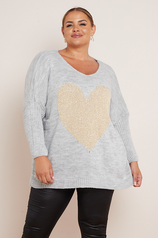 Plus Size Light Grey Heart Print Long Sleeve V Neck Jumpers x 5