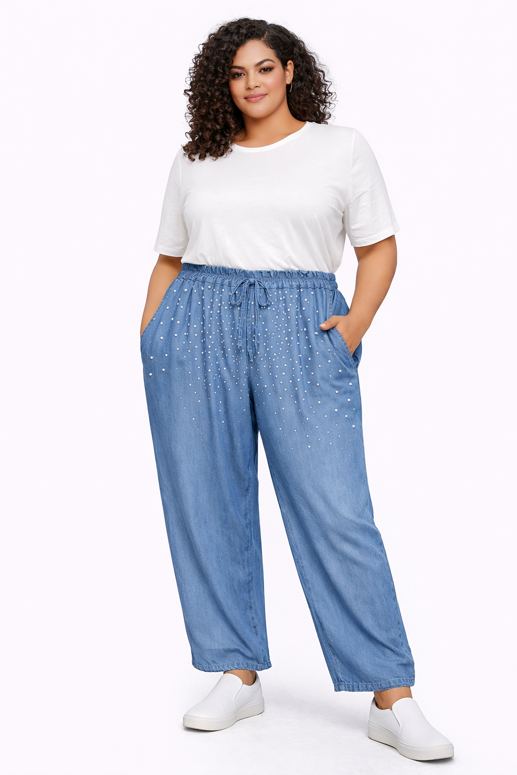 • Elevate your curve denim offering with these plus size wide leg trousers, designed for effortless comfort with a touch of subtle sparkle. Featuring a relaxed pull-on style with an elasticated waistband, these trousers offer an easy fit that flatters curves while maintaining a modern, laid-back silhouette. The soft lightweight denim-look fabric provides all-day wearability, while the delicate diamante embellishment adds a premium fashion edge, perfect for customers looking for casual styles with a hint of glamour. Functional side pockets and a loose wide-leg shape make these trousers both practical and on-trend. Ideal for UK wholesale buyers, this versatile curve denim style pairs effortlessly with basic tees, shirts, and seasonal knitwear, making it a strong addition to any plus size casualwear collection.