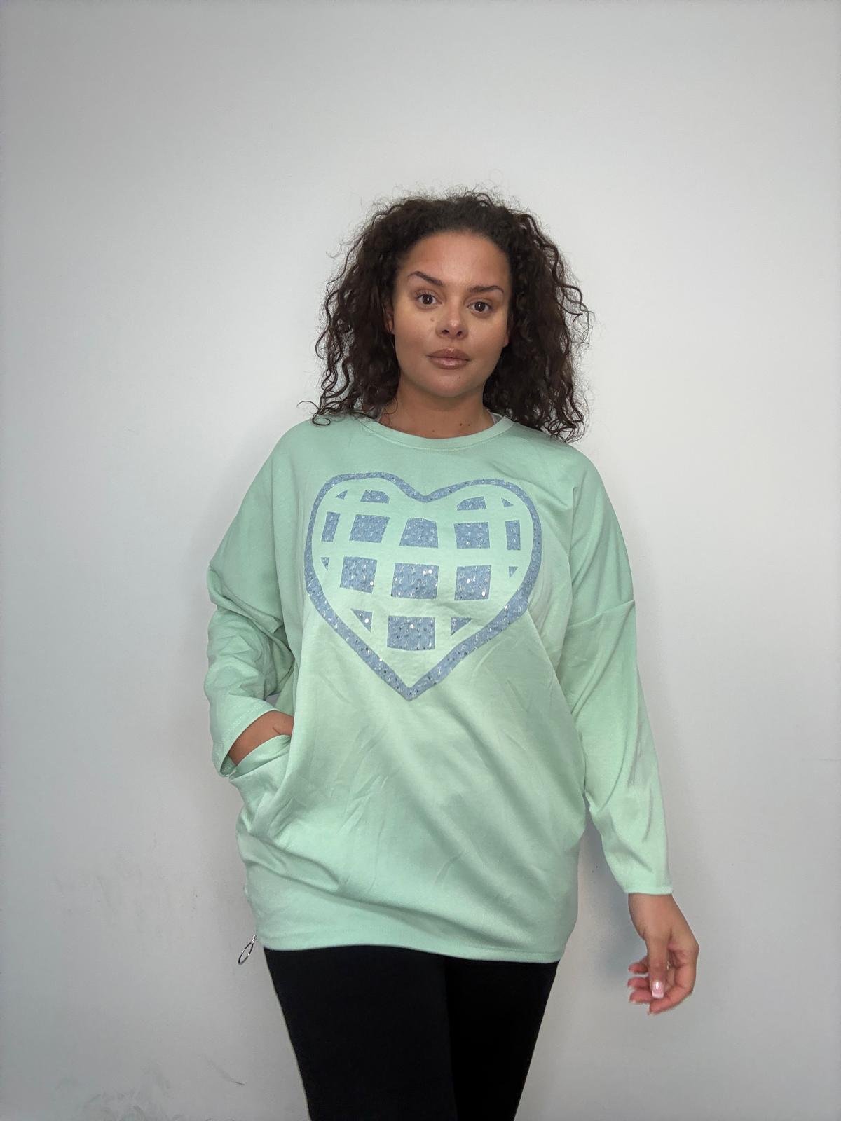 Plus Size Mint Green Heart Sequin Sweat Top with Pockets x 2, 3 & 5 Pack Options
