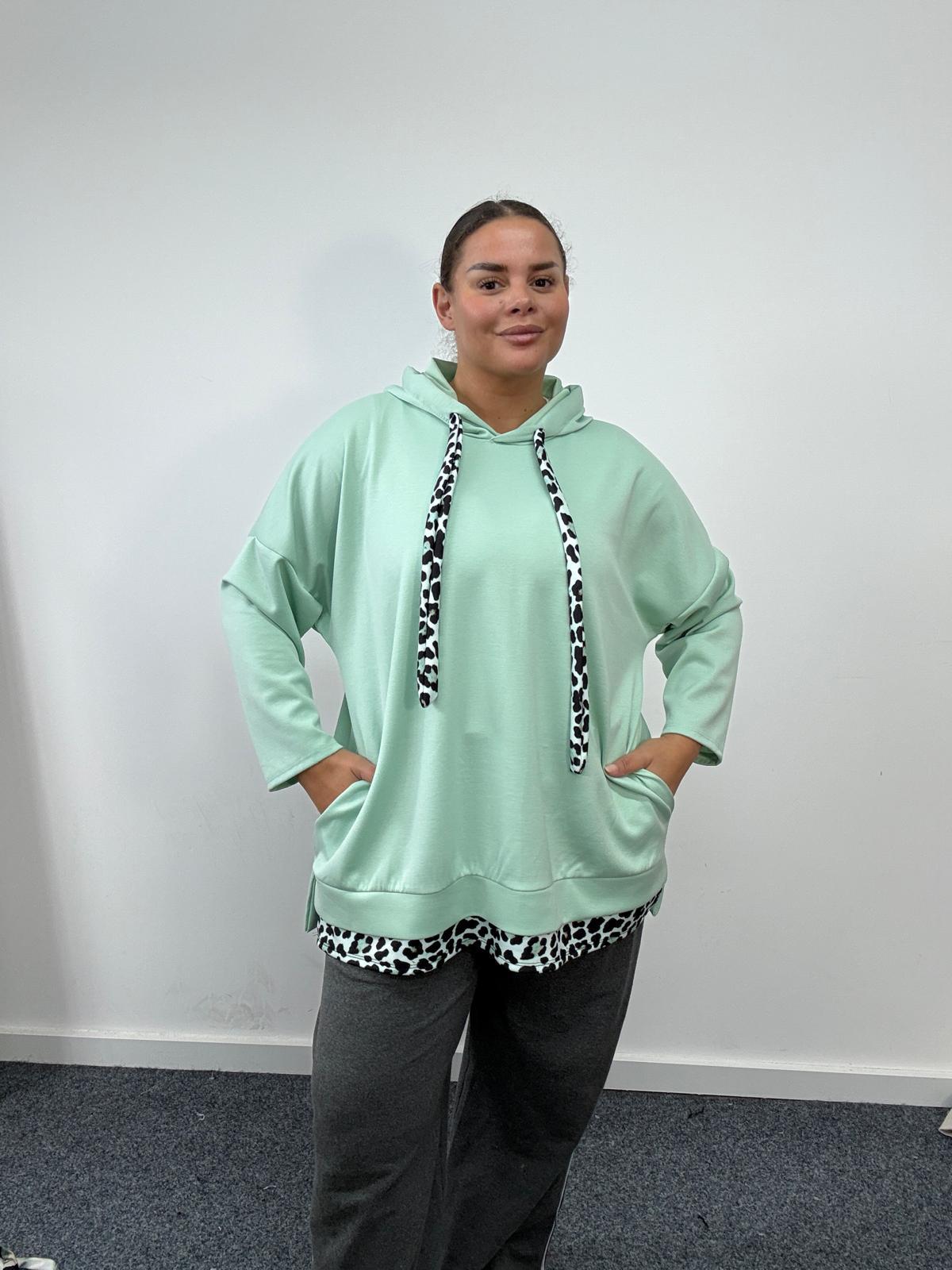 Add comfortable everyday staples to your curve collection with this plus size hooded sweatshirt featuring leopard print trim. Designed for a relaxed and flattering fit, this piece combines casual comfort with subtle statement detailing. The sweatshirt features a soft hood with contrasting leopard print drawstrings and a matching leopard print hem panel, giving the classic hoodie style a fashionable edge. The relaxed silhouette and long sleeves make it perfect for layering, while the front pockets add practicality for everyday wear. The stylish animal print accents makes this piece ideal for boutiques and online retailers looking to stock comfortable plus size casualwear with trend appeal.