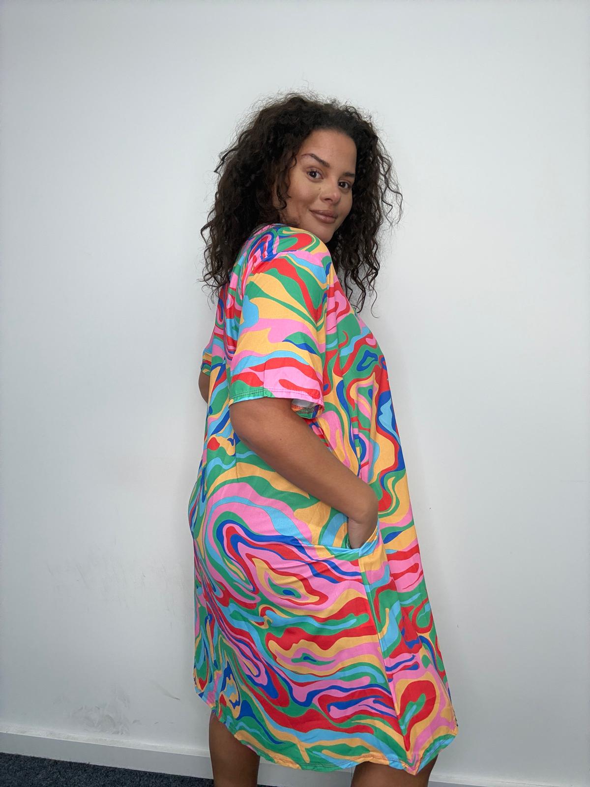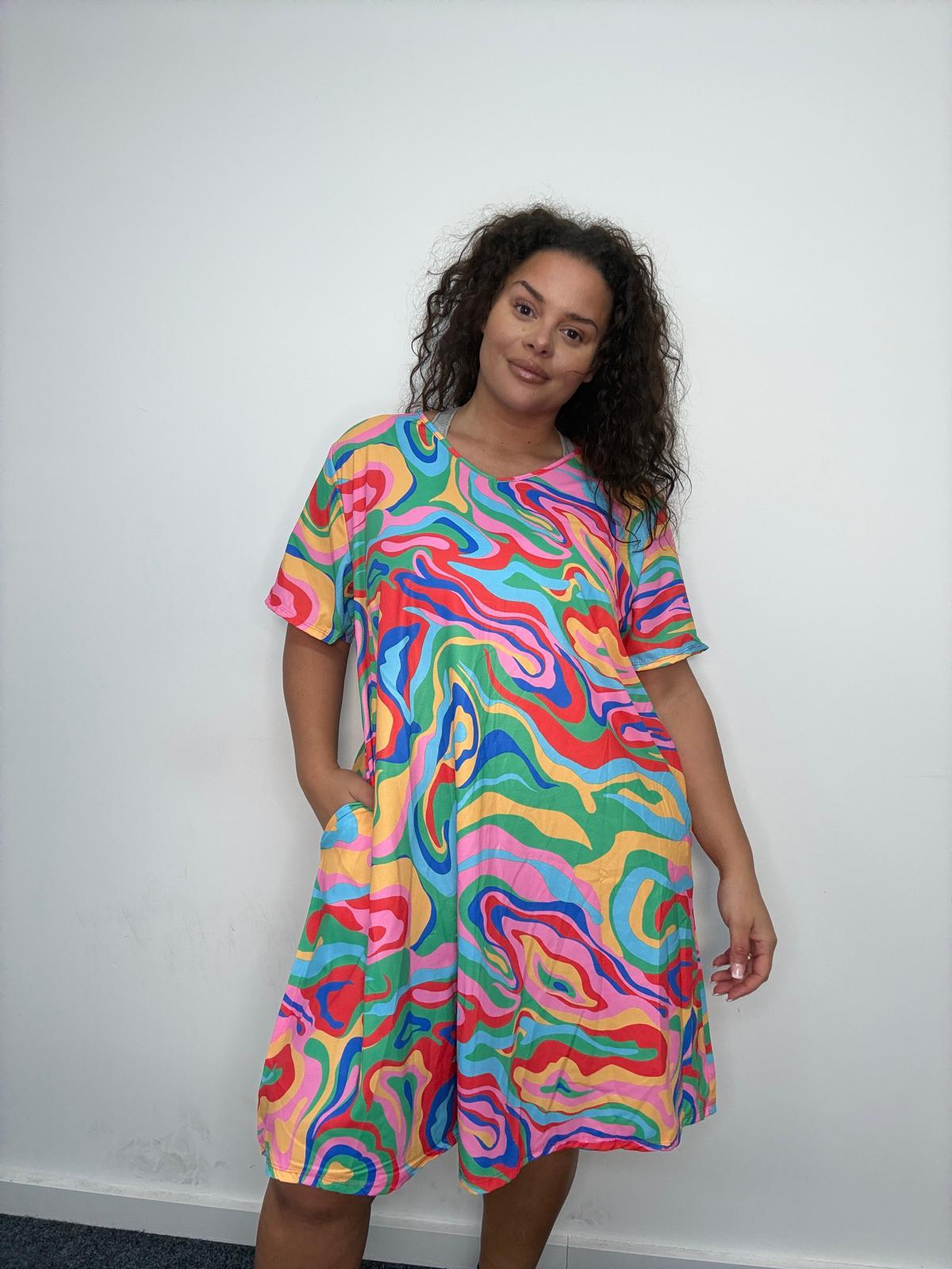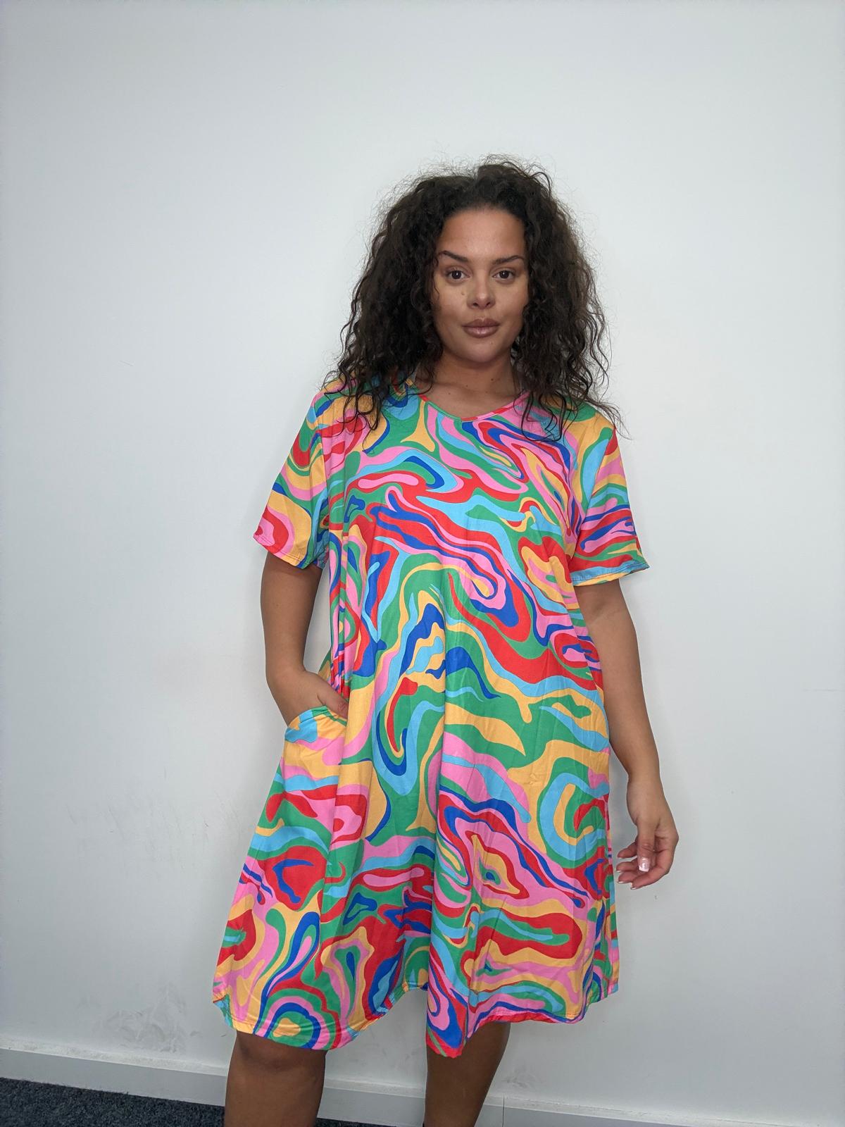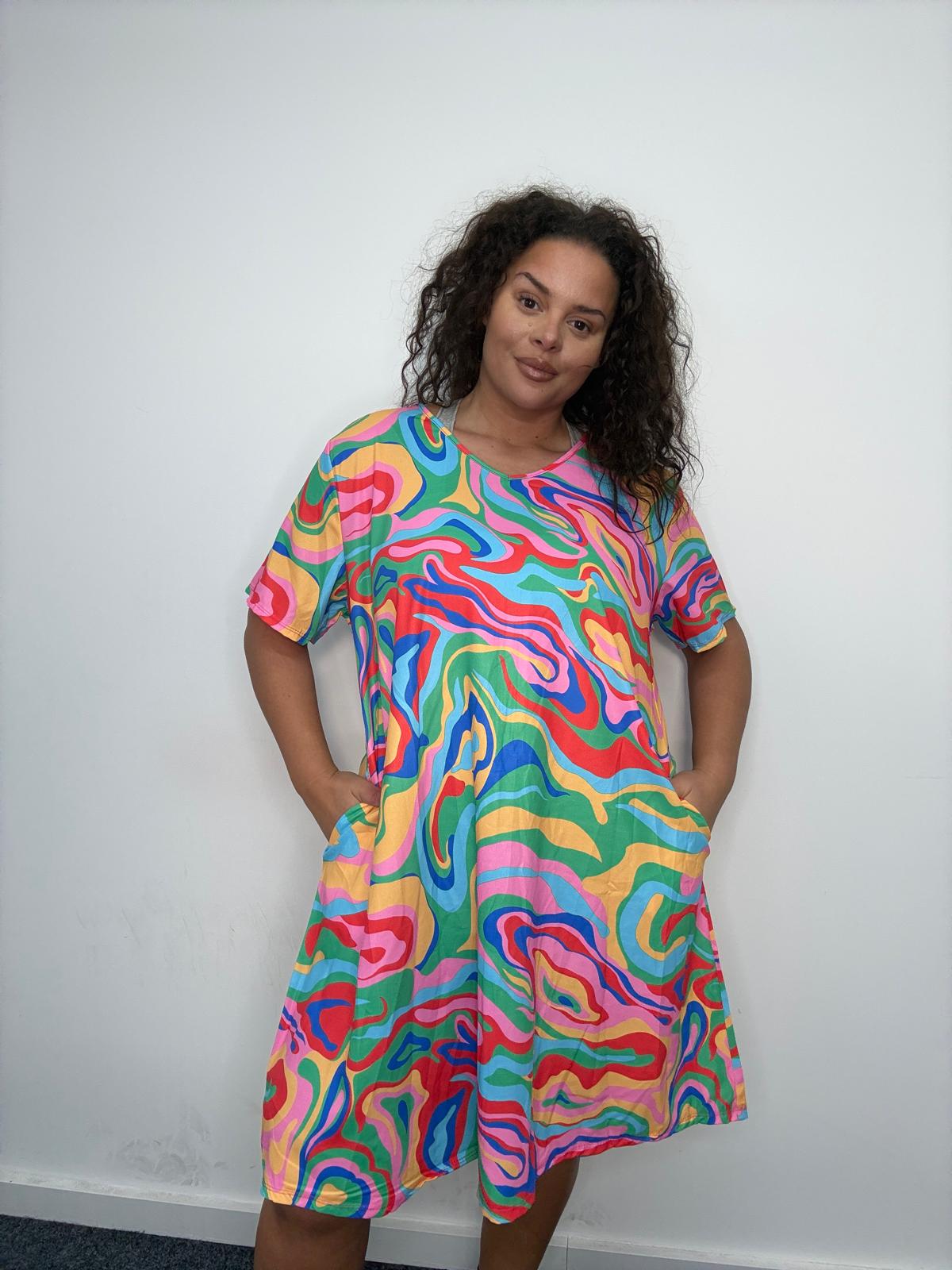 • This plus size pocket dress is a standout statement piece designed to bring colour, comfort, and strong visual impact to curve collections. Featuring a bold all-over abstract swirl print, it’s cut in a relaxed, easy-fit silhouette that flatters plus size figures while allowing effortless movement. Crafted from a soft, lightweight fabric, this style offers all-day comfort and breathability. The classic round neckline and short sleeves keep the look wearable, while practical side pockets add functionality that customers love. A high-impact yet easy-selling option for UK wholesale buyers looking to refresh their plus size dress offering with vibrant, trend-led styles.