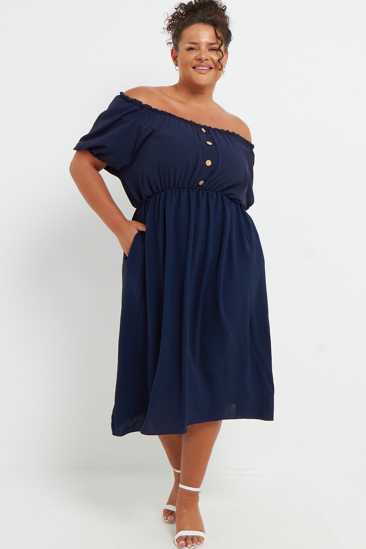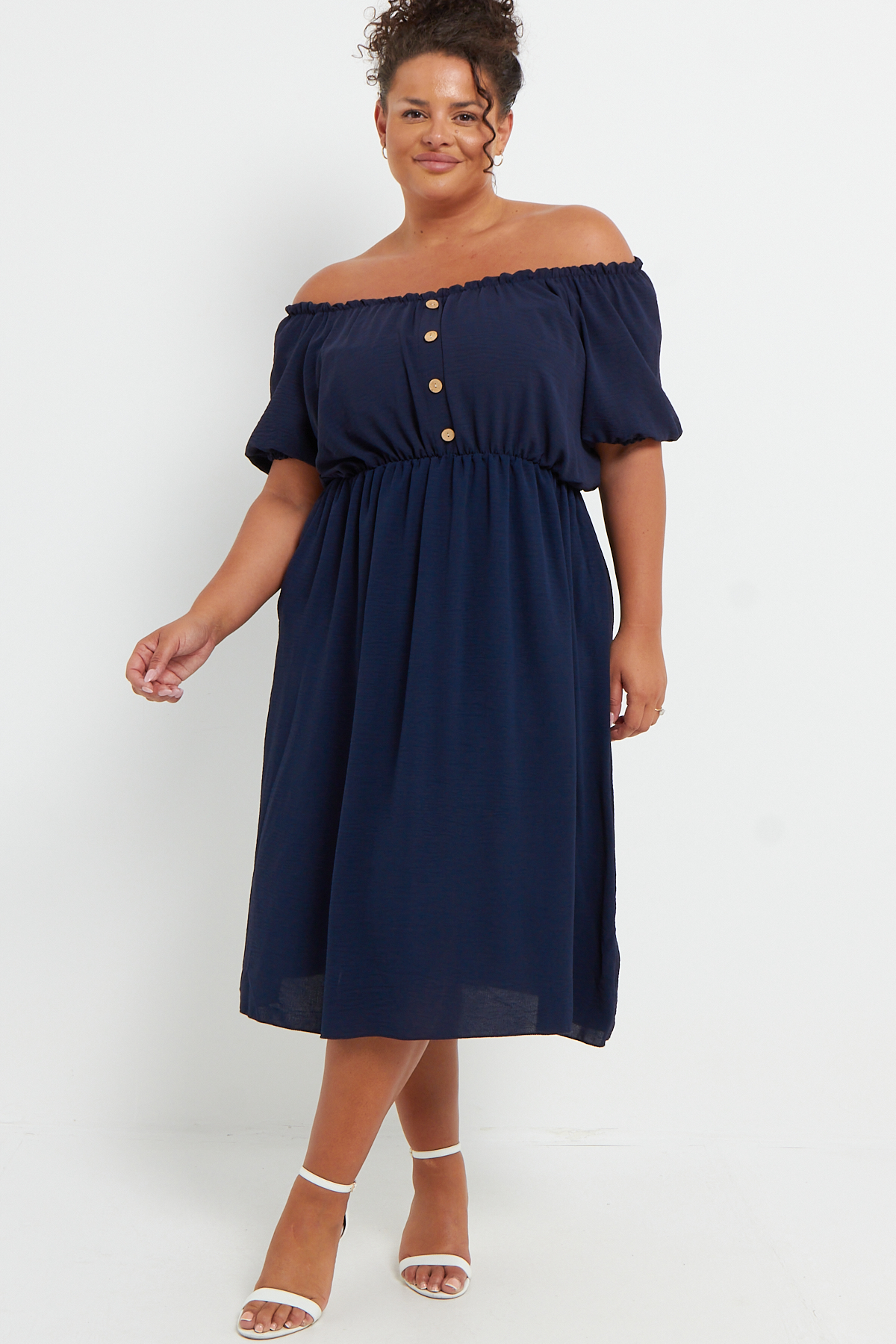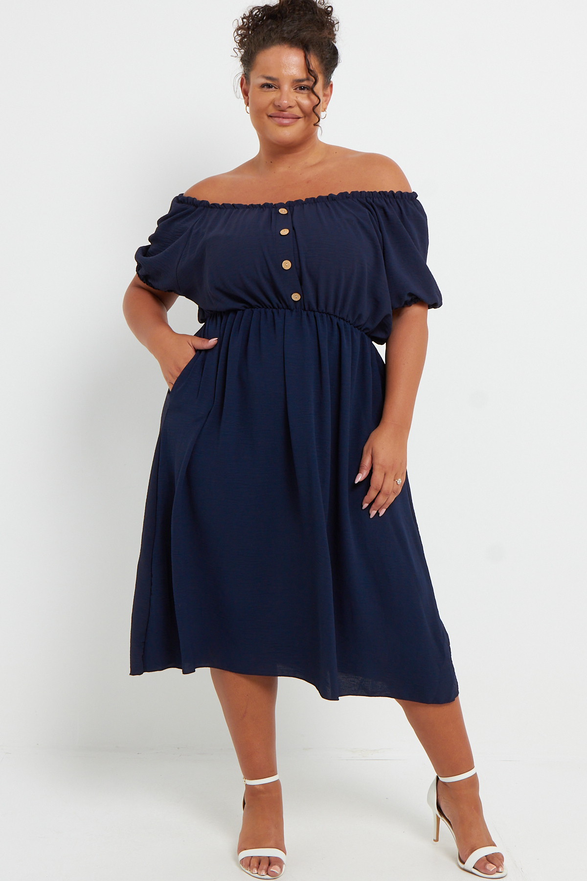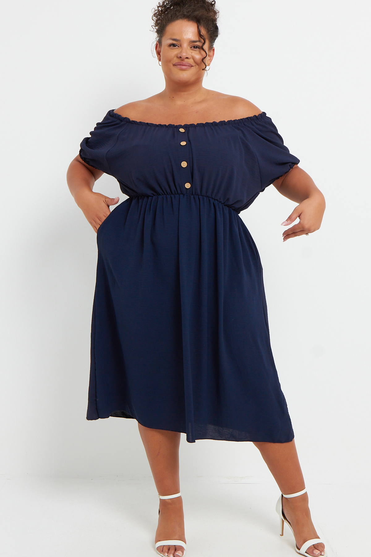 Plus Size Navy Blue Bardot Button Detail Midi Dress With Pockets x 6