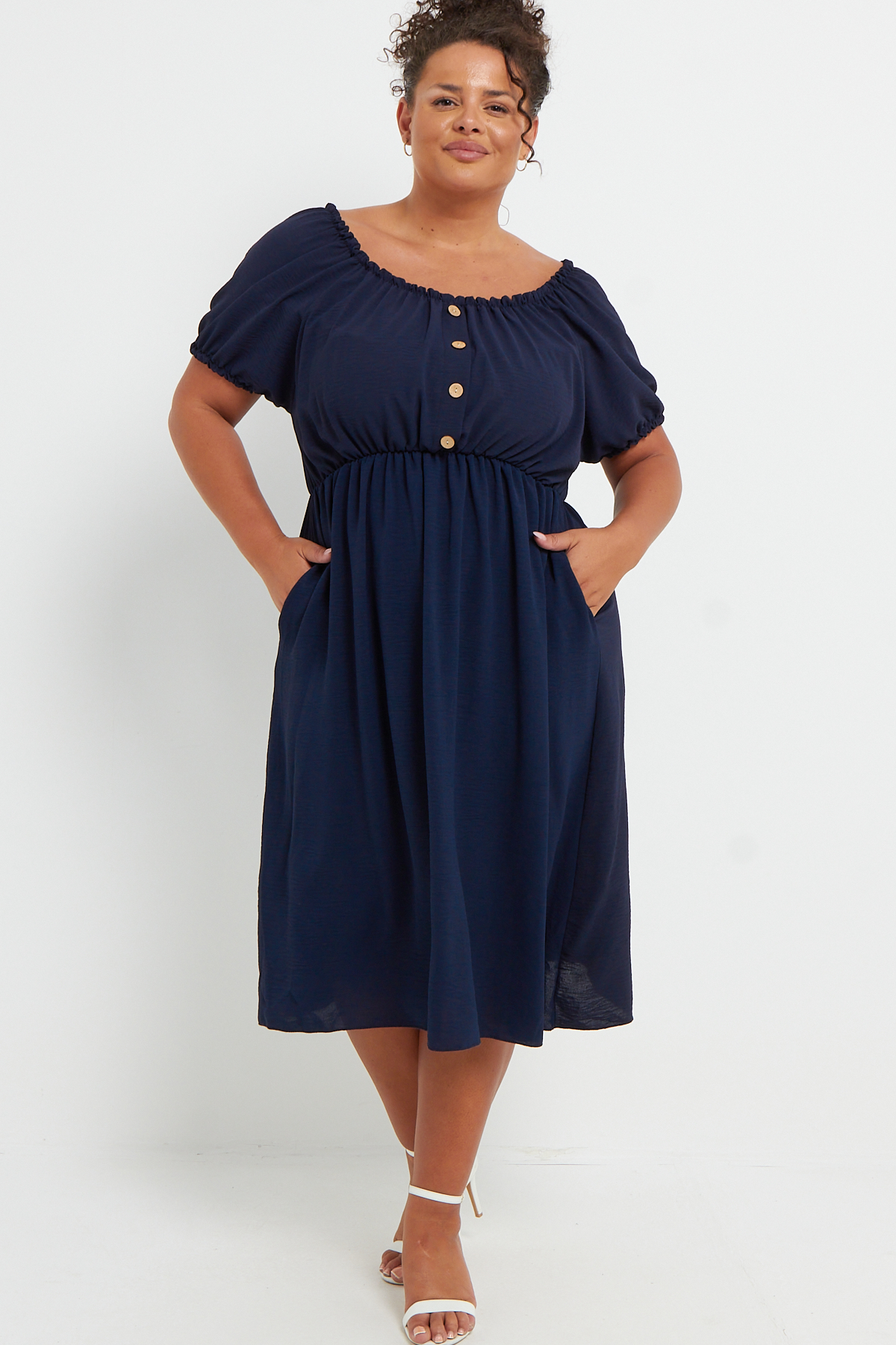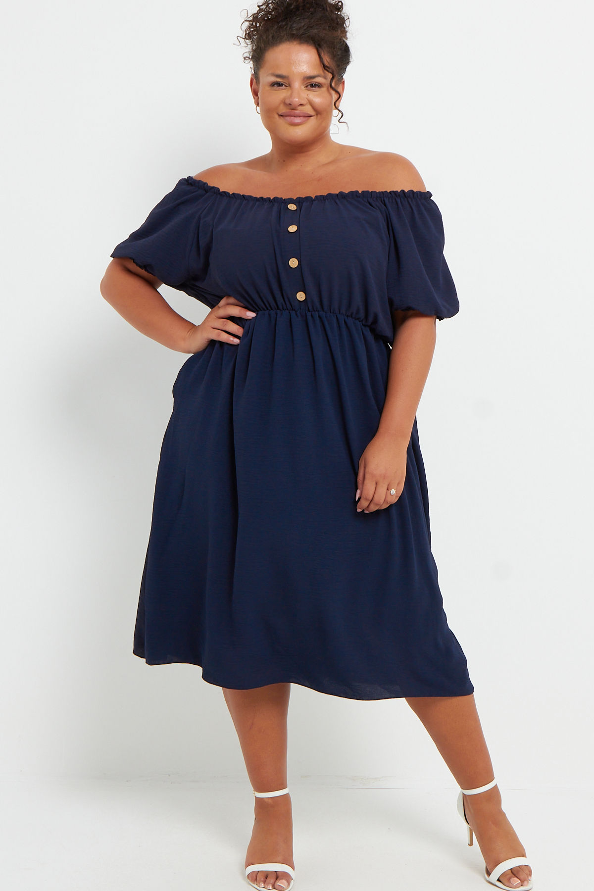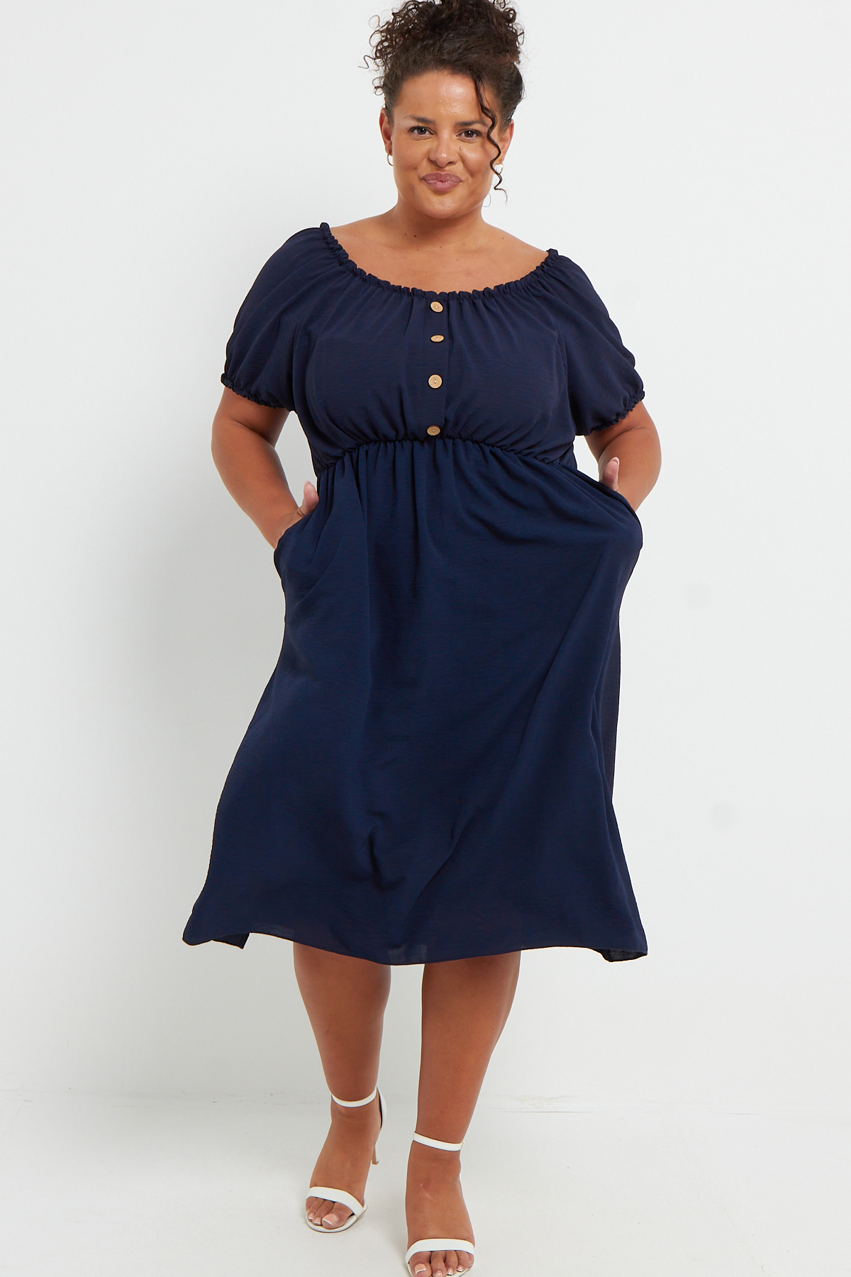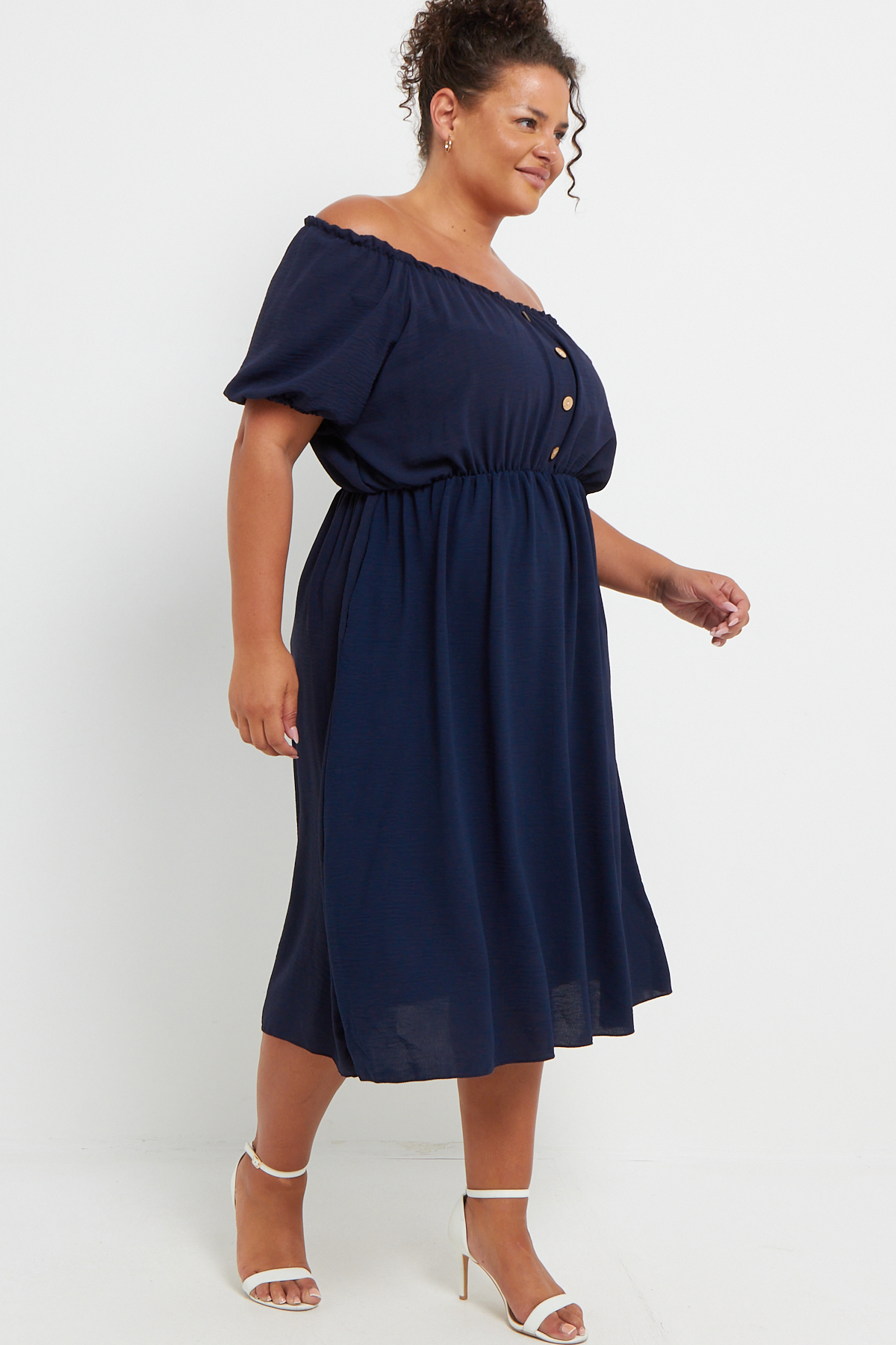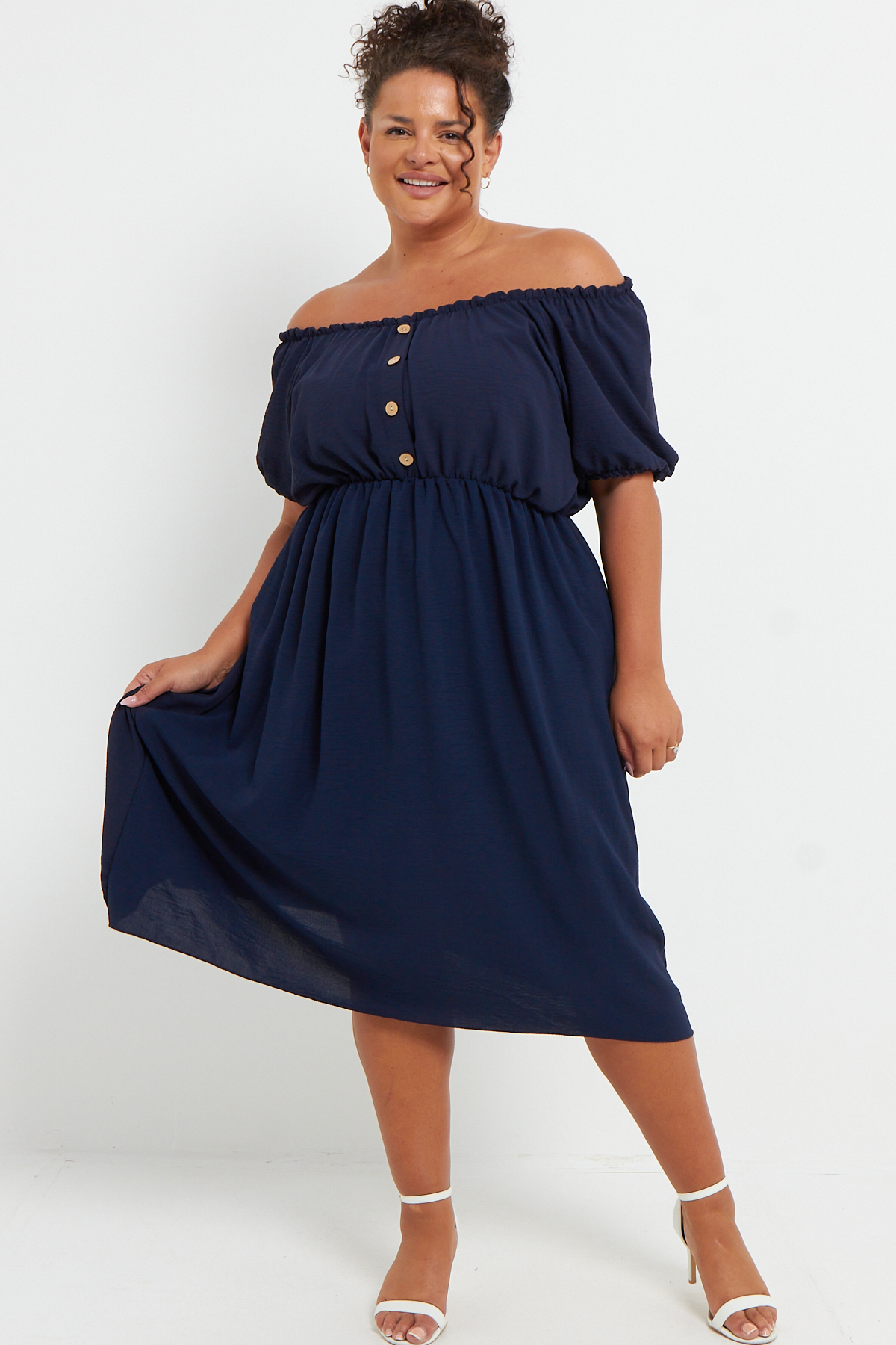 Plus Size Navy Blue Bardot Button Detail Midi Dress With Pockets x 6