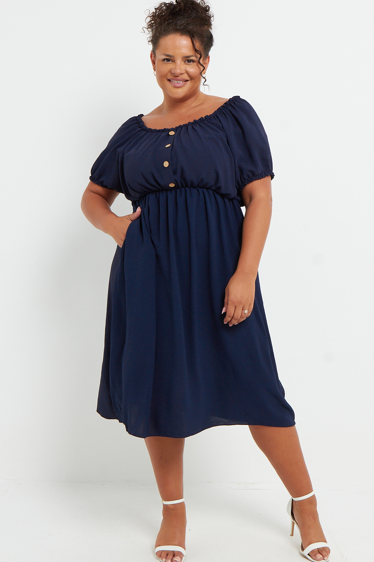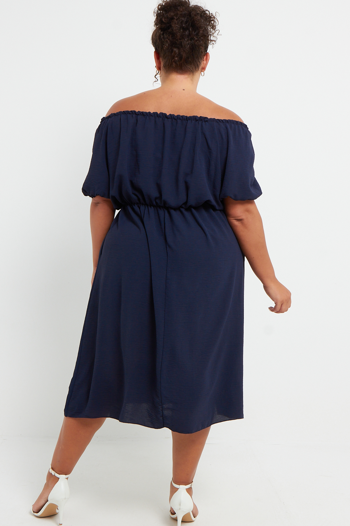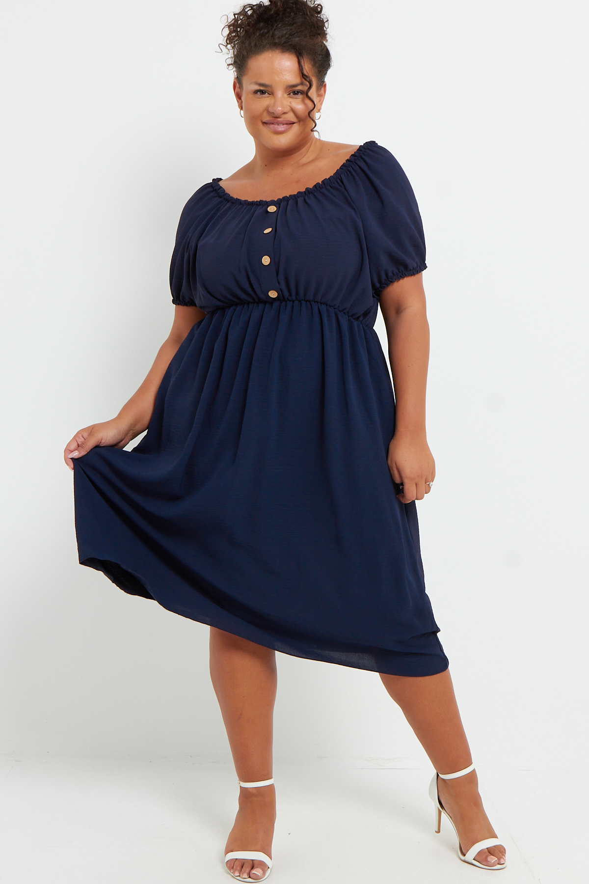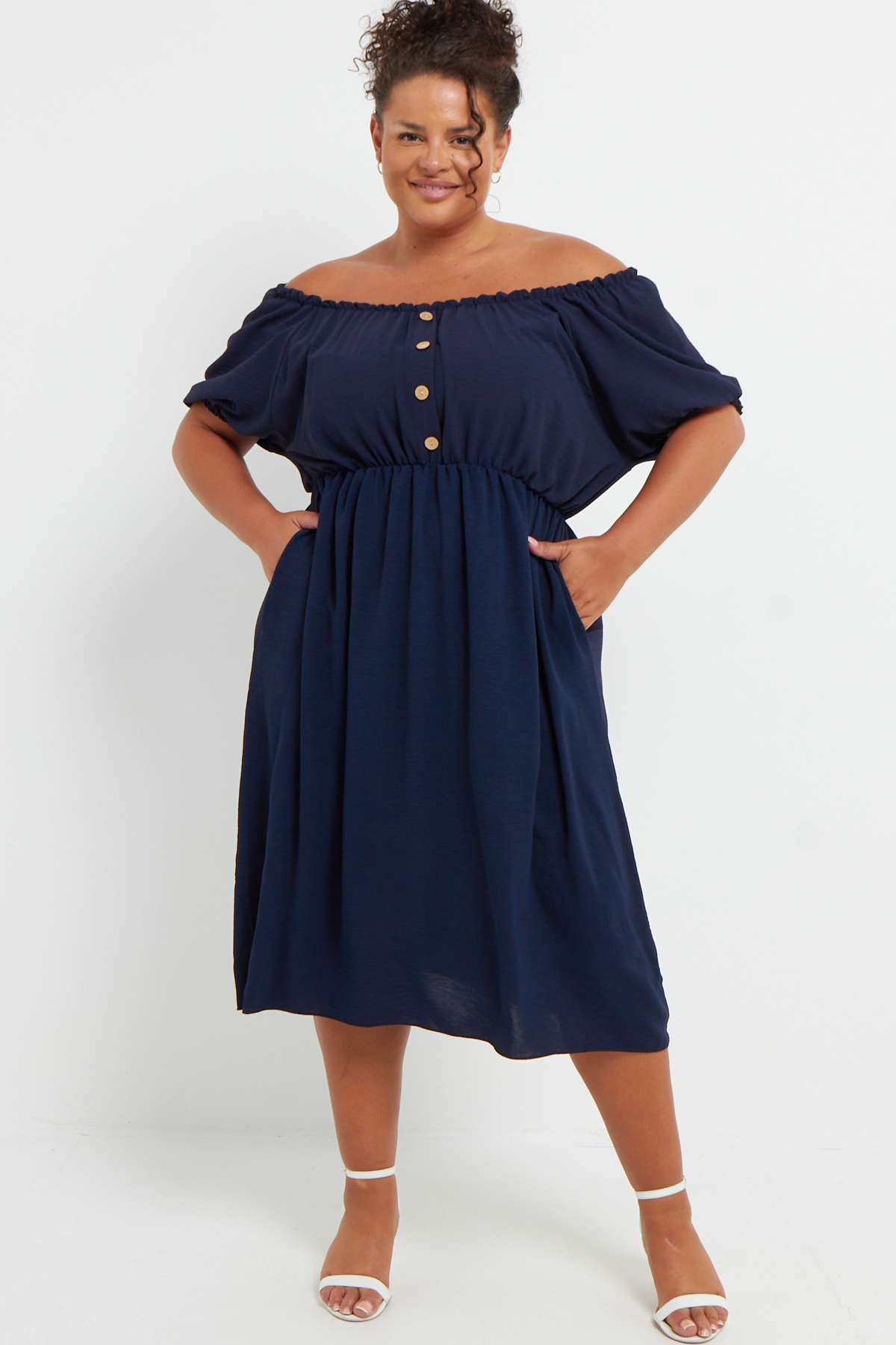 Plus Size Navy Blue Bardot Button Detail Midi Dress With Pockets x 6