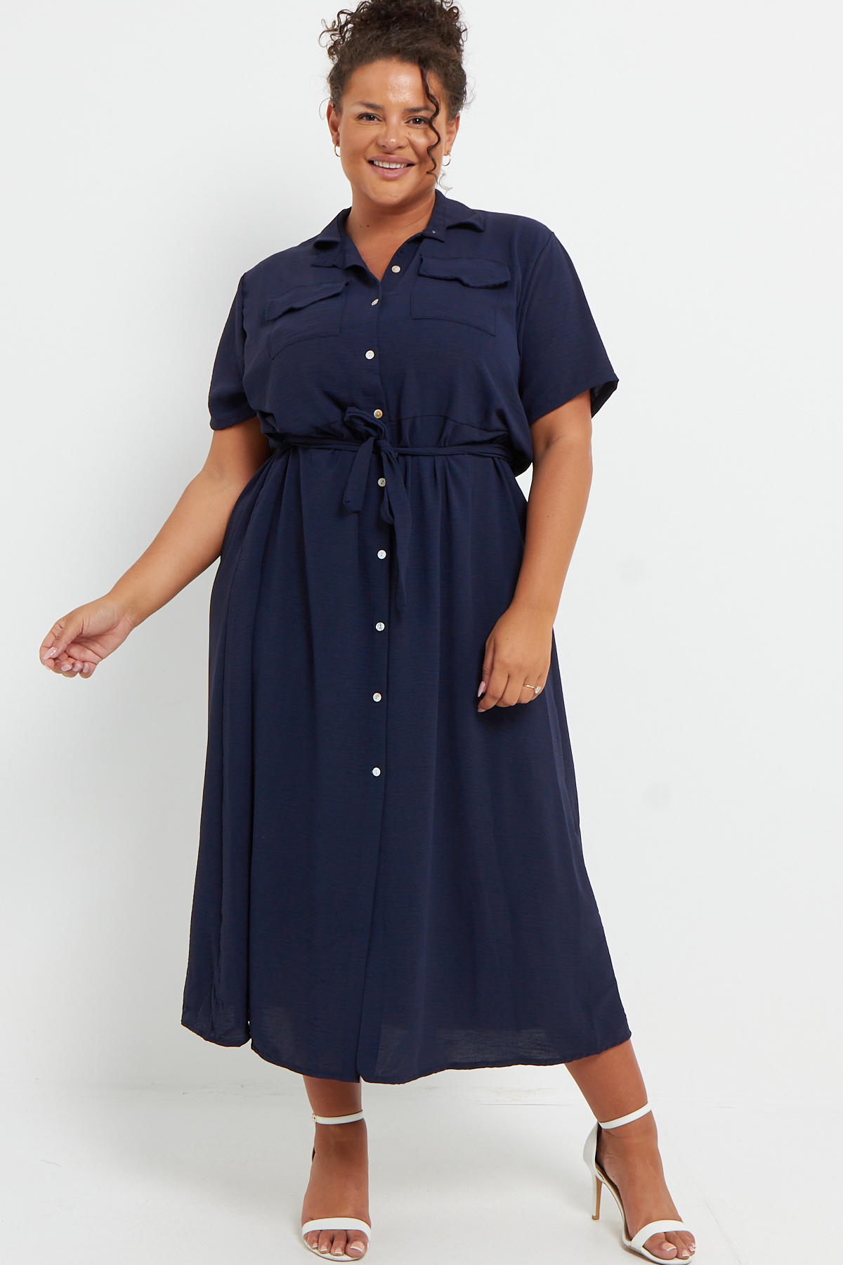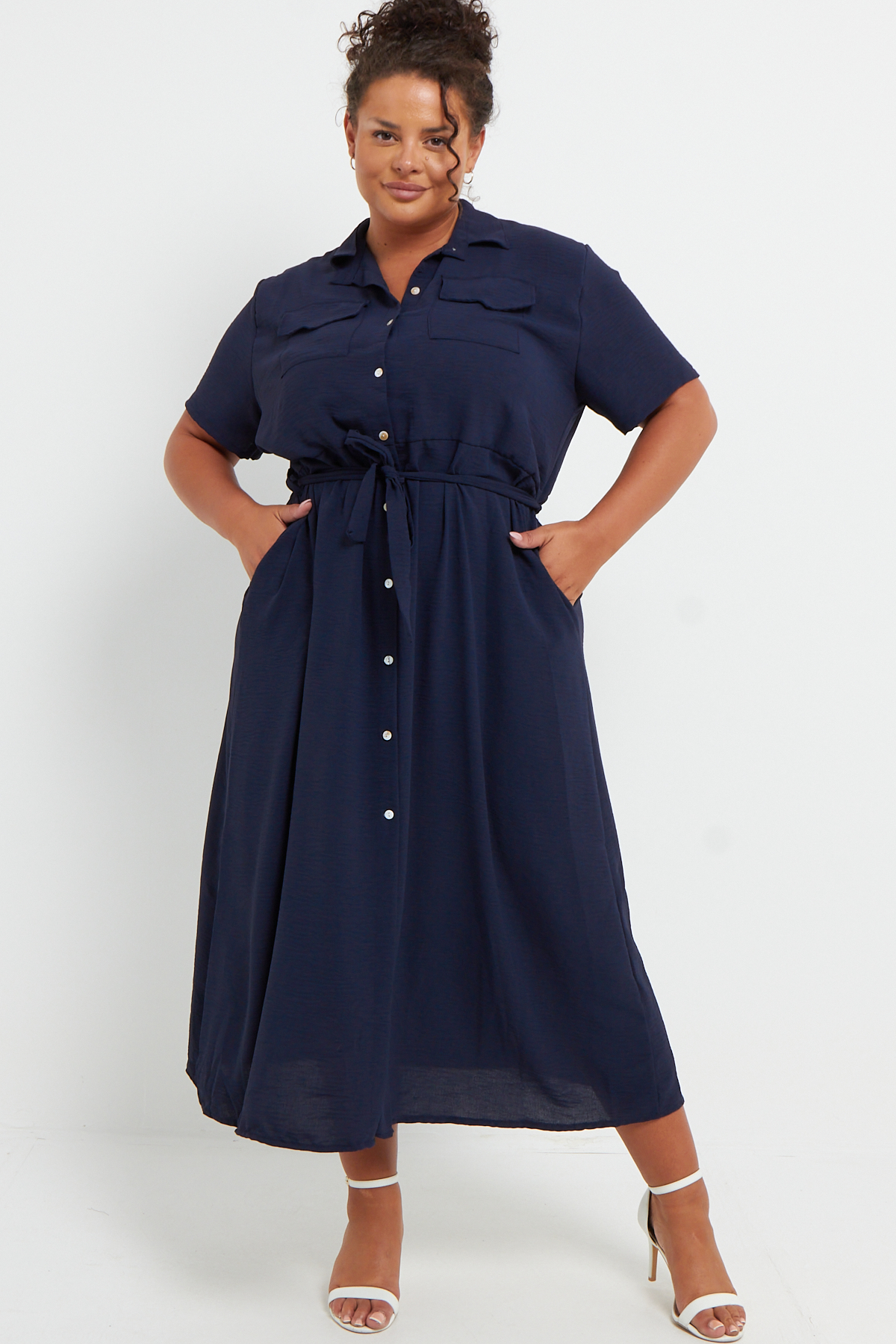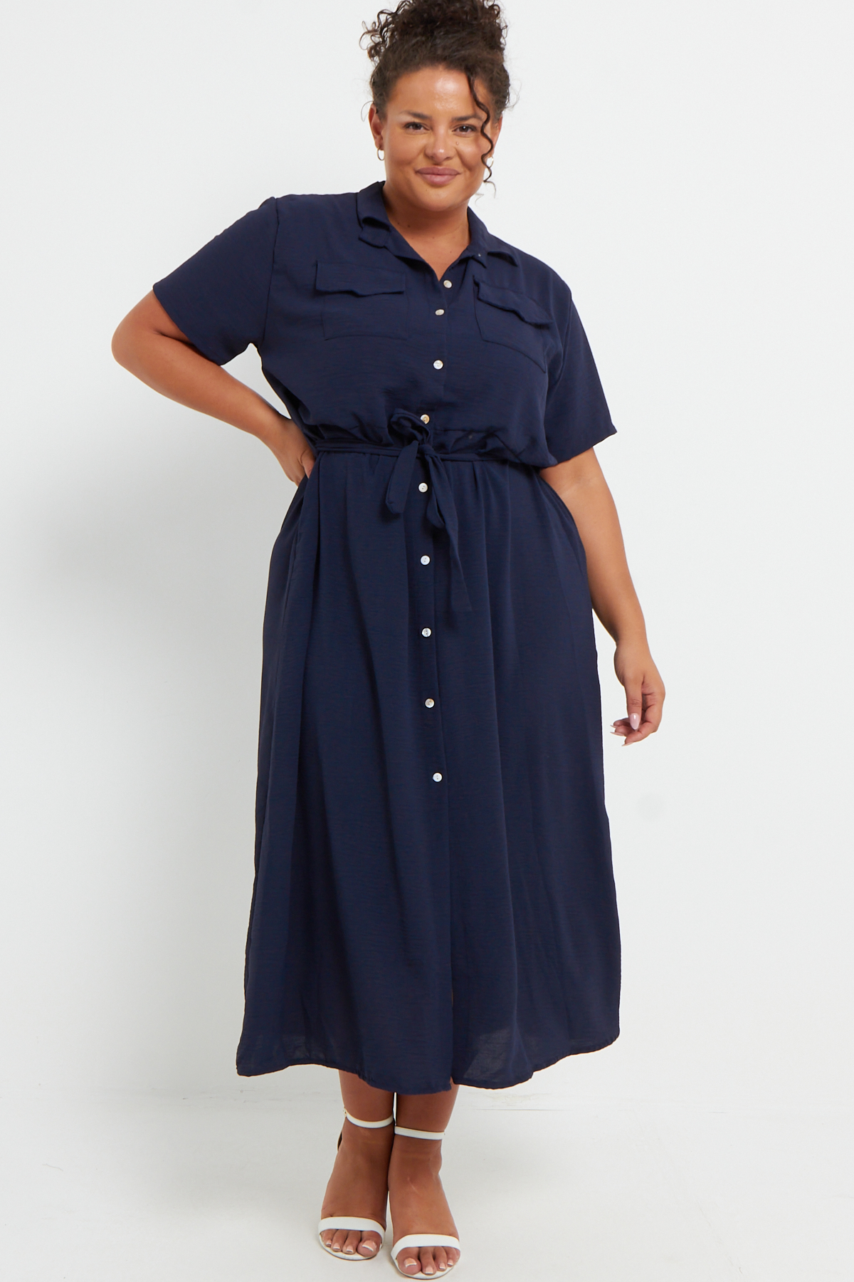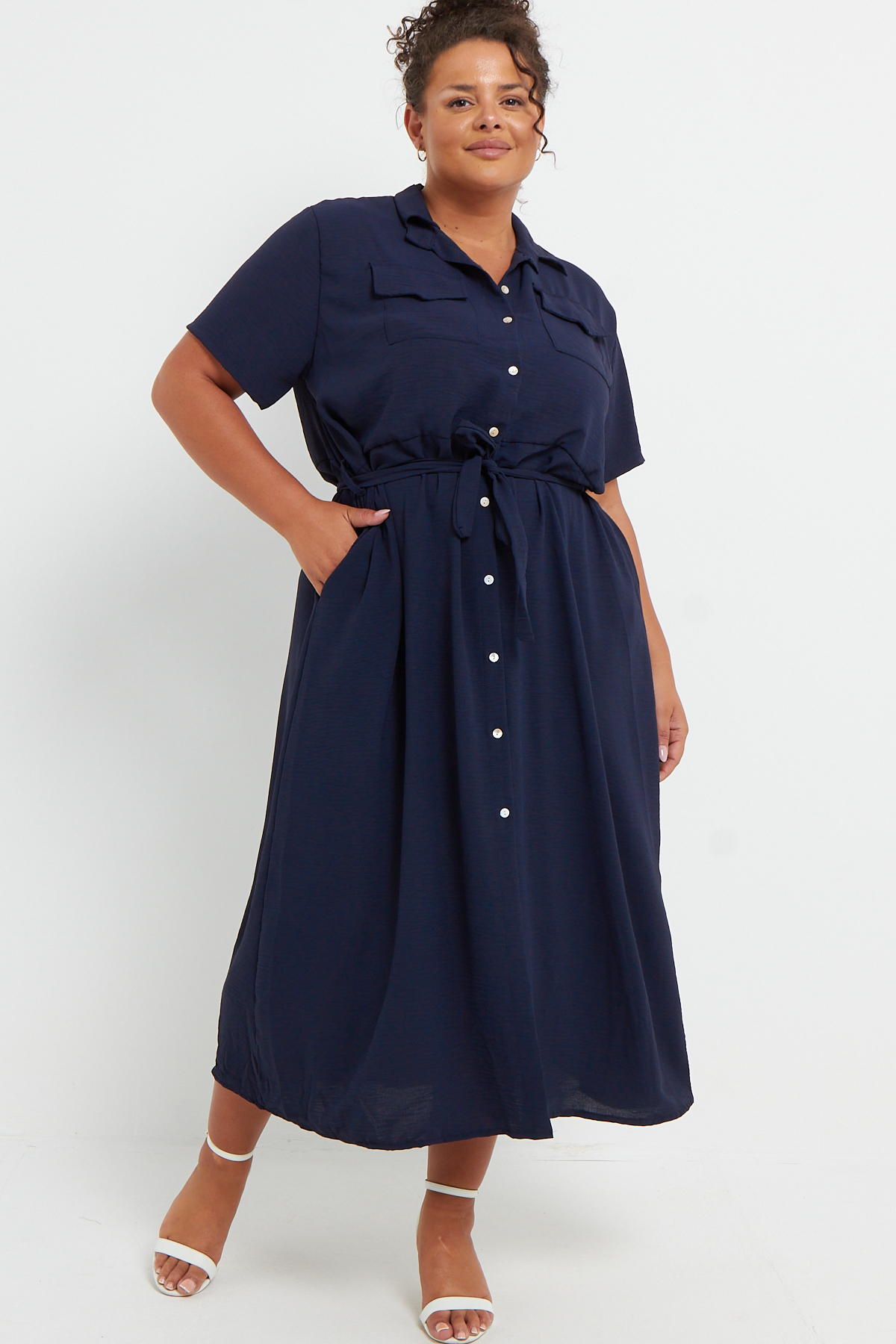 Plus Size Navy Blue Button Through Tie Waist Shirt Midi Dress With Pockets x 6