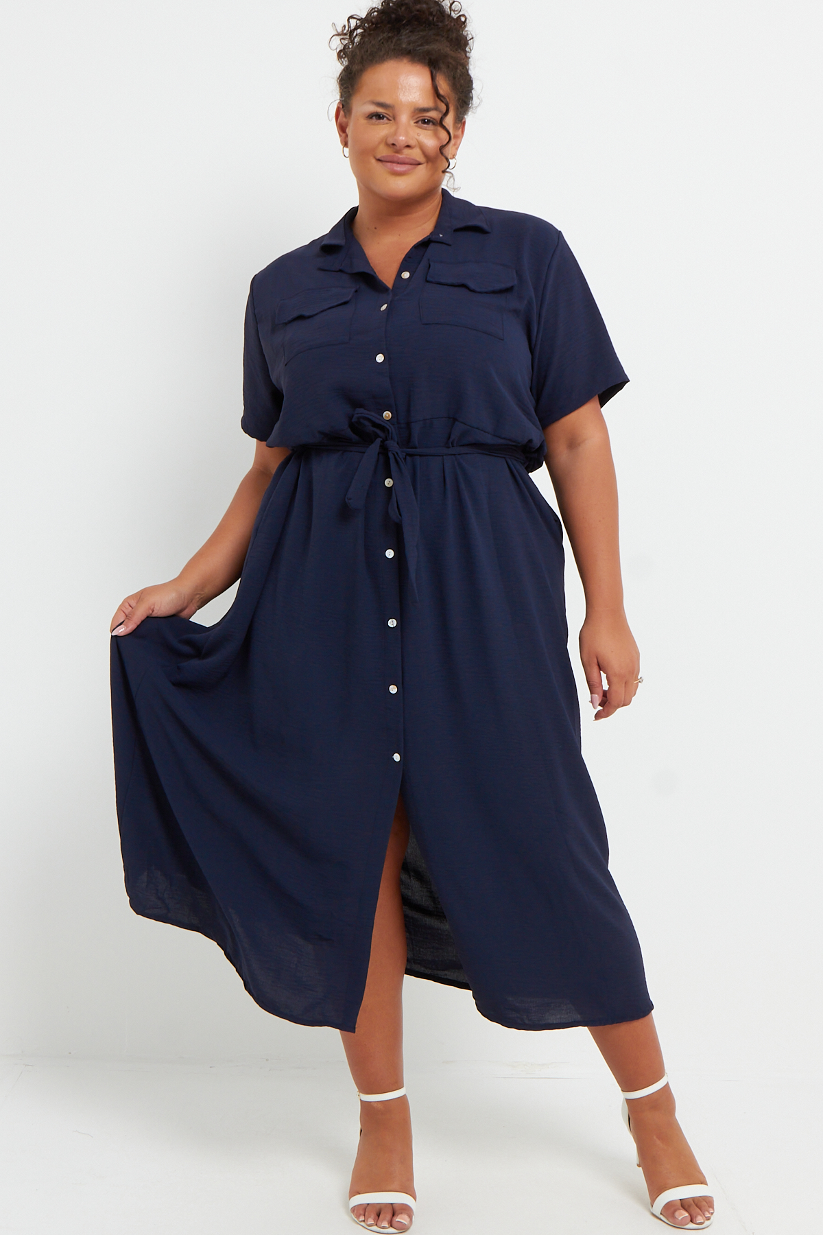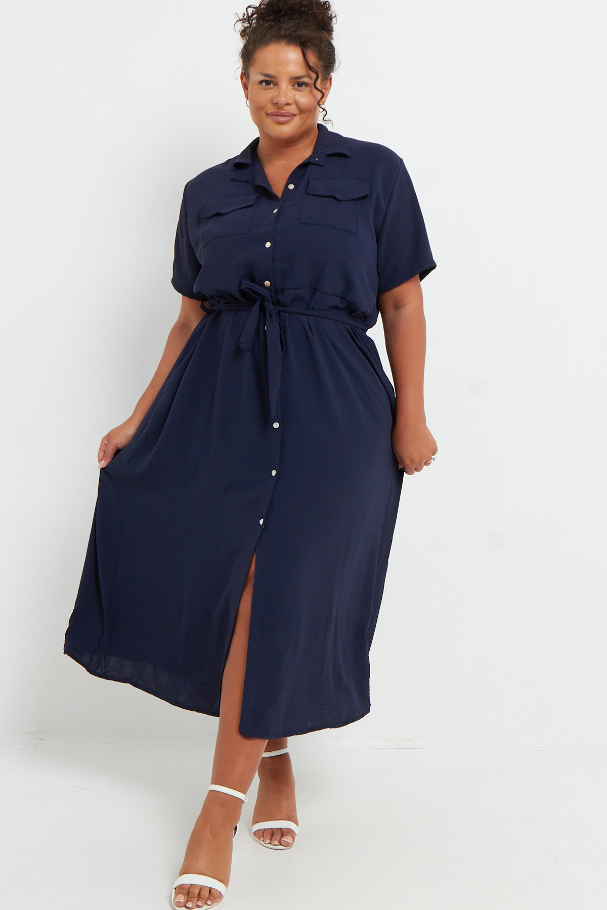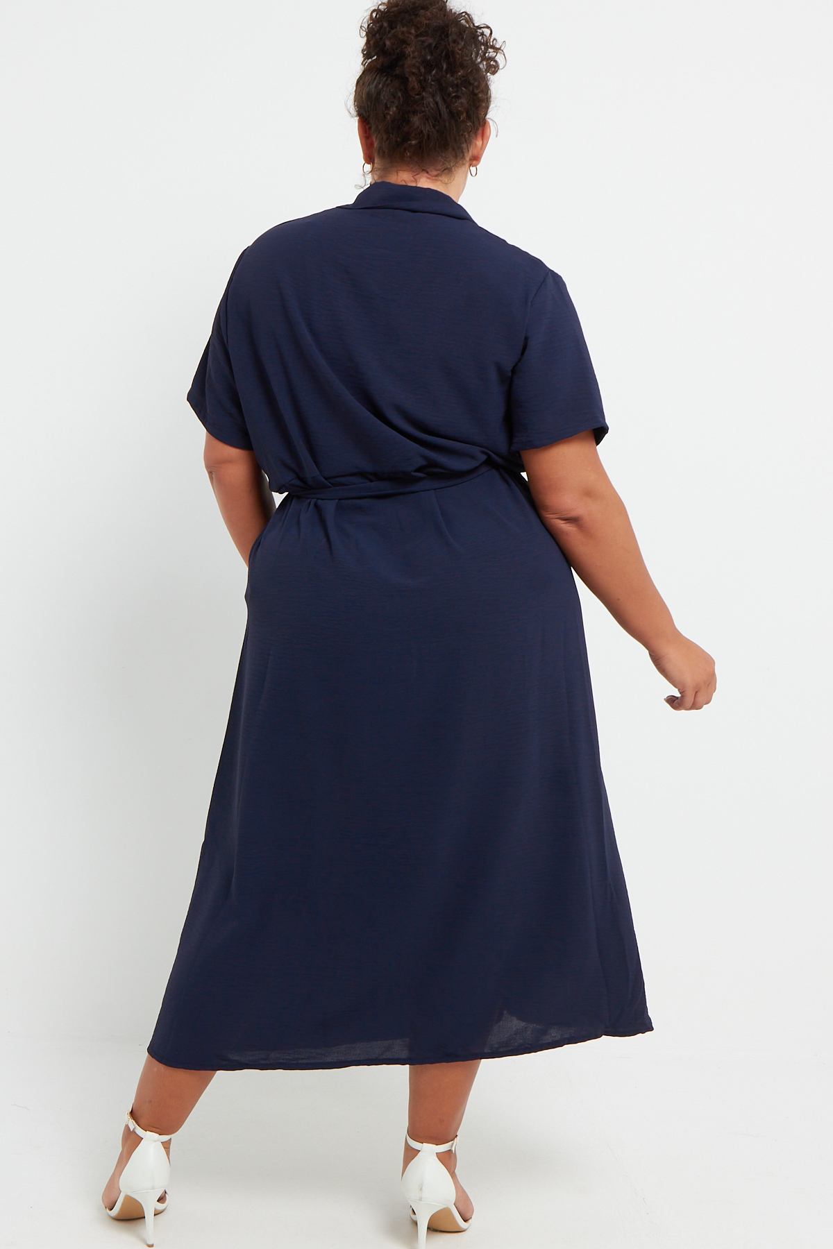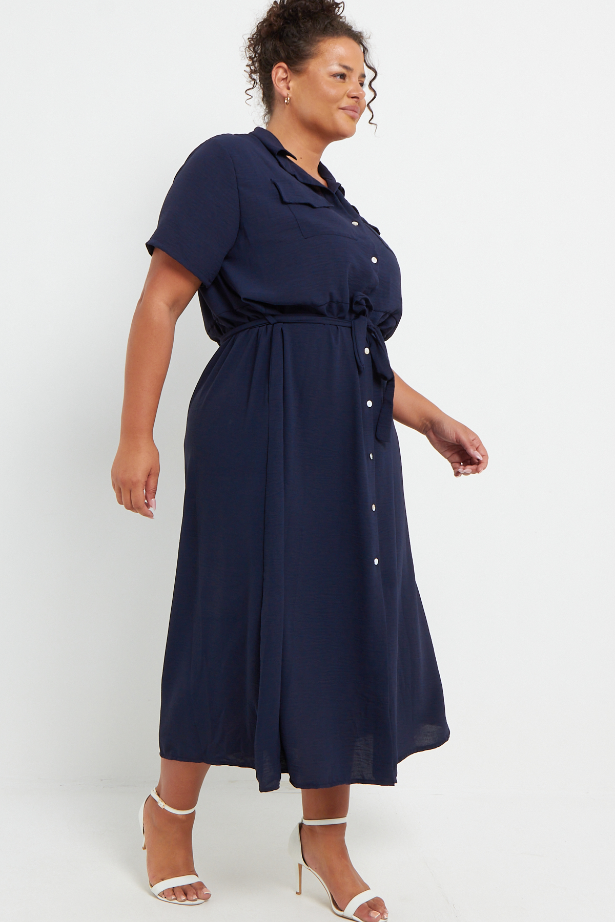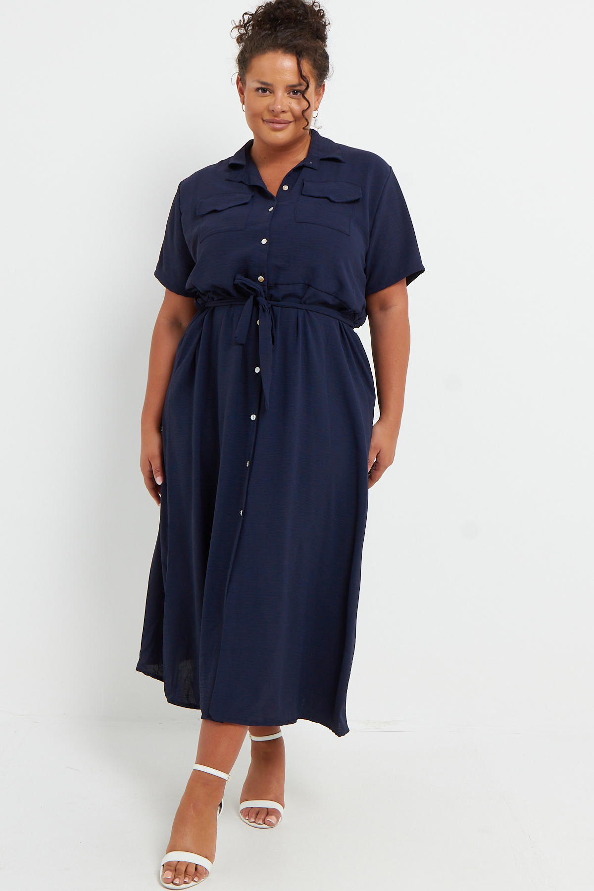 Plus Size Navy Blue Button Through Tie Waist Shirt Midi Dress With Pockets x 6