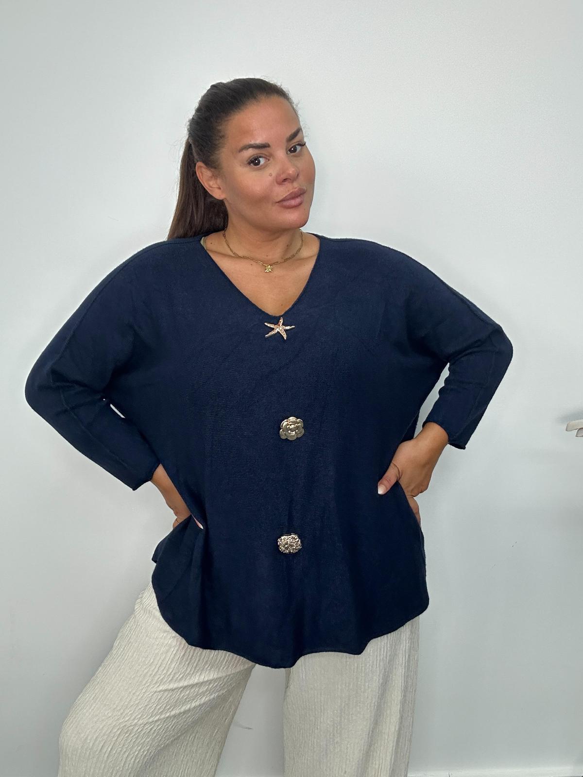 This Plus Size V-Neck Top is a chic yet comfortable addition to any plus size wardrobe. It features three statement metallic buttons that add a touch of elegance. The relaxed fit and soft fabric ensure comfort, while the long sleeves make it a versatile piece for everyday wear or layering. Wholesale buyers will appreciate its stylish design, quality finish, and broad appeal in the curve fashion market.