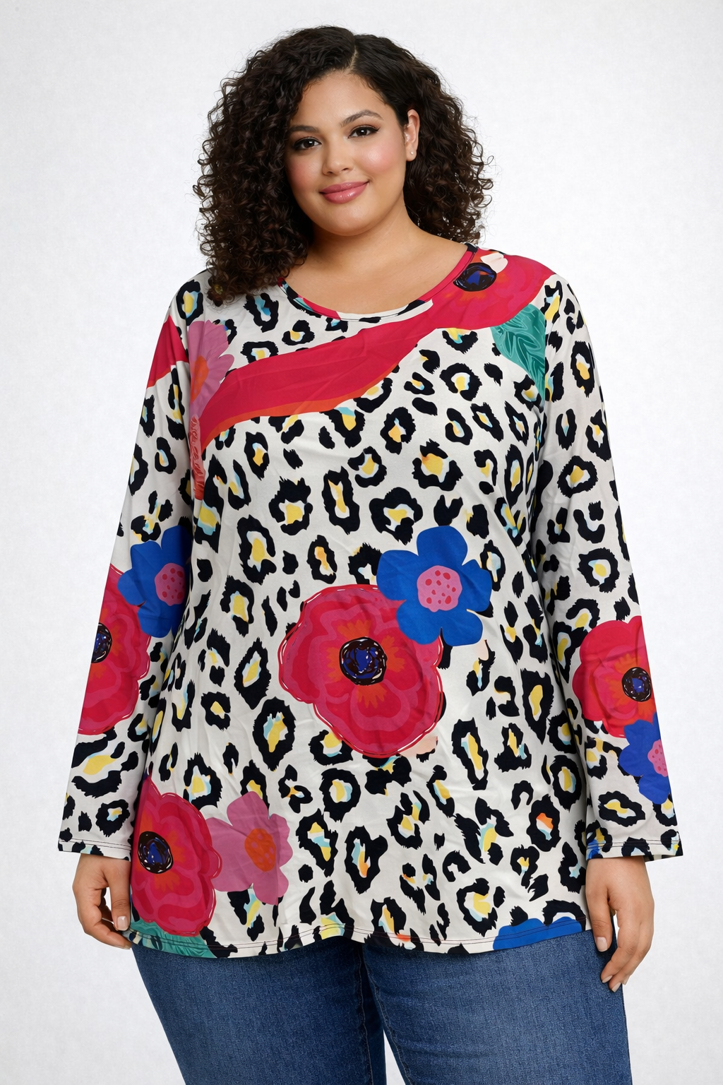 • Bring bold personality to your curve collection with this plus size leopard and floral print tunic top. Designed for customers who love standout prints, this eye-catching style combines classic animal print with vibrant floral accents for a fresh, fashion-forward look. The relaxed tunic silhouette offers comfortable coverage while maintaining a flattering drape over curves. Crafted from soft stretch fabric, it’s ideal for everyday wear and easy layering across seasons. The long sleeves and round neckline add a versatile finish, making this piece perfect for casual styling with denim or smart-casual separates. A strong visual piece for UK wholesale buyers, this colourful printed top is ideal for boutiques and online retailers looking to expand their plus size statement print ranges.