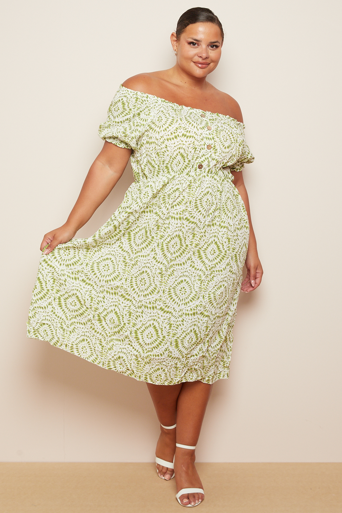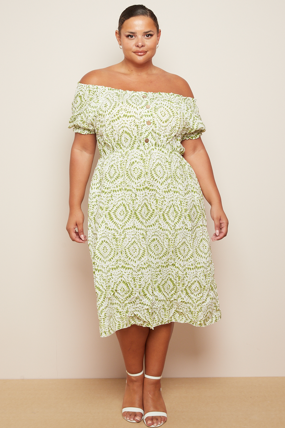 Plus Size Olive Printed Bardot Button Through Top Midi Dress With Pockets x 5
