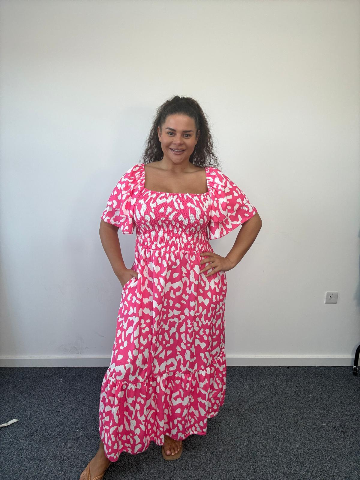 Plus Size Pink Animal Print Shirred Frill Hem Midi Dress with Pockets x 2, 3 & 5 Pack Options